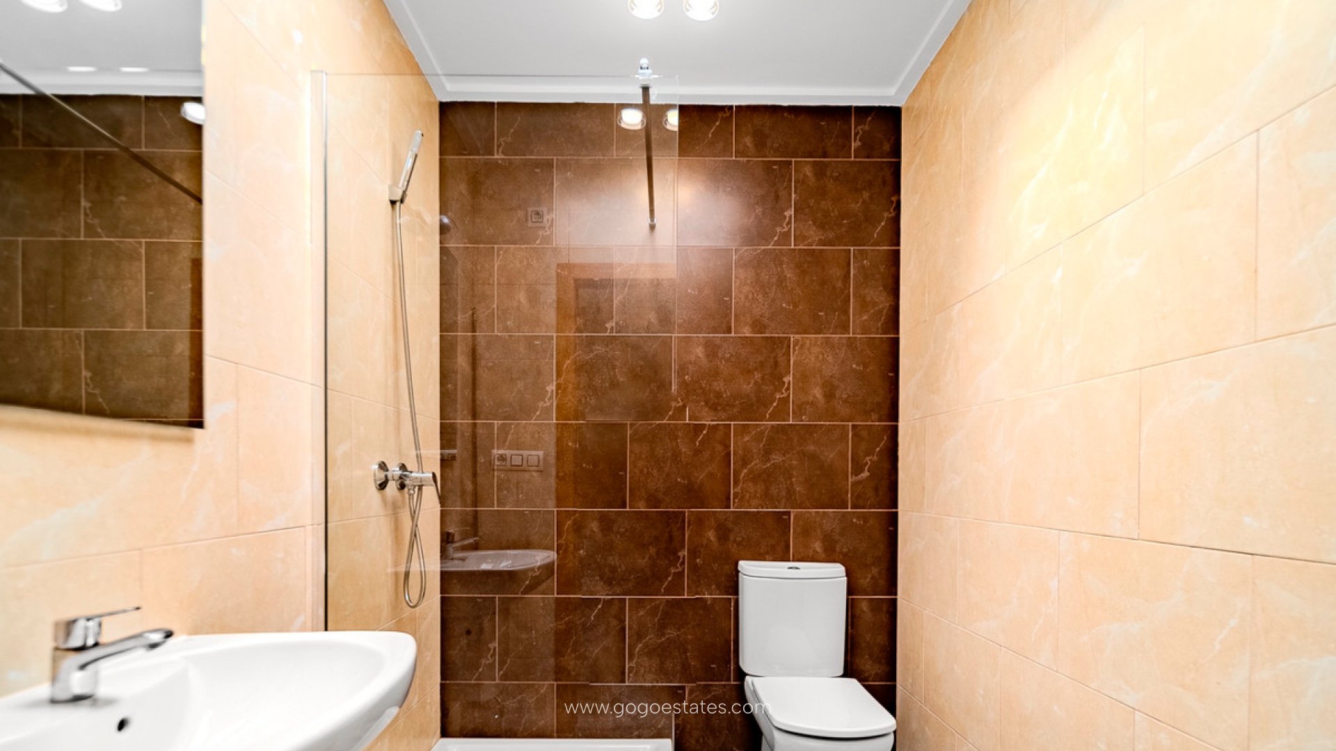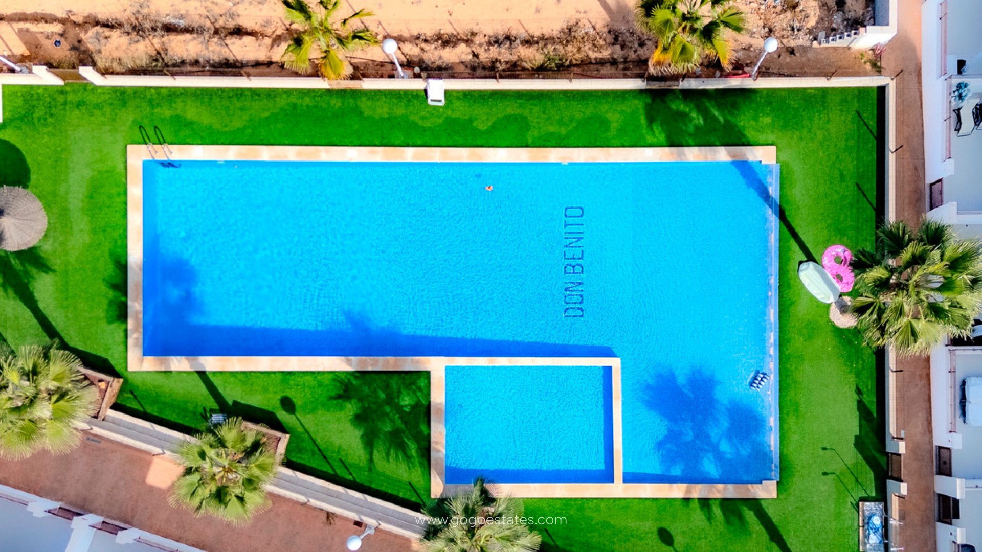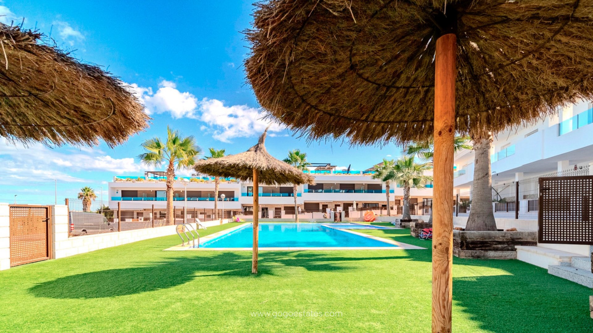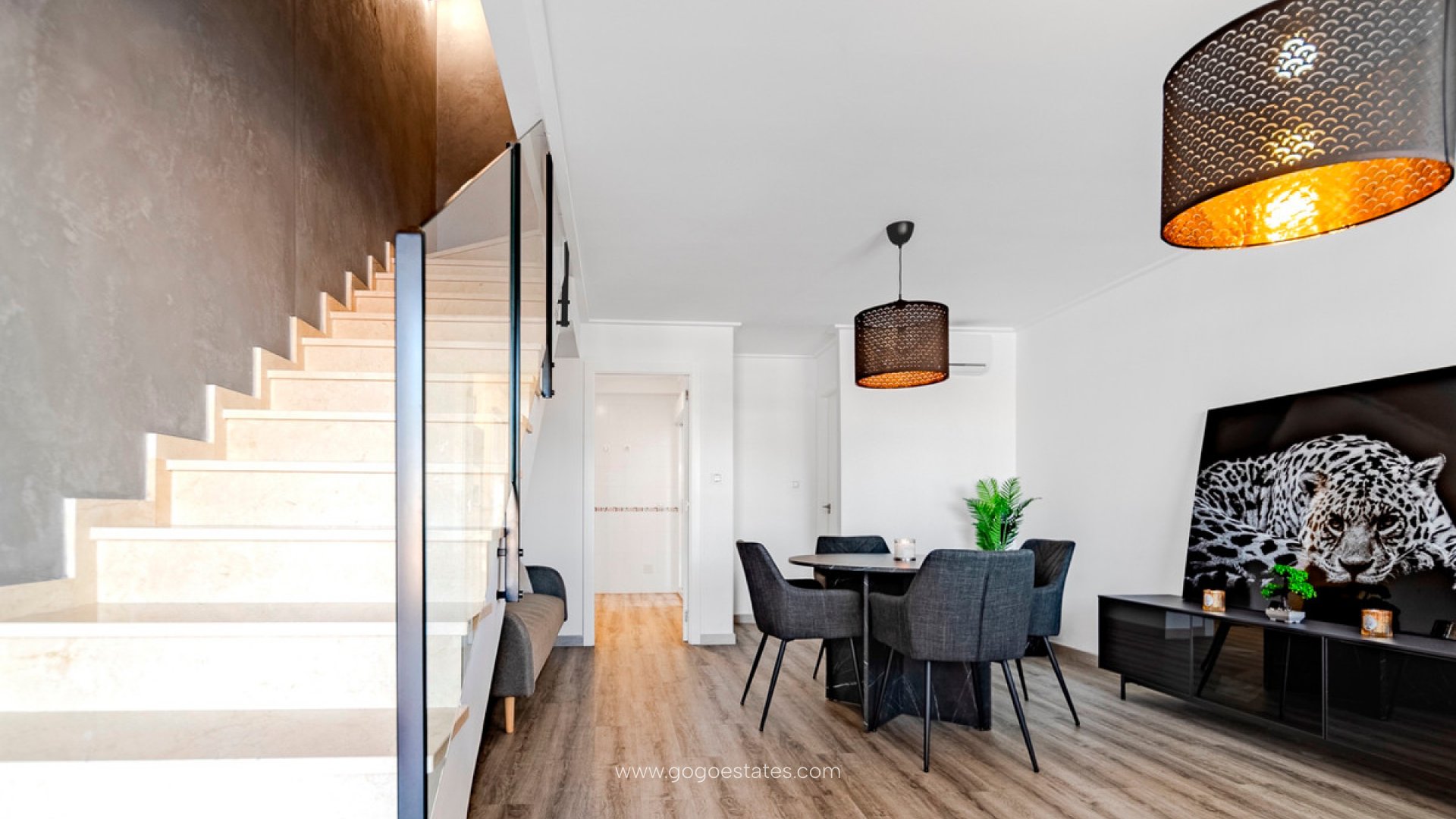 Deze eengezinswoning bevindt zich in de wijk Los Balcones in Torrevieja, binnen het residentiële complex Los Altos de la Laguna. De woning biedt uitzicht op het Roze Meer en heeft een functionele indeling. Het huis is een duplex met twee verdiepingen die verbonden zijn via een interne trap. Het heeft een totale bebouwde oppervlakte van ongeveer 74,69 m², met een bruikbare binnenruimte van circa 69,69 m². De indeling omvat meerdere kamers en een veranda. De keuken is separaat en volledig uitgerust met moderne apparatuur. Er zijn drie slaapkamers met ingebouwde kasten, waarvan één toegang heeft tot een balkon met uitzicht op het gemeenschappelijk zwembad. De woning beschikt ook over twee badkamers. Buiten is er een privé dakterras (solarium) van ongeveer 22,77 m², toegang tot een gemeenschappelijk zwembad, en een voortuin van circa 15 m². Deze ruimtes bieden diverse mogelijkheden voor buitengebruik. Een privéparkeerplaats is inbegrepen. Het huis is gebouwd met materialen zoals porseleinen vloeren en maatwerk timmerwerk. Het ligt in een rustige omgeving dicht bij supermarkten, restaurants, scholen en andere voorzieningen. Los Balcones is een woonwijk in Torrevieja die bekendstaat om zijn natuurlijke omgeving en het uitzicht op het Roze Meer. Het klimaat is het hele jaar mild, geschikt voor zowel permanente bewoning als vakantiegebruik.