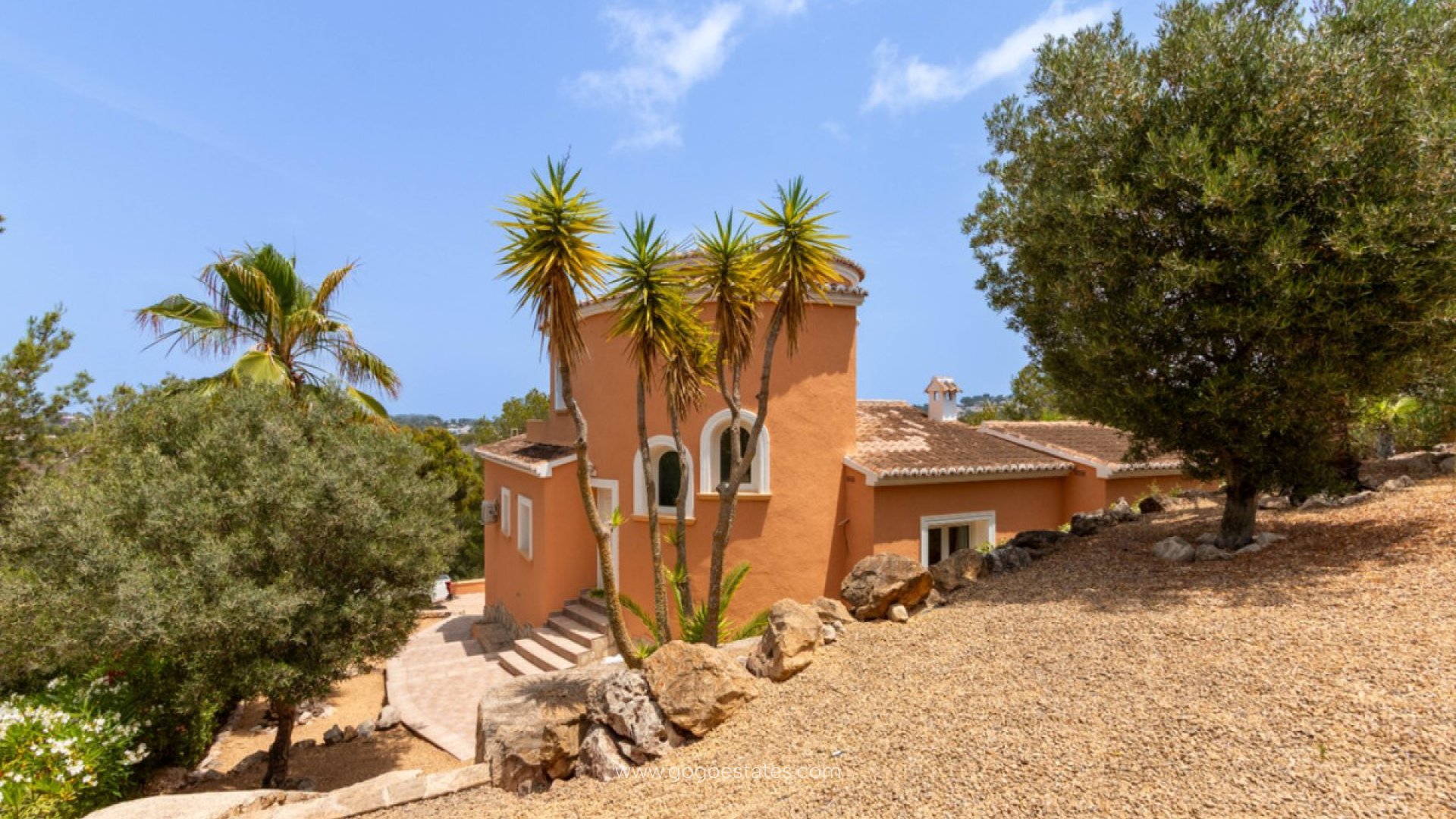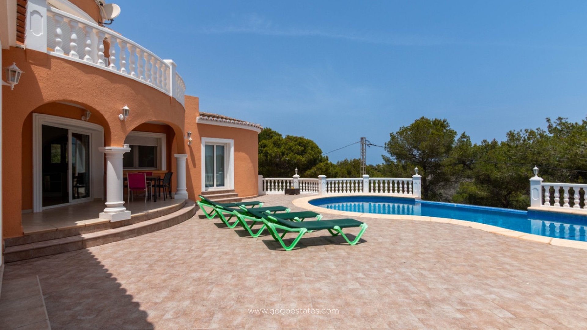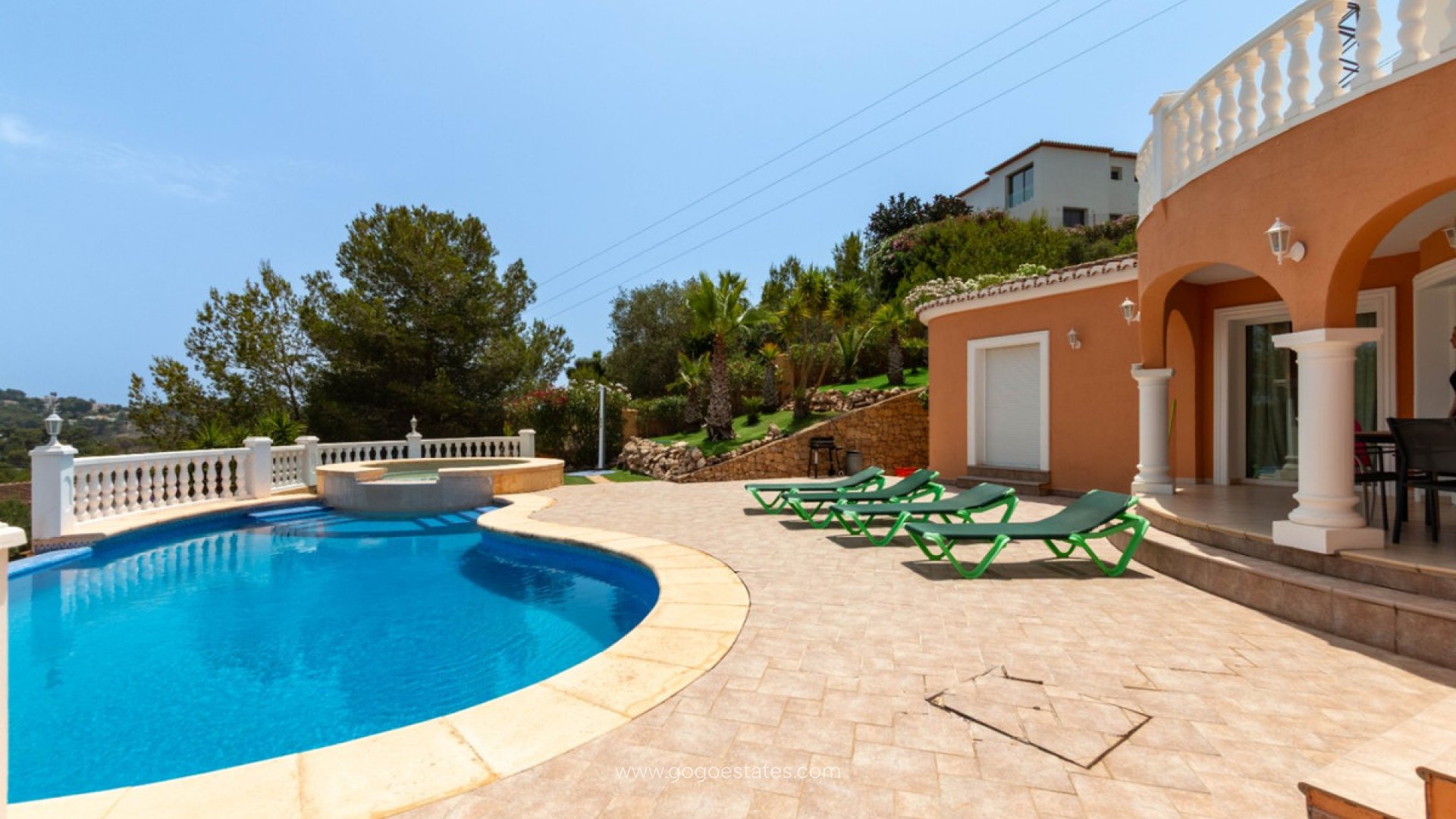 De woning bestaat uit: 3 slaapkamers (1 in elke vleugel en de derde op de bovenverdieping), 3 badkamers (waarvan 2 ensuite), open keuken en woon-eetkamer die leidt naar het terras en het zwembad.