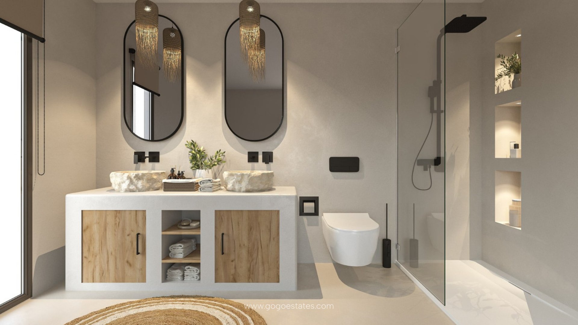 Prachtige villa in Ibiza-stijl met uitzicht op de bergen in Jávea Ervaar het mediterrane leven op zijn best in deze uitzonderlijke villa in Ibiza-stijl te koop in Jávea, waar architectonische elegantie en kustcharme samenkomen. De witgekalkte gevel met zachte, afgeronde hoeken contrasteert prachtig met handgeslepen Montgó-stenen die glinsteren met natuurlijke rode tinten – een authentieke knipoog naar het lokale landschap. Binnen omarmt het ontwerp een serene, mediterrane esthetiek, met gepolijste microcementvloeren door de hele villa, inclusief de spa-geïnspireerde badkamers. Roestkleurige aluminium ramen met dubbele beglazing voegen een warme, moderne flair toe en garanderen comfort en energiezuinigheid. Elk van de vier ruime tweepersoonsslaapkamers beschikt over een eigen en-suite badkamer, compleet met opvallende zwarte armaturen voor een strakke, moderne afwerking. Elektrische buitenluiken bieden privacy en gemak, terwijl vloerverwarming en airconditioning het hele jaar door zorgen voor klimaatbeheersing. Het hart van de woning is een lichte en open woon- en eetkamer, naadloos verbonden met een volledig uitgeruste keuken. Deze gemeenschappelijke ruimte grenst direct aan de terrassen op het zuiden en het uitnodigende privézwembad van 42 m², compleet met een ondiep strandgedeelte, ideaal om te zonnen of te ontspannen met een drankje in de hand. Geniet van het buitenleven op het 155 m² grote terras, inclusief een overdekte eethoek onder een stijlvolle pergola – perfect voor een feestje of rustige avonden buiten in het milde, zonnige klimaat van Jávea. De woning beschikt tevens over een handige wasruimte, een gastentoilet en twee overdekte parkeerplaatsen, plus een berging van 37 m² onder de villa. Gelegen tegen de adembenemende achtergrond van groene heuvels en de iconische berg Montgó, is deze villa in Ibiza-stijl de perfecte combinatie van luxe, rust en natuurlijke schoonheid.