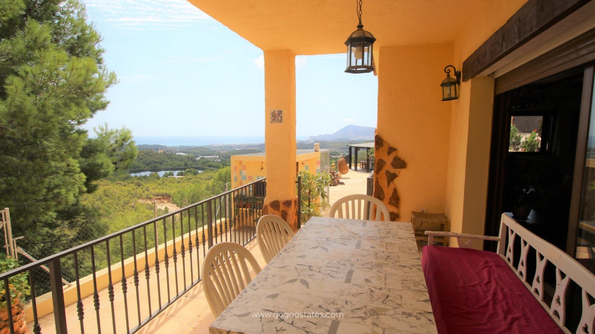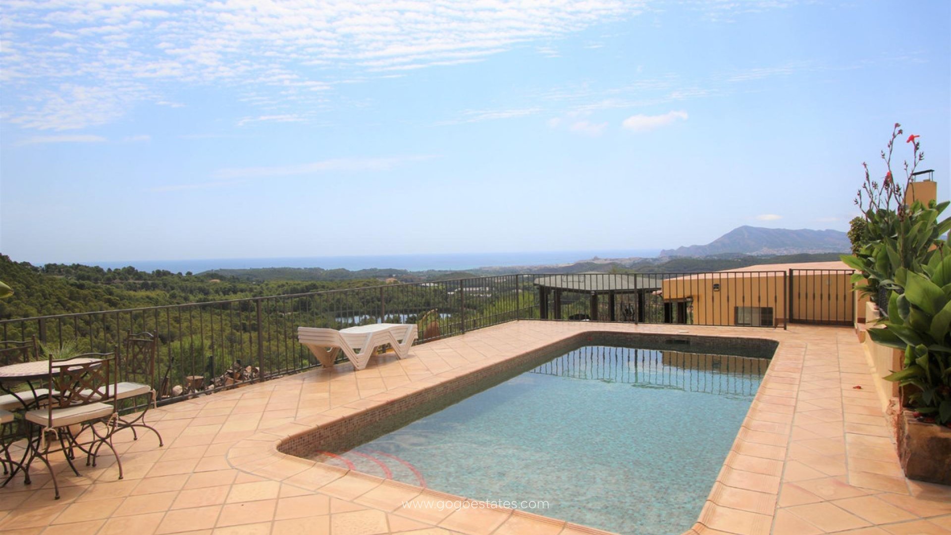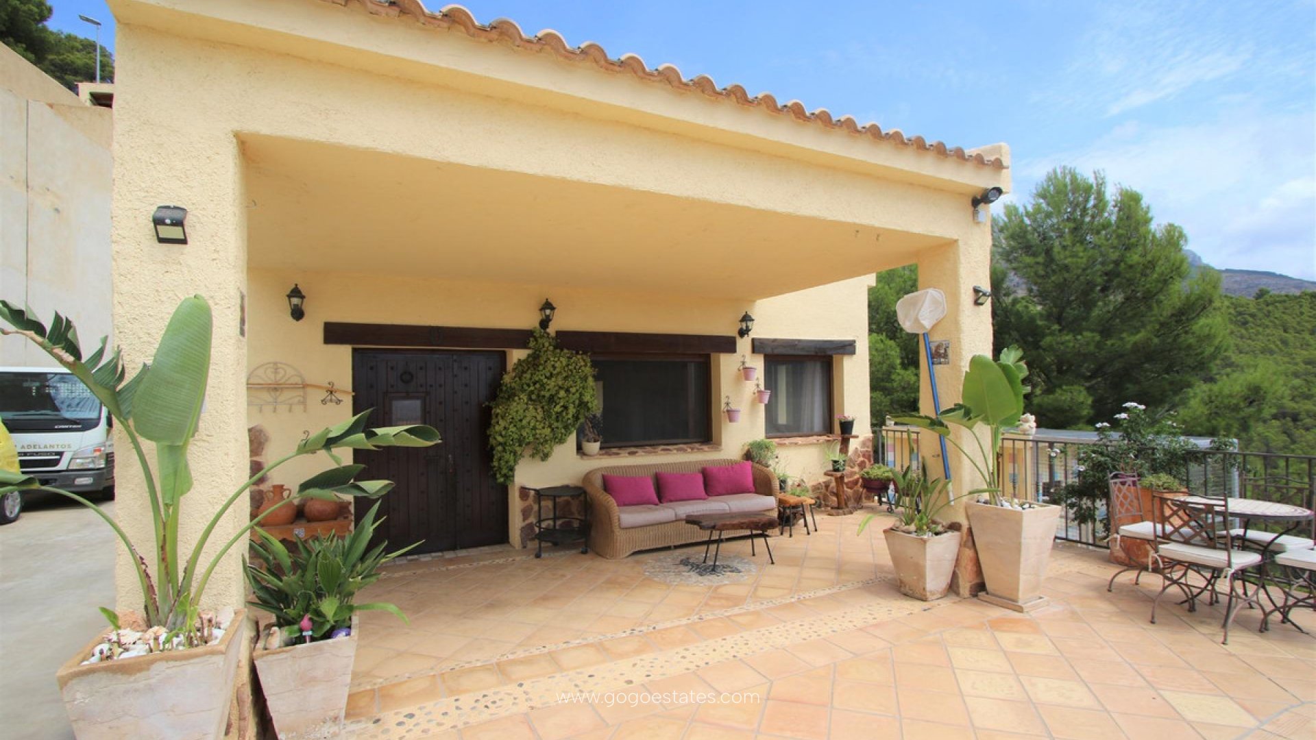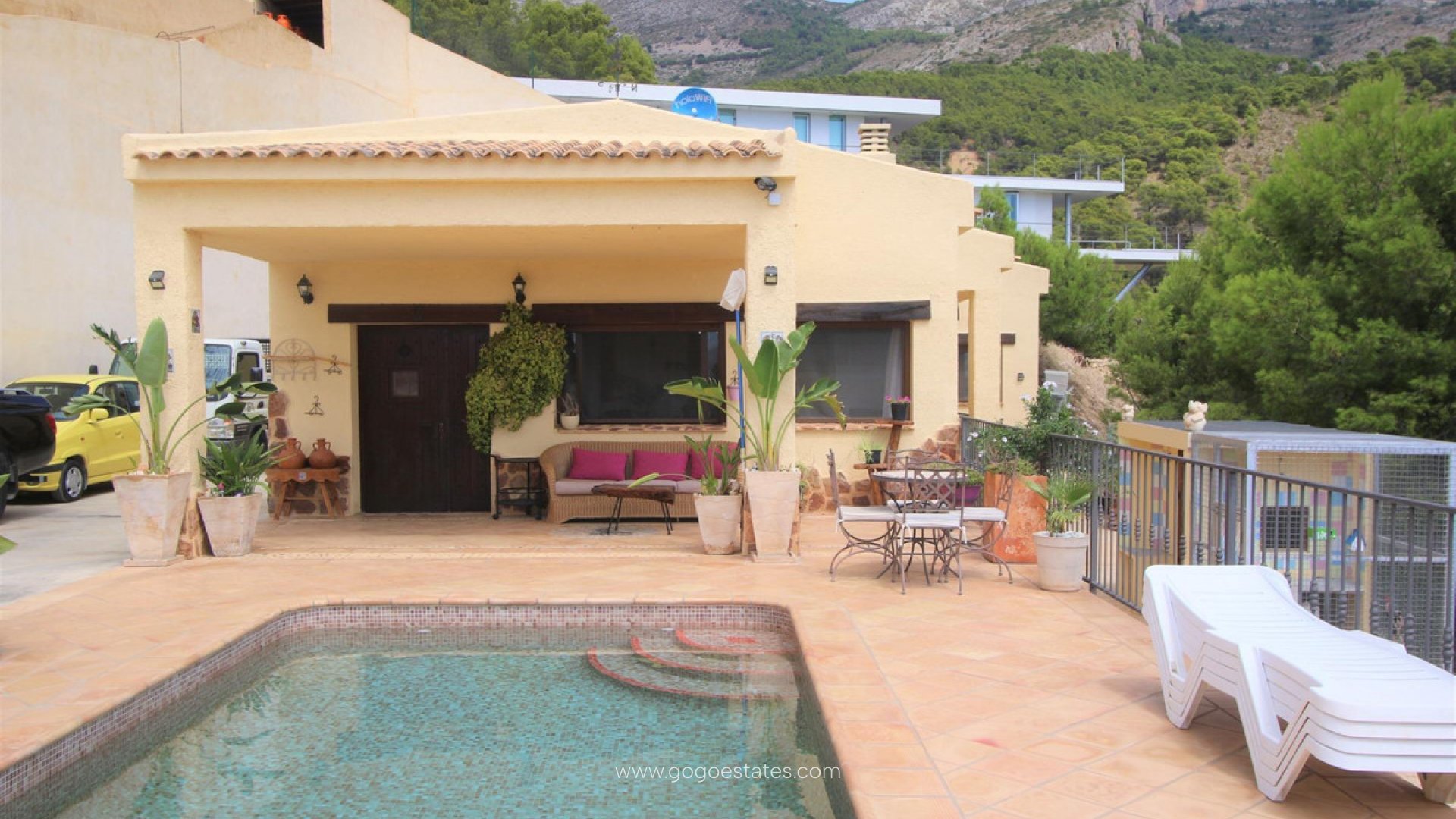 Villa met gastenverblijf, prive zwembad, overdekte buitenkeuken, verschillende terrassen, grote garage en veel parkeerruimte. De hoofdwoning heeft een ruime woon /eetkamer met open keuken, een wasruimte/berging, 2 slaapkamers en 1 badkamer. Er is verwarming met gasradiatoren, open haard, dubbel beveiligd glas, rolluiken en muggenramen. Het gastenverblijf heeft 2 slaapkamers en 1 badkamer. De grote overdekte ingerichte buitenkeuken heeft een BBQ, een gasfornuis en een pizza oven. Vanaf al de terrassen heeft men zicht op Altea, de Middelandse Zee en de bergen.