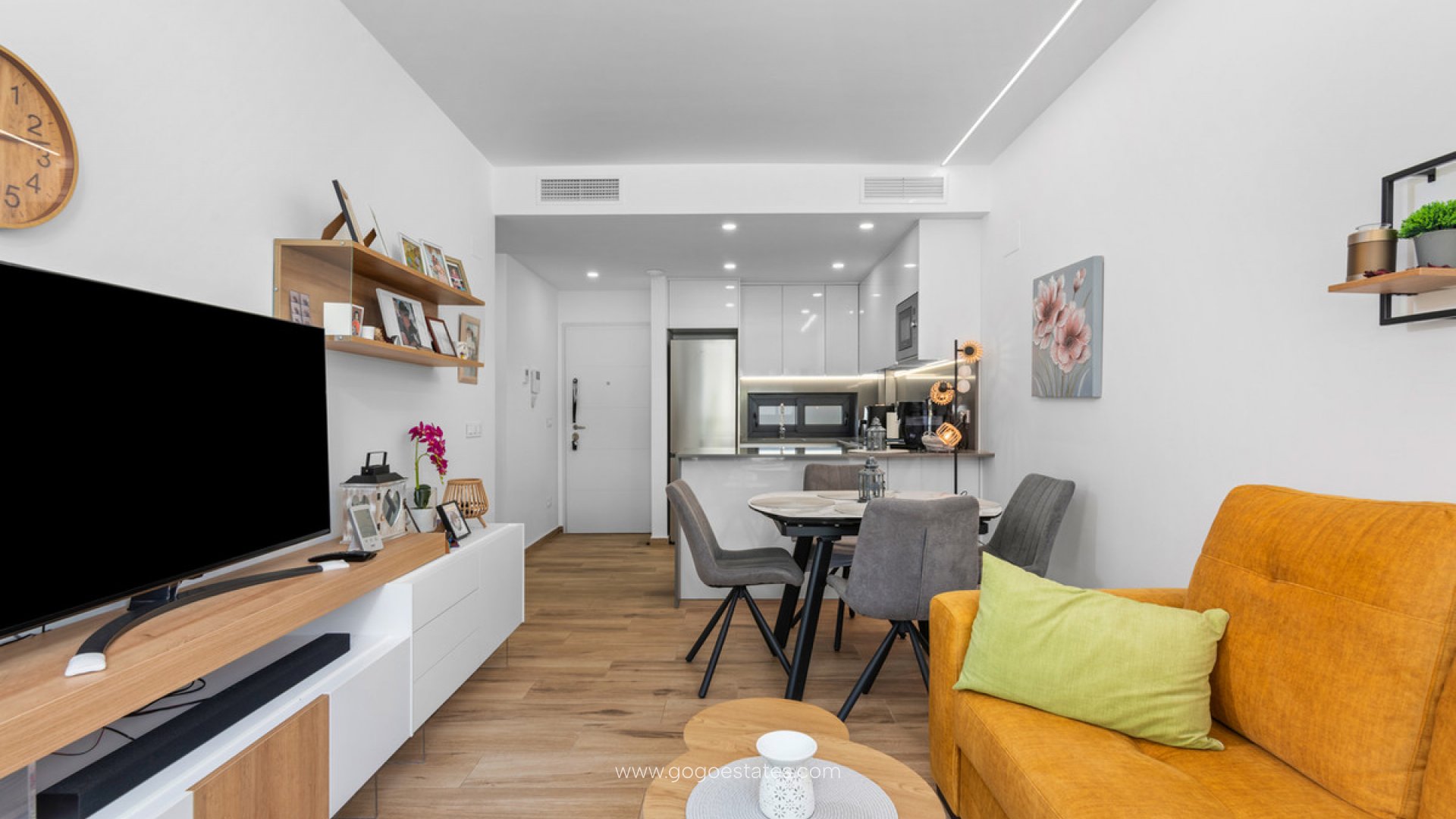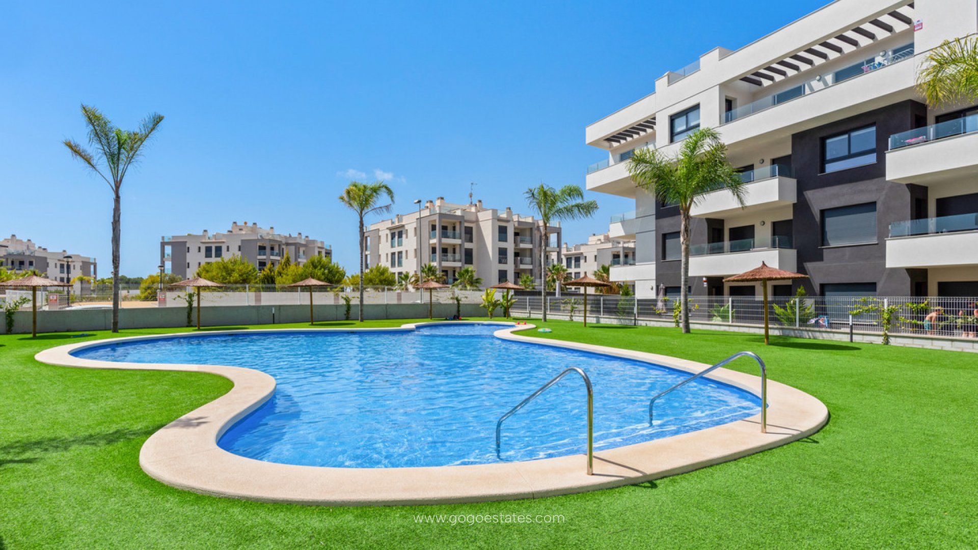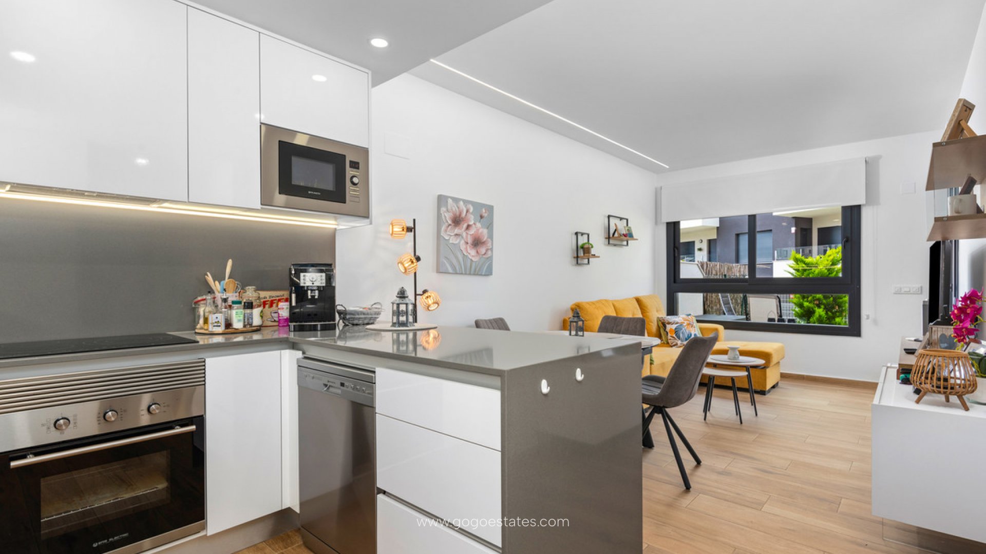 Dit modern gelijkvloers hoekappartement met 2 slaapkamers en 2 badkamers is gesitueerd in Villamartin, Alicante, op een geweldige locatie en op slechts een paar minuten wandelen naar alle lokale voorzieningen (restaurants, bars en winkels). Het fantastische strand van La Zenia en het populaire winkelcentrum La Zenia Boulevard zijn ook op minder dan 10 minuten rijden. Villamartin Plaza en Villamartin Golf zijn op minder dan 4 minuten te bereiken. De woning bestaat uit een ruime woonkamer/eetkamer, een moderne open keuken in U-vorm, elektrische rolluiken, airconditioning (koeling/verwarming), een grote slaapkamer met garderobe en een en-suite badkamer, een tweede slaapkamer met garderobe en een extra badkamer met inloopdouche. Via de schuifdeuren komt u op het terras (met kleine berging) terecht waar u de hele dag van de zon kunt genieten. Er is tevens een privé parkeerplaats inbegrepen in de prijs. Op het domein zijn mooie gemeenschappelijke tuinen voorzien met zwembad, een petanquebaan, een kinderspeeltuin en een park om te ontspannen. Deze appartementen bieden een fantastische prijs-kwaliteitverhouding en de locatie is echt geweldig met alle bars, restaurants en alle andere voorzieningen op wandelafstand. Het Villamartin-gebied is erg populair bij toeristen en het grootste deel van de bevolking bestaat uit West-Europese expatgemeenschappen die zich er in de afgelopen 10 jaar hebben gevestigd, waardoor het dorp vrijwel is veranderd in een modern ogende stadje. Er zijn ook verschillende golfbanen in de buurt en talrijke witte zandstranden.