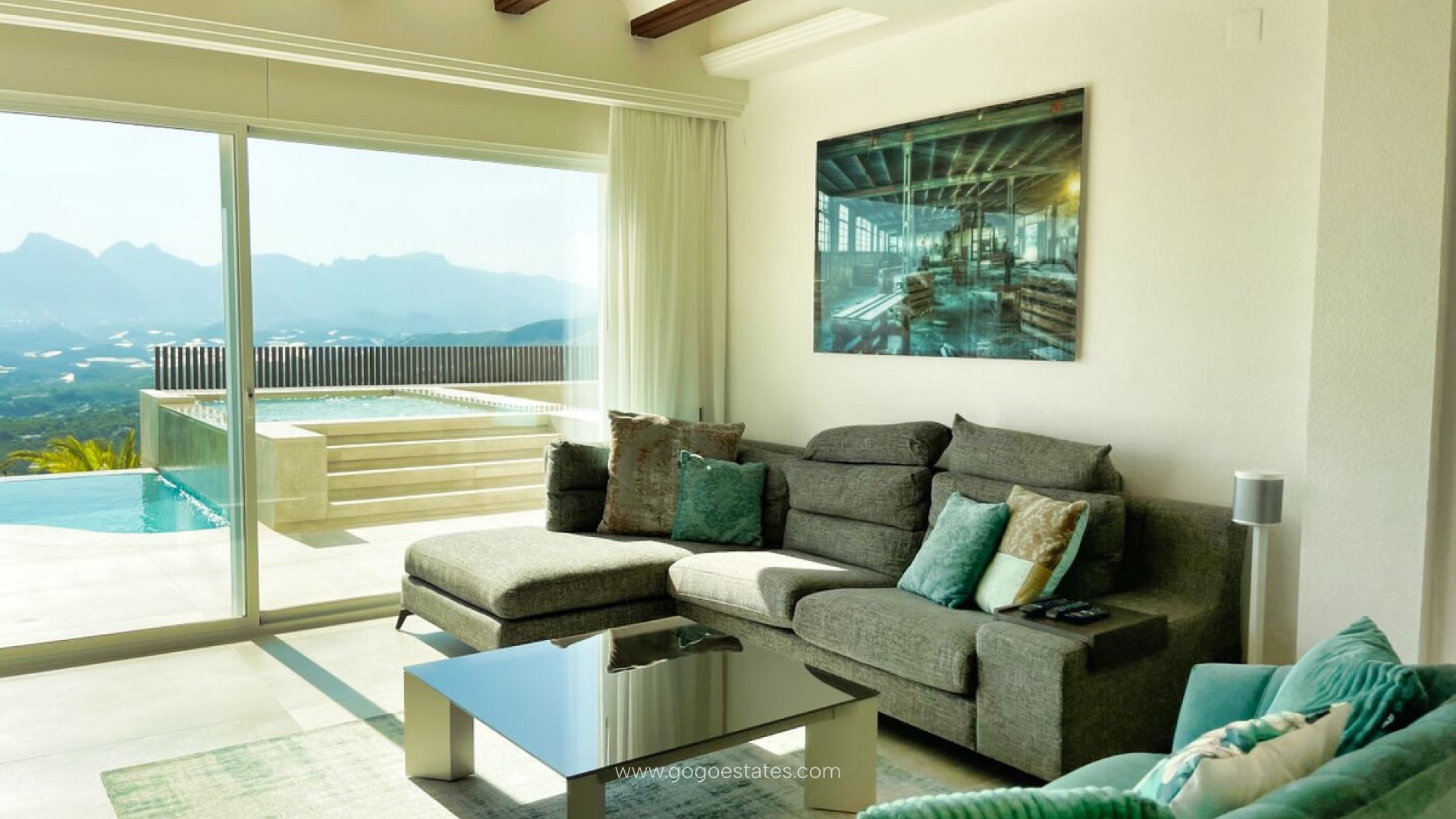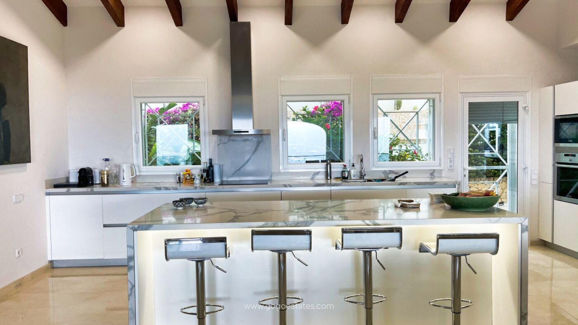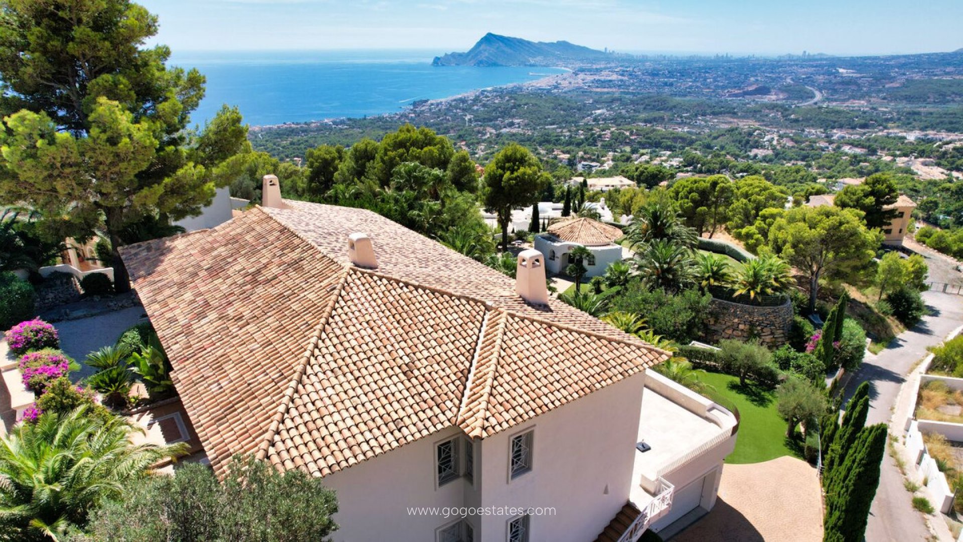 Luxe villa gelegen in de Sierra de Altea, met zeven slaapkamers, een gastenverblijf, panoramisch uitzicht op zee en de bergen, rust en privacy. Ideaal gelegen dicht bij het centrum van Altea en op 6 minuten van de stranden en de golfbaan, biedt deze woning in mediterrane stijl met een eigentijds ontwerp ongeveer 920 m2 woonruimte. Het is gerenoveerd in 2017 met gebruik van hoogwaardige materialen en met een elegante stijl en een moderne buitenkant verdeeld over drie niveaus. De luxe villa is omgeven door een perceel van 2440 m2, aangelegd, omheind en perfect gemanicuurd, met een verscheidenheid aan bloemen, volwassen planten en een spectaculair uitzicht. Een prachtige entreehal met een aantrekkelijke houten deur verwelkomt je in dit uitzonderlijke pand en leidt je naar een grote open ruimte waar je een woonkamer met open haard, eetkamer en volledig uitgeruste designkeuken met eiland vindt, ideaal voor entertainment in gezelschap. Op dezelfde verdieping is er een elegante ouderslaapkamer met ook panoramisch uitzicht op zee, inbouwkasten en een en-suite badkamer met douche, bad en dubbele wastafel. Dankzij de grote ramen zul je versteld staan van het uitzonderlijke zeezicht op de baai van Altea en de Sierra Helada. Er zijn ook twee en-suite slaapkamers, elk met een eigen badkamer. Op de onderste verdieping, die toegankelijk is via een sierlijke binnentrap, vind je nog een lichte en ruime open ruimte met een tv-kamer, een eetkamer en een aantrekkelijke open keuken. Voor extra gemak bevinden zich op dit niveau zowel de wasruimte als de berging. Op de begane grond van deze luxe villa is er een fitnessruimte, een bijkeuken, extra opslagruimte en een afgesloten garage voor drie voertuigen. Dankzij de geoptimaliseerde indeling is deze woning ideaal voor het ontvangen van een groot aantal gasten en geschikt voor grote gezinnen, waar iedereen zijn privacy kan behouden en kan genieten van de vele ontspannen binnen- en buitenhoeken. Als je door de tuin wandelt en recht tegenover een vijver met exotische vissen staat, zie je het onafhankelijke gastenverblijf met Marokkaans design en een prachtig uitzicht op de zee en de privétuin. Dit huis is voorzien van alle mogelijke gemakken en airconditioning. Daarnaast is er een aangesloten veiligheidsalarm, kabeltelevisie en glasvezelinternet. Je zult ook de hoge balkenplafonds opmerken en de harmonie van edele en natuurlijke materialen in de hele villa.