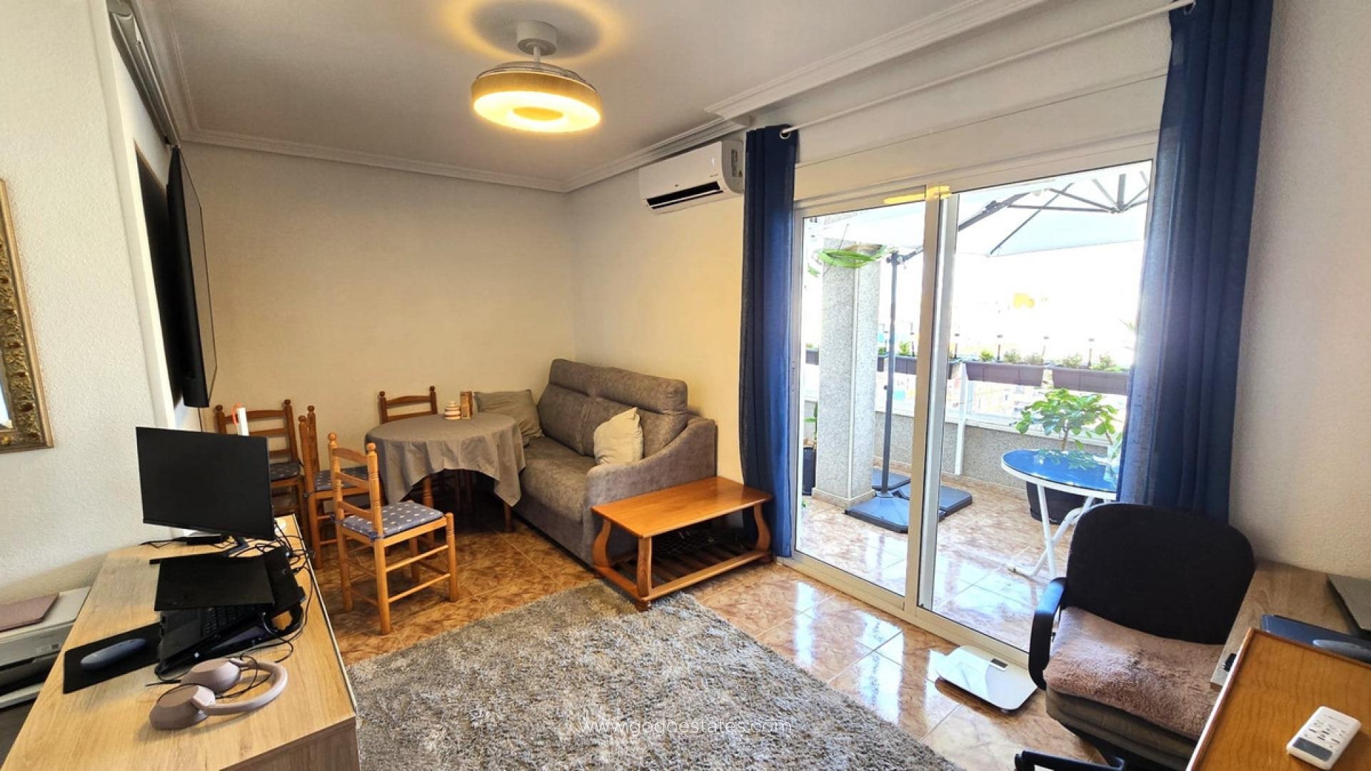 Prachtig penthouse met 1 slaapkamer, groot terras en garage in Torrevieja Dit penthouse heeft slechts één slaapkamer, maar met een groot terras dat uitkijkt op de horizon, biedt het een prachtig uitzicht dat u uitnodigt om van het buitenleven te genieten. Het interieur, zorgvuldig ingedeeld, combineert functionaliteit en comfort. De aparte en volledig uitgeruste keuken stelt u in staat om comfortabel te koken zonder de rust van de rest van de ruimte te verstoren. De woonkamer, ruim en licht, is aangepast aan het moderne leven: in een hoek bevindt zich een gezellige werkhoek met een bureau. De slaapkamer, eenvoudig maar gezellig, biedt rust en ontspanning na elke dag. En als finishing touch, een garage die bij het gebouw is inbegrepen, maakt thuiskomen altijd comfortabel en praktisch. LOCATIE: Torrevieja ligt in de provincie Alicante (Costa Blanca). Het is beroemd om zijn mediterrane klimaat en zijn kust. We mogen de promenades niet vergeten waar we enkele restaurants langs de fijne zandstranden vinden. Het heeft ook vele uitstekende stranden zoals Playa de los Náufragos, Playa de los Locos en Playa de la Mata. Daarom wordt het beschouwd als een opmerkelijke toeristische stad waar de omgeving een belangrijke toeristische trekpleister is. Daarnaast zijn er vele winkelcentra (Habaneras, La Zenia Boulevard), golfbanen, sportcentra, ziekenhuizen (zoals Hospital Universitario de Torrevieja) en luchthavens zoals Alicante Airport (35 km) en de internationale luchthaven van de regio Murcia (43 km). AFSTAND TOT DE ZEE: 700 m. GEMEENSCHAP: € 360. IBI: € 220. Heeft u vragen? Neem dan gerust contact met ons op!