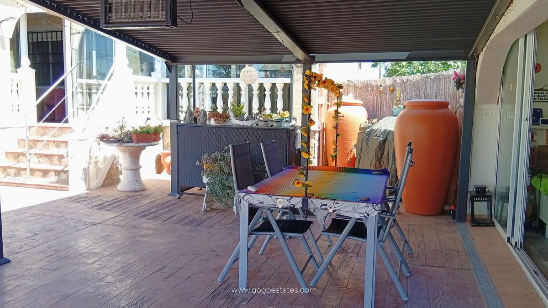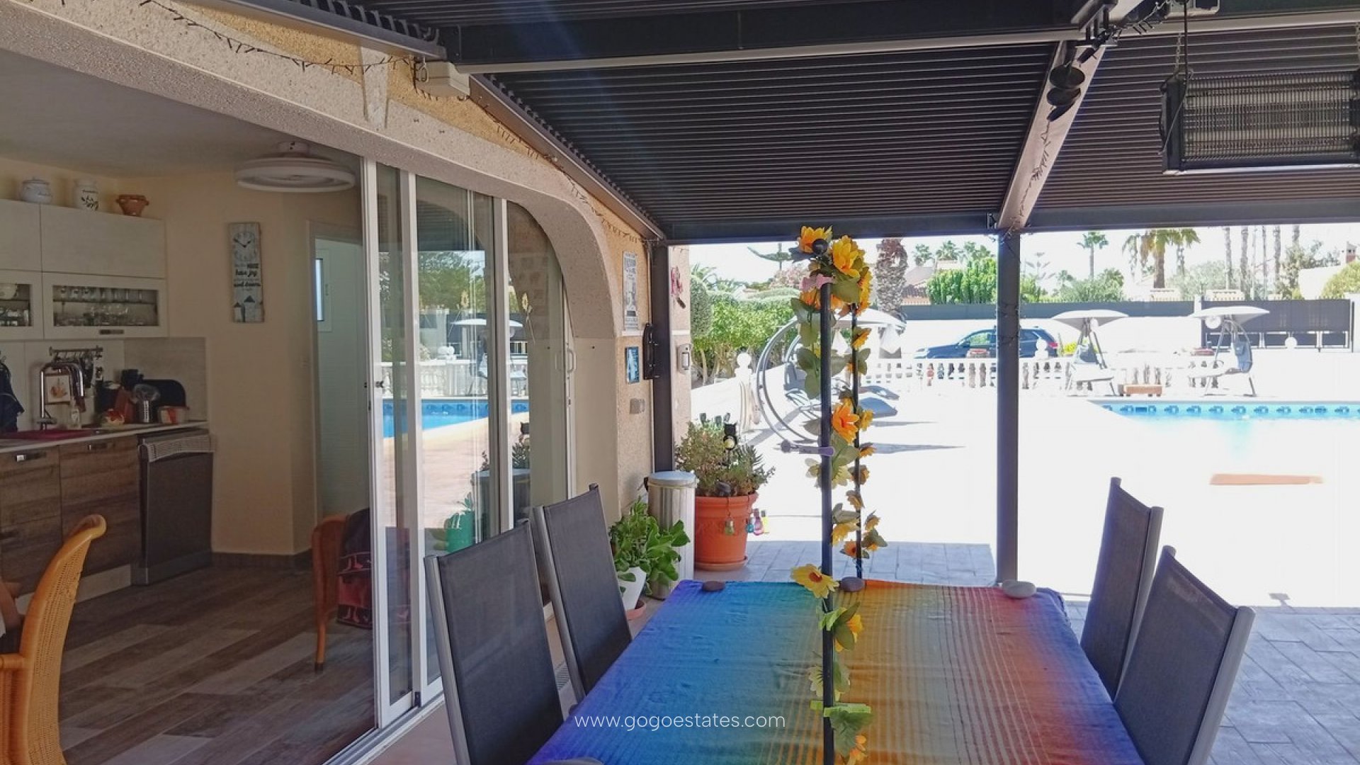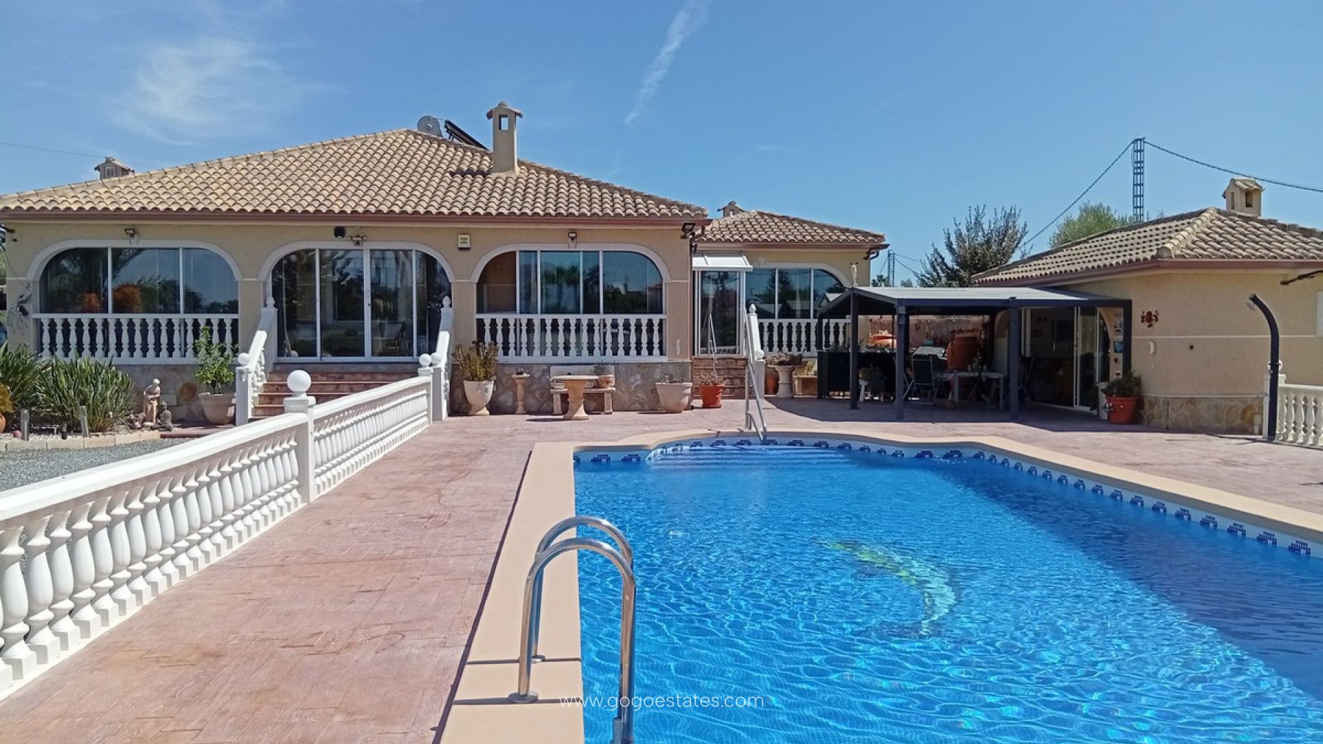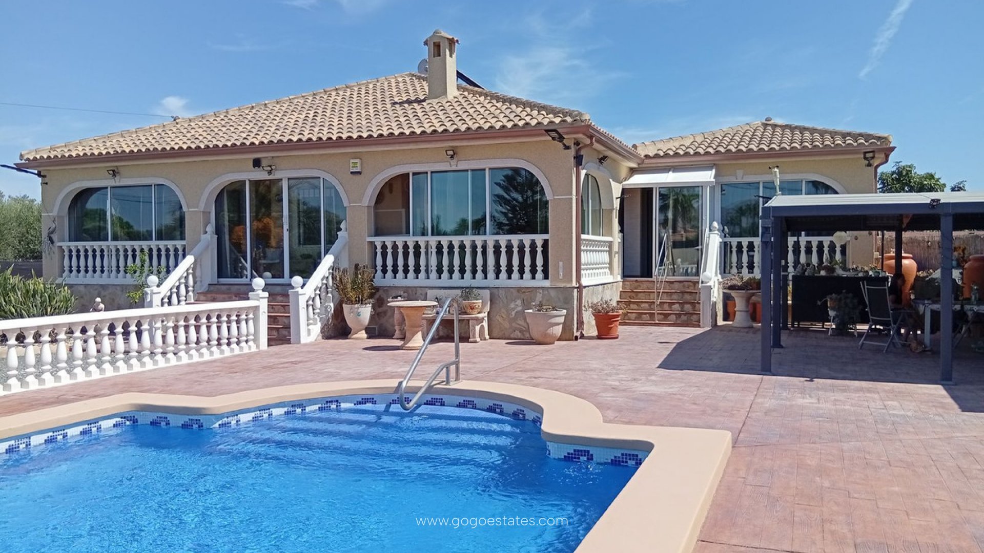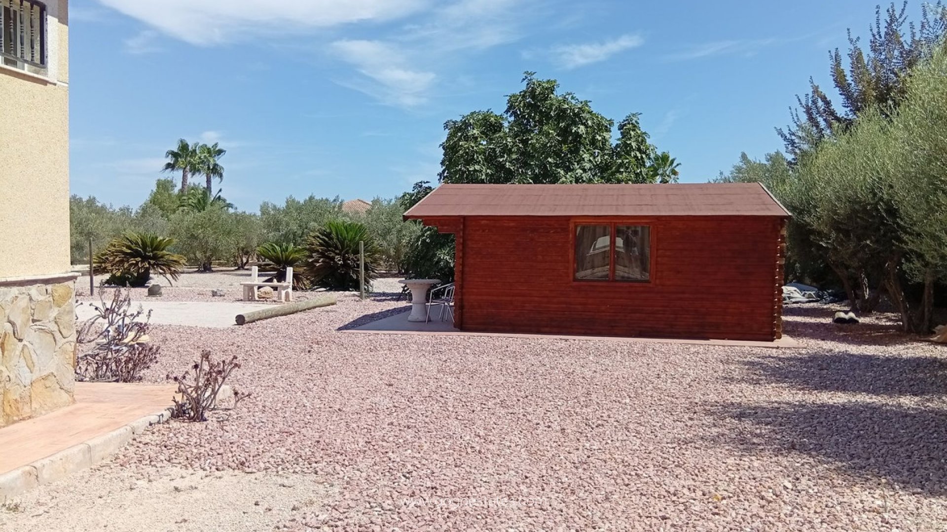 Landelijke villa met karakter in Catral Op zoek naar een ruime woning met alle comfort én een vleugje Spaanse charme? Dan is dit landhuis in Catral misschien wel exact wat u zoekt. Rustig gelegen, met vlotte verbindingen en slechts enkele minuten van het centrum. Bij binnenkomst stapt u via het beglaasde terras naar binnen - een heerlijke extra leefruimte die ideaal is voor de frissere winterdagen. Vanuit hier komt u in de moderne keuken (met praktische bijkeuken). De keuken is recent gerenoveerd en heeft logisch gebruik gemaakt van elke ruimte. Aansluitend bevindt zich de ruime woonkamer met gezellige open haard. Deze geeft toegang tot het slaapgedeelte met drie slaapkamers, allemaal voorzien van inbouwkasten, en twee recent gerenoveerde badkamers, waarvan één ensuite. Naast de woonkamer bevindt zich nog een apart gastenverblijf. Momenteel is dit ingericht als ensuite slaapkamer, inclusief dressing. Ook hier vindt u een eigen badkamer met douche. De woning wordt volledig gemeubileerd verkocht. Verder geniet u van centrale verwarming (op mazout), airconditioning, zonnepanelen en horren op alle ramen. Het perceel van 5.000 m² is volledig omheind en toegankelijk via een automatische poort. De tuin is onderhoudsvriendelijk aangelegd met grind, palmbomen en fruitbomen. Achteraan vindt u een houten chalet, een petanquebaan en een kleine olijfgaard. Voor de wagen is er een ruime garage en een houten carport. Dé eyecatcher van deze eigendom? Het royale zoutwaterzwembad (10x5 m) met groot zonneterras, pergola en een volledig uitgeruste poolhouse mét volledig uitgeruste keuken en apart toilet. U kan deze zeker gebruiken als gastenverblijf. De ideale plek om lange zomerdagen door te brengen. Kenmerken op een rij: Landhuis (1 verdieping) 261 m² bewoonbare oppervlakte 4 slaapkamers - 3 badkamers Perceel van 5.000 m² Zwembad 10x5 m (zoutwater) Oriëntatie: noord, zuid, oost, west Bouwjaar: 2000 Garage + carport voor mobilhome Centrale verwarming (stookolie), airco, zonnepanelen