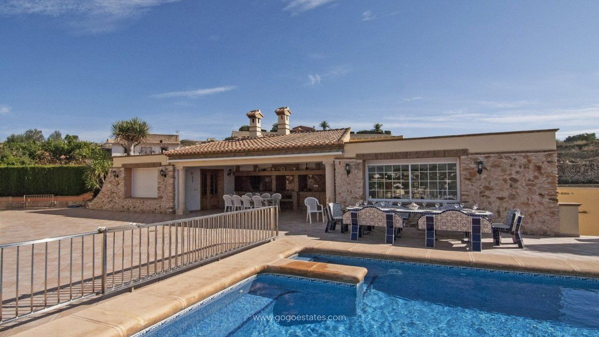 Impressive villa with private pool and dream garden, located in a quiet area of the town of Benissa (Costa Blanca). INTERIOR: The main house is formed by ground floor, main floor and first floor, with a total of 6 bedrooms. On the same plot, about 100 meters from the main house, there is a house with a bedroom. In total 7 bedrooms between the 2 houses, and 470 m2 of interior surface. Main house, ground floor: (Access by a step) Large fully equipped kitchen with gas fires and access to the living room with comfortable sofas, TV tdt / sat. 1 large bedroom with double bed. 1 bathroom with bath, toilet and sink. 1 large bedroom with 2 single beds. 1 bathroom with shower, toilet and sink. 1 room with washing machine. Main floor: (Access by 3 steps) Living room with TV tdt / sat and exit to covered porch overlooking the pool. Large fully equipped kitchen with gas fires. 1 large bedroom with 2 single beds. 1 large bedroom with double bed, 1 split air conditioning, and en suite bathroom with bath, toilet and sink. 1 large bedroom with 2 single beds. 1 bathroom with bath, toilet and sink. 1st floor: (Access by external stairs 20 steps). This floor is an apartment type of 40 m2 approx. At the entrance of this apartment we will find a room equipped with a small kitchen with 2 fires, a bunk bed with 2 single beds and 1 split air conditioner. Through this room you access the master bedroom with a double bed, ceiling fan and bathroom with shower, toilet and sink in suite. Detached house: This house is located on the same plot, located at 100 m approx. of the main house, surrounded by grass and palm trees, it has a living room with tdt tv, fully equipped kitchen. 1 large bedroom with double bed. 1 bathroom with shower, toilet and sink. 1 room with washing machine. Exterior: Huge plot of 5500 m2, mostly closed, with an extensive lawn area of 800 m2 approx. where you can rest in the shade of palm trees. (plus another 6,000 m2). It has a large pool, with a fence for the protection of the smallest and with lawn area. Large covered barbecue fully equipped, ideal for outdoor meals. Fenced pool for the safety of the little ones, rectangular in shape, and with dimensions 12 x 6m with Roman steps, outside shower. Cozy covered barbecue area, with a countertop with gas fires. 1 living room with an area with 1 bathroom, with shower, toilet and sink. Large parking area for 6-7 vehicles. LOCATION: 1 km to the nearest supermarket. 5 km from Benissa town. 8 km from the beach of Levante and promenade of Calpe. 9 km to the center of Calpe. From here you can access in less than 5 minutes on the way to the small ´Cala de La Fustera´. Call us for a visit or more information. We work to find the house of your dreams. We will show you this property if you are interested, or we will search for you until we find what you are looking for. Then, we will take care of all the necessary paperwork until the keys are handed over!