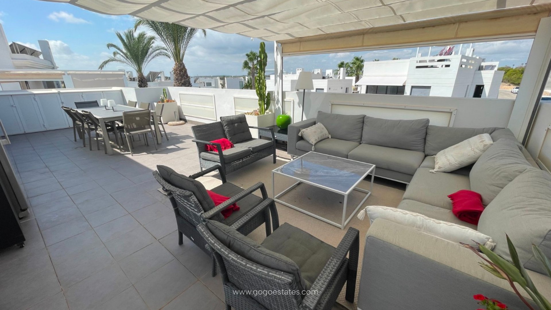 Dit duplex penthouse appartement met drie slaapkamers, gelegen op het zuidoosten aan Las Ramblas Golf, is gelegen aan de rand van deze prestigieuze golfbaan, grenzend aan Campoamor Golf. Op slechts een korte rit vindt u Villamartin, het populaire winkelcentrum La Zenia Boulevard en de prachtige stranden langs de Orihuela Costa, die u in ongeveer 10 minuten bereikt. Deze prachtige woning met een modern architectonisch ontwerp heeft een woonoppervlakte van 97 m², verdeeld over twee verdiepingen, en geniet van een verhoogde ligging met een fantastisch uitzicht, terwijl de woonkamer toch gemakkelijk bereikbaar is vanaf de begane grond. De lichte woon-/eetkamer is voorzien van twee glazen schuifdeuren naar het terras, waarvan een deel een gewelfd plafond heeft en een ultramoderne open trap, waardoor u optimaal kunt genieten van het spectaculaire open uitzicht door het kamerhoge raam. Een goed uitgeruste keuken met ontbijtbar, twee tweepersoonsslaapkamers en een familiebadkamer completeren deze verdieping. Op de eerste verdieping bevindt zich de hoofdslaapkamer met en-suite badkamer met douche en directe toegang tot een opvallend L-vormig terras, compleet met uitschuifbaar zonnescherm en handige opbergkasten – de perfecte plek om te ontspannen en te genieten van het uitzicht. Gelegen in een prachtig onderhouden en gepresenteerd complex, profiteren bewoners van een prachtig gemeenschappelijk infinity zwembad en afgesloten parkeergelegenheid. Extra's zijn onder andere airconditioning. Een werkelijk uitzonderlijke woning waar "schitterend" simpelweg niet genoeg is om de kwaliteiten en luxe uit te drukken die deze woning aan de Costa Blanca Zuid biedt.