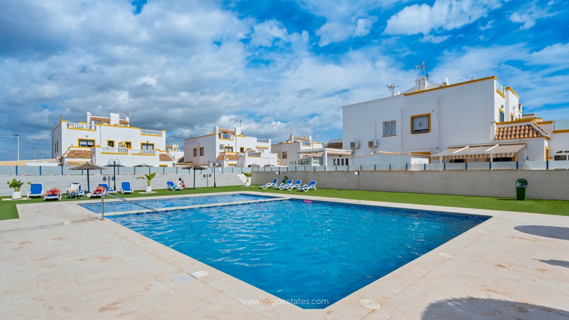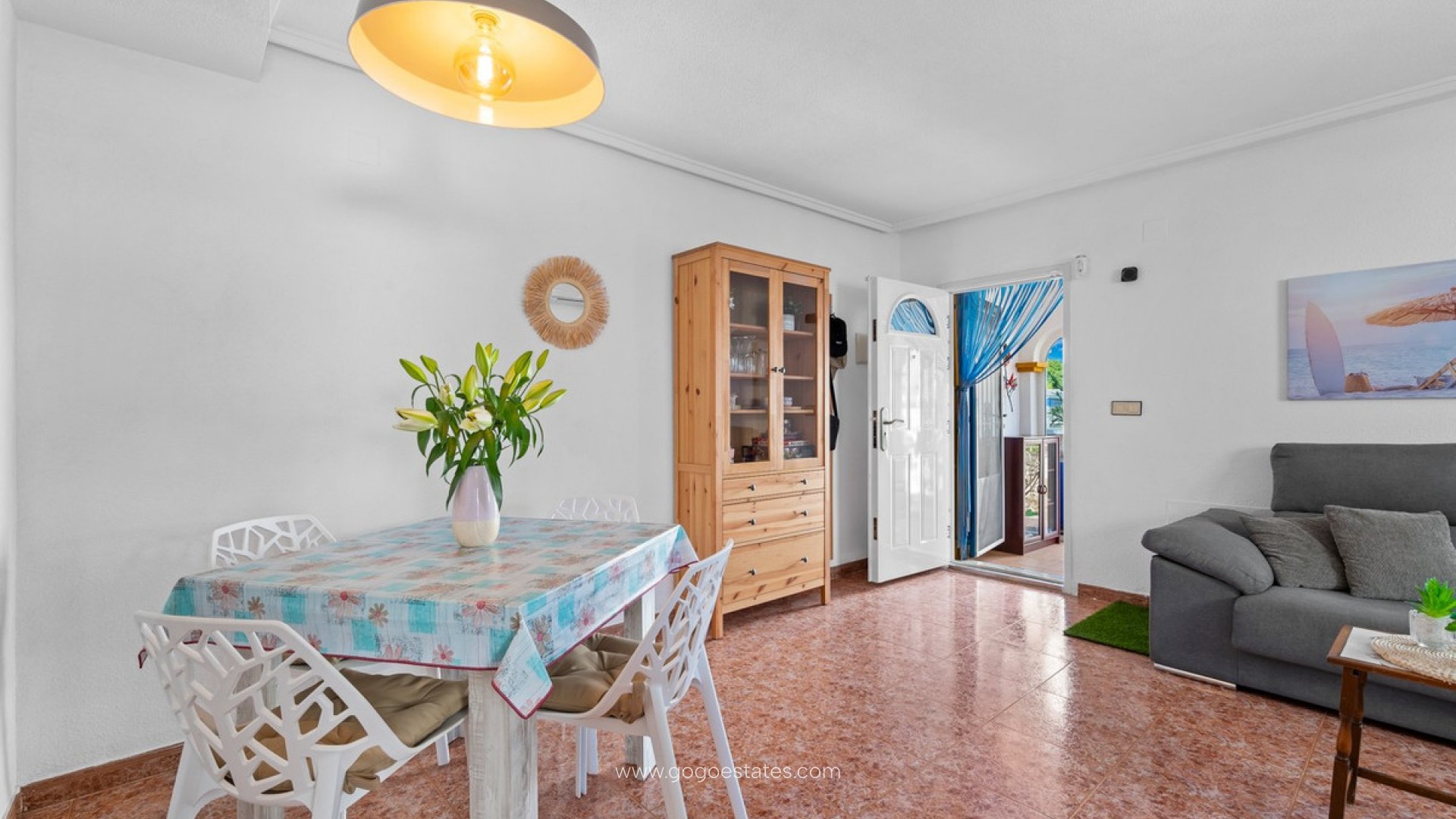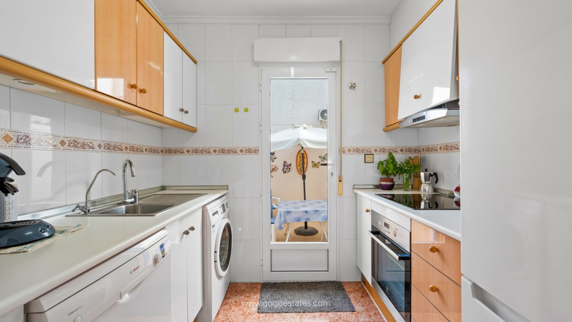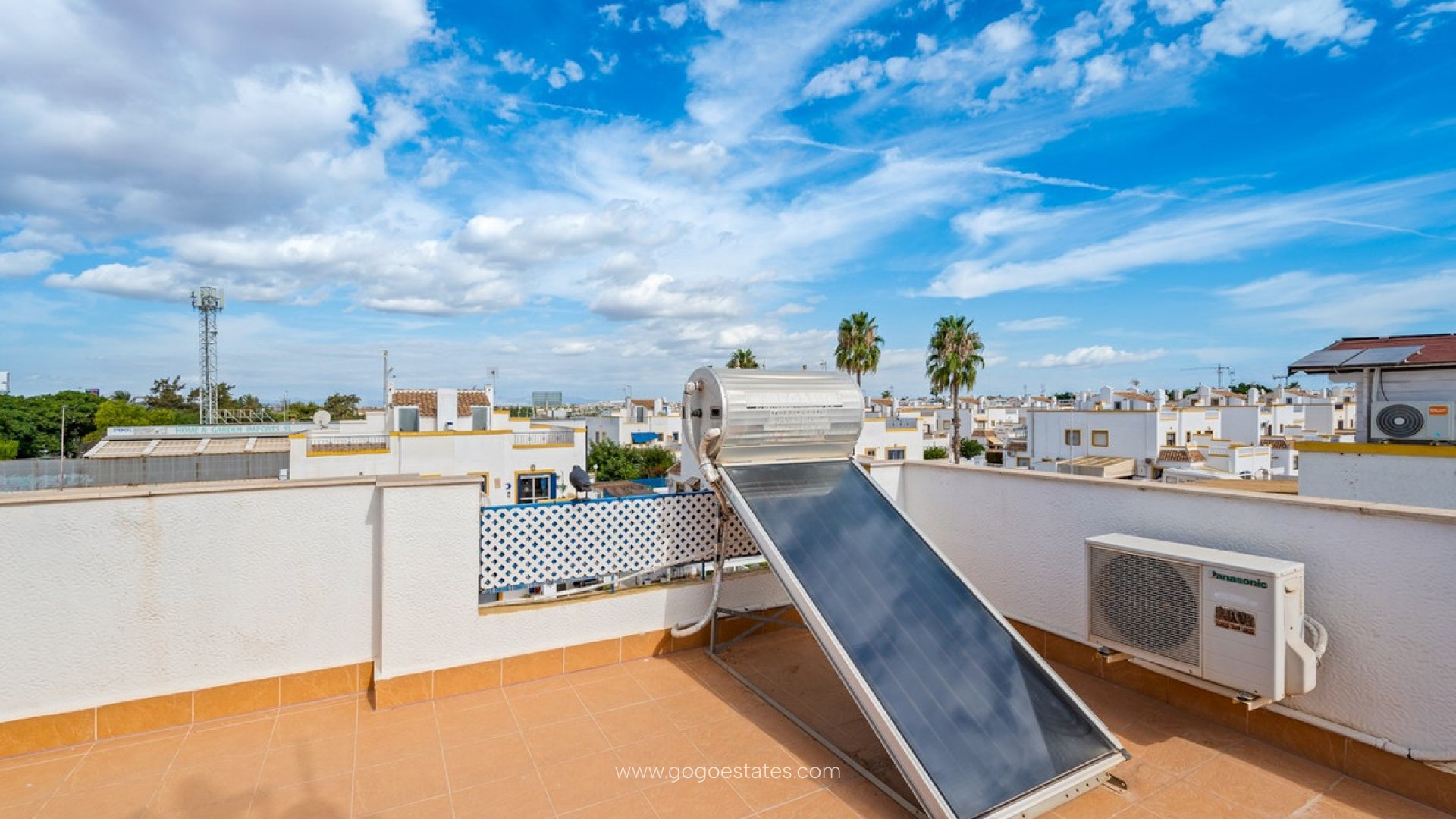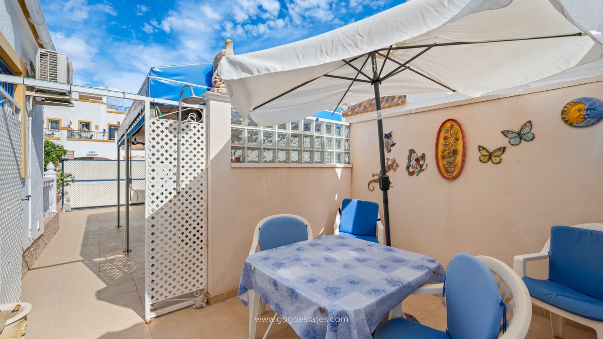In de rustige urbanisatie Jardin del Mar, verscholen in een doodlopend straatje, vind je deze charmante quadwoning – een plek waar comfort en gezelligheid samenkomen. Het perceel is volledig afgesloten met een elektrische poort en beschikt over een overdekte parkeerplaats, een groot terras vooraan en aan de zijkant van de woning. Voor het huis staan een appelsien- en citroenboom, die voor een vleugje mediterrane sfeer zorgen. Bij het binnenkomen word je verwelkomd in een aangename leefruimte met aansluitende keuken. Alle ramen op de begane grond werden recent vervangen en zijn voorzien van dubbel glas. Op dit niveau vind je ook een slaapkamer en een badkamer met douche, toilet en vloerverwarming. Aan de voorzijde van de woning ligt een heerlijke veranda waar je het hele jaar door kan genieten: in de zomer zet je alles open voor een frisse bries, in de winter sluit je de ramen en creëer je een zonnige winterkamer. Aan de zijkant van de woning bevindt zich een ruime berging, ideaal als extra opslag. Op de eerste verdieping vind je een grote slaapkamer met schuiframen aan de voorkant. Het terras is hier dichtgemaakt en ingericht als een sfeervolle bureauruimte en loungehoek, waar je heerlijk kan genieten van het uitzicht. Verder is er nog een slaapkamer en een tweede badkamer met douche en toilet. Een trap leidt naar het solarium, waar je in alle privacy kan genieten van de zon. Hier bevindt zich ook de zonneboiler die de woning van warm water voorziet. Deze woning is praktisch, goed onderhouden en straalt warmte en gezelligheid uit. Met zijn zonnige terrassen, knusse veranda en fijne uitzichten is dit de ideale vakantiewoning of permanente thuis aan de Costa Blanca.
