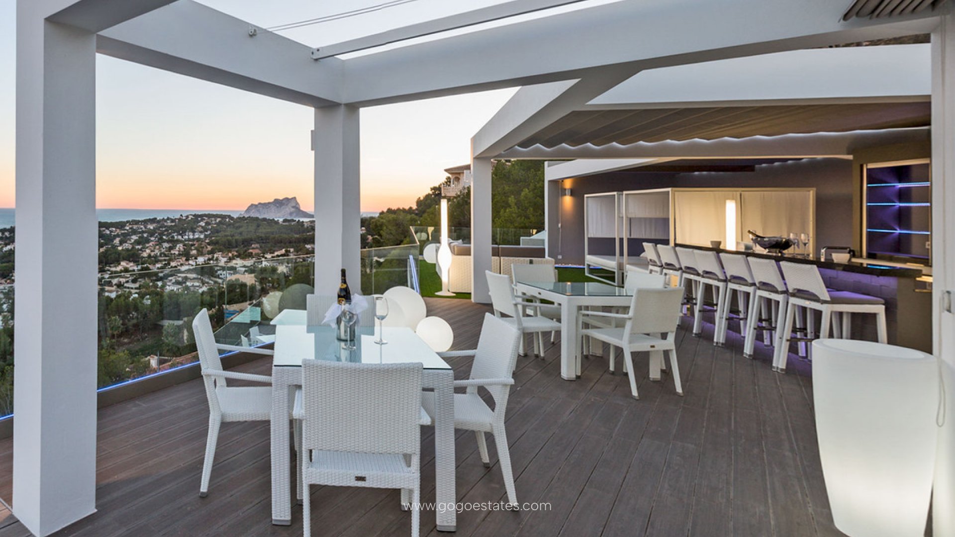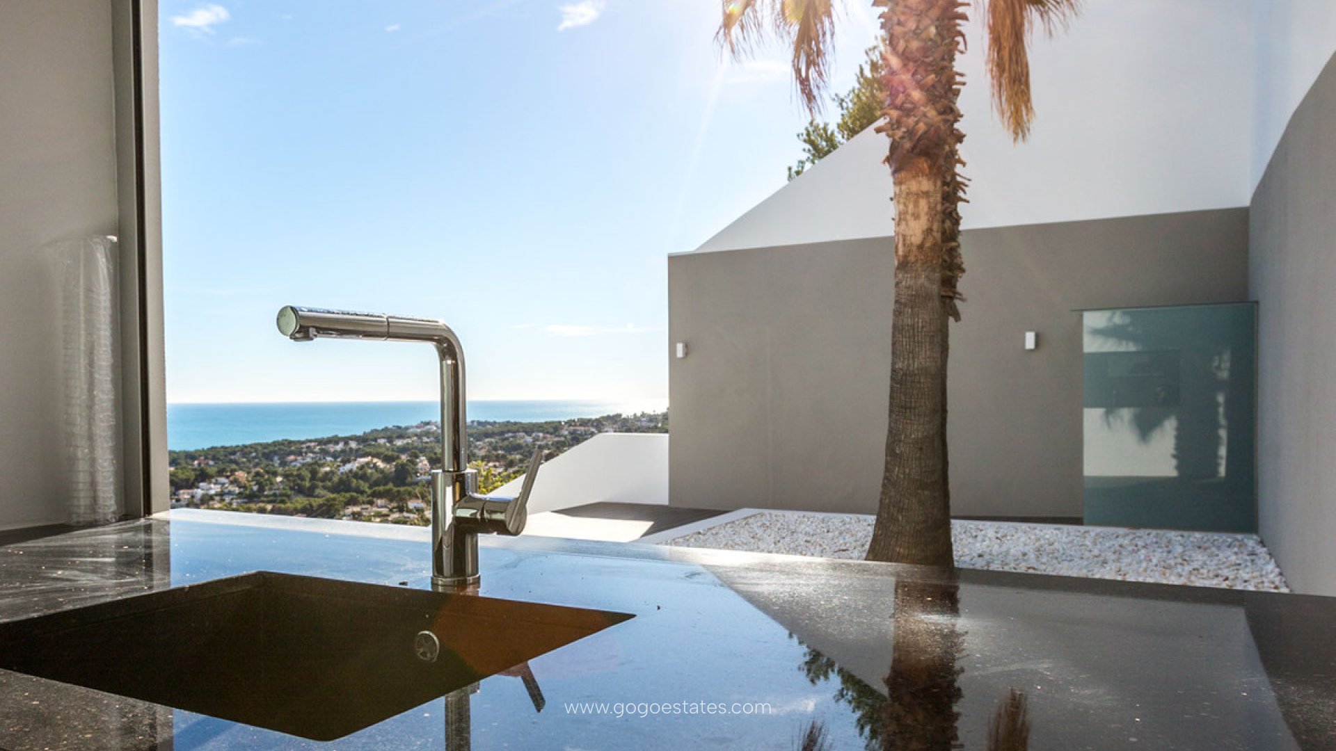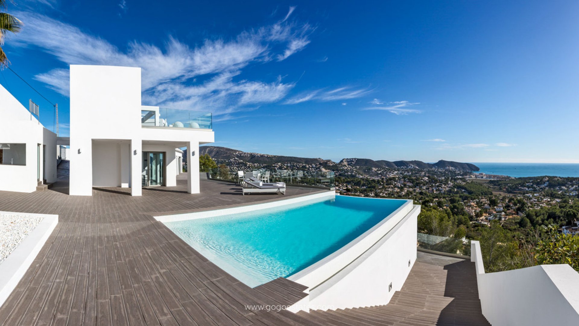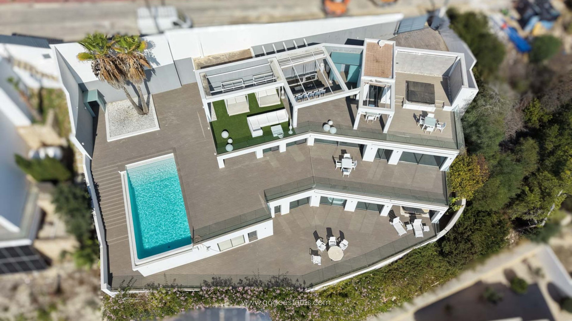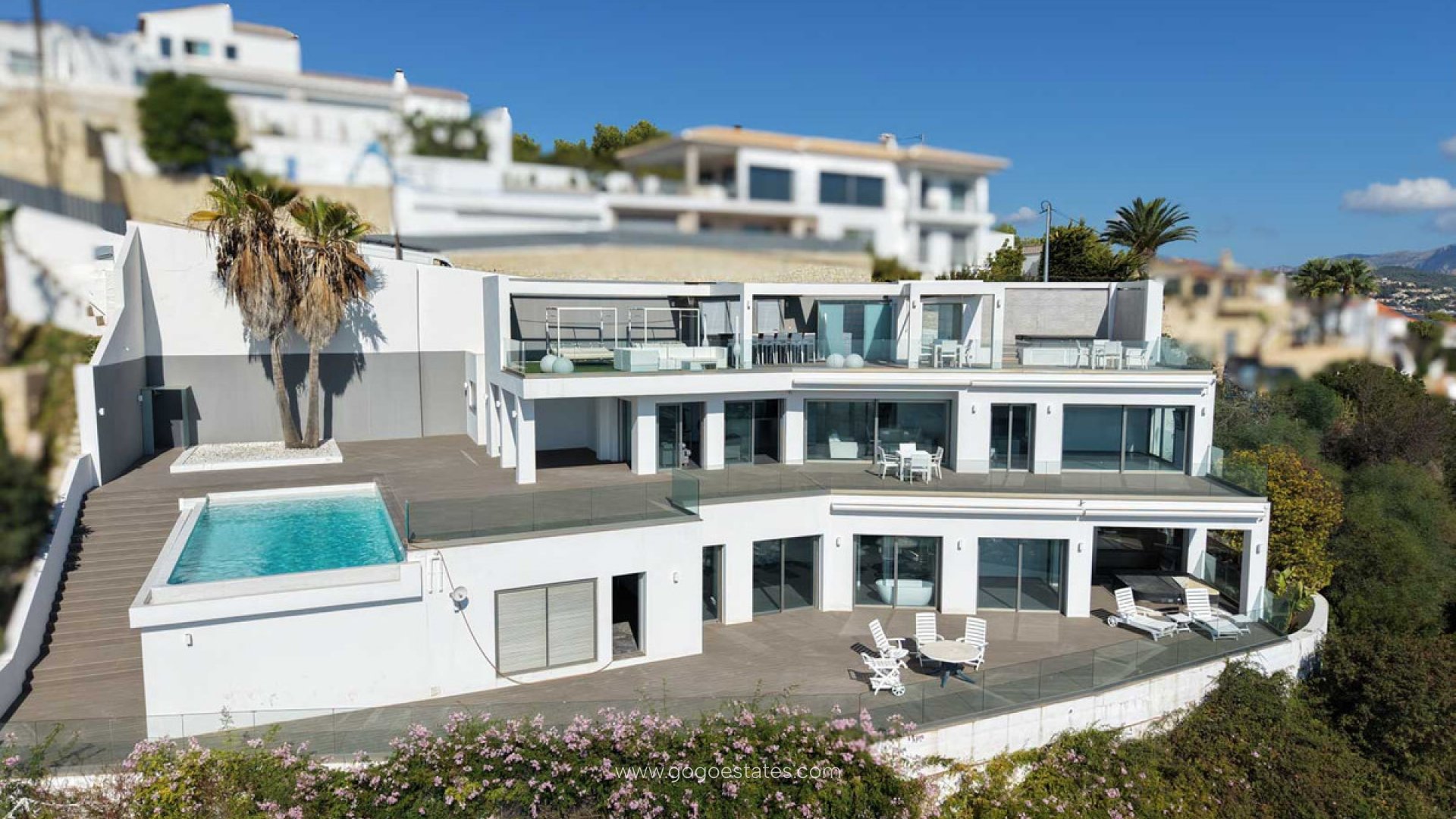Deze exclusieve villa in moderne stijl staat op een perceel van meer dan 900 m², op het zuiden gericht, zodat u de hele dag kunt genieten van de zon en een prachtig open uitzicht op de Middellandse Zee. Met meer dan 400 m² woonoppervlak en 480 m² terrassen combineert de woning perfect hedendaags design, comfort en elegantie. Op de begane grond bevindt zich een ruime en lichte woon-/eetkamer met open haard, die naadloos overgaat in een open en geïntegreerde professionele keuken, ontworpen voor zowel dagelijks gebruik als gezelligheid. Vanaf deze verdieping is er directe toegang tot het spectaculaire hoofdterras, waar het dubbelzijdige infinity zwembad visueel versmelt met de horizon van de zee. Op dezelfde verdieping bevindt zich een slaapkamer met en-suite badkamer en kleedkamer, die eveneens directe toegang biedt tot het terras en uitzicht op zee, wat een intieme en serene sfeer biedt. Beneden beschikt de villa over drie elegante slaapkamers met en-suite badkamer, die allemaal uitkomen op een ruim terras. Op deze verdieping bevindt zich ook een ruime open ruimte, ideaal als fitnessruimte, studeerkamer of recreatieruimte, en een exclusieve spa met een glazen sauna en toegang tot een terras met een buitenjacuzzi, een perfecte plek voor ontspanning en welzijn. Het dakterras is een ware oase van plezier en ontspanning. Daar kunnen eigenaren genieten van een hydromassageruimte, een decoratieve waterval, ligstoelen en elegant chill-outmeubilair, allemaal vergezeld door een professionele buitenkeuken met bar en toonbank, een gastentoilet en een grote schaduwrijke plek waar u in alle comfort en privacy van de omgeving kunt genieten. De woning is uitgerust met vloerverwarming op zonne-energie en een warmtepomp, airconditioning in alle kamers, op maat ontworpen interieur, een bewakings- en alarmsysteem, een elektrische poort, een garage en een volledig omheinde buitenmuur, wat maximale veiligheid en privacy garandeert. Gelegen in Moraira, een van de meest exclusieve enclaves aan de Costa Blanca, ligt deze villa op slechts enkele minuten van het centrum en de charmante baaien met kristalhelder water. Moraira combineert de charme van een oud vissersdorp met een eersteklas keuken, een jachthaven, boetiekjes en een ongeëvenaarde levenskwaliteit. Een bevoorrechte locatie waar zee, luxe en rust in perfecte harmonie samengaan.