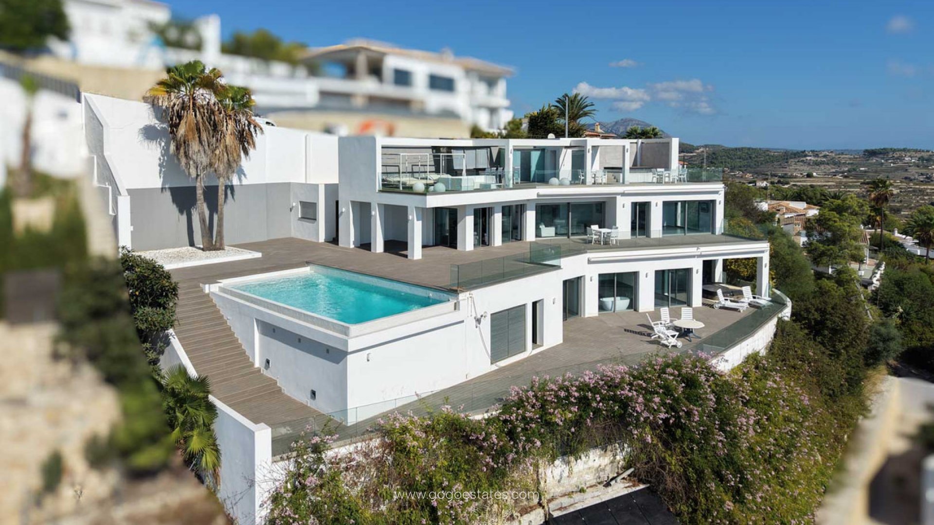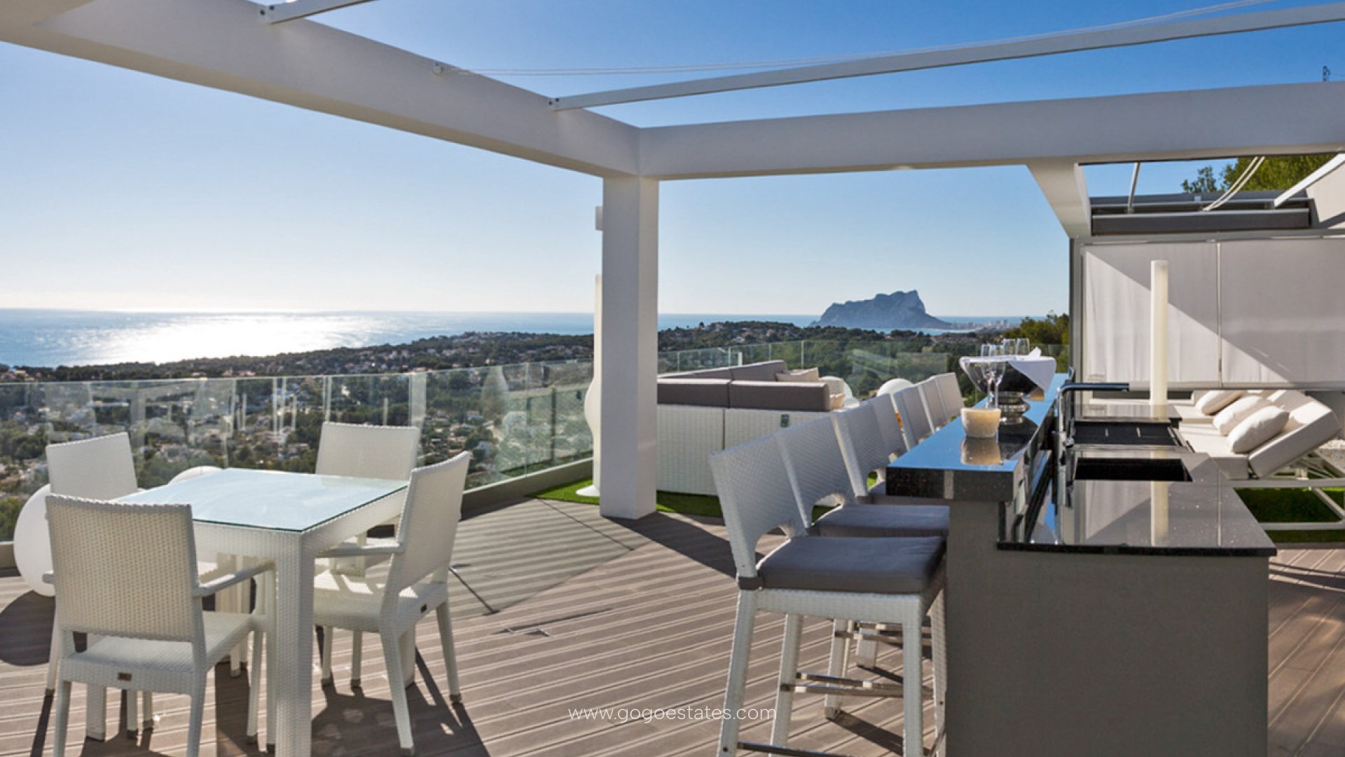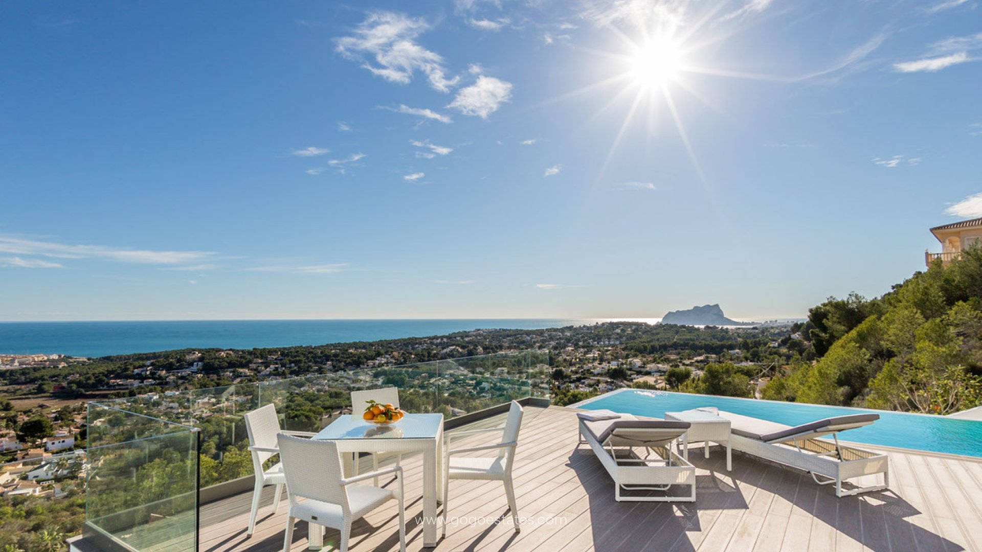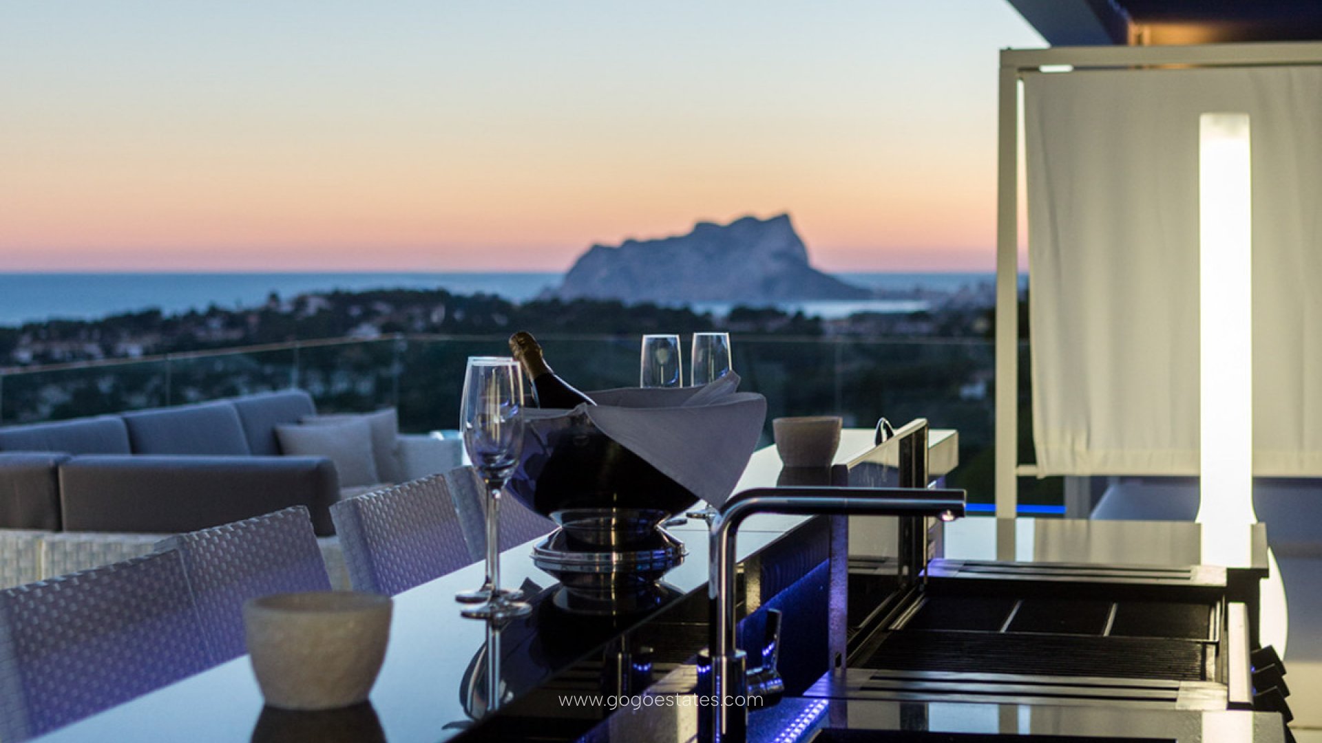 Deze exclusieve villa in moderne stijl staat op een perceel van meer dan 900 m², op het zuiden gericht, zodat u de hele dag kunt genieten van de zon en een prachtig open uitzicht op de Middellandse Zee. Met meer dan 400 m² woonoppervlak en 480 m² terrassen combineert de woning perfect hedendaags design, comfort en elegantie. Op de begane grond bevindt zich een ruime en lichte woon-/eetkamer met open haard, die naadloos overgaat in een open en geïntegreerde professionele keuken, ontworpen voor zowel dagelijks gebruik als gezelligheid. Vanaf deze verdieping is er directe toegang tot het spectaculaire hoofdterras, waar het dubbelzijdige infinity zwembad visueel versmelt met de horizon van de zee. Op dezelfde verdieping bevindt zich een slaapkamer met en-suite badkamer en kleedkamer, die eveneens directe toegang biedt tot het terras en uitzicht op zee, wat een intieme en serene sfeer biedt. Beneden beschikt de villa over drie elegante slaapkamers met en-suite badkamer, die allemaal uitkomen op een ruim terras. Op deze verdieping bevindt zich ook een ruime open ruimte, ideaal als fitnessruimte, studeerkamer of recreatieruimte, en een exclusieve spa met een glazen sauna en toegang tot een terras met een buitenjacuzzi, een perfecte plek voor ontspanning en welzijn. Het dakterras is een ware oase van plezier en ontspanning. Daar kunnen eigenaren genieten van een hydromassageruimte, een decoratieve waterval, ligstoelen en elegant chill-outmeubilair, allemaal vergezeld door een professionele buitenkeuken met bar en toonbank, een gastentoilet en een grote schaduwrijke plek waar u in alle comfort en privacy van de omgeving kunt genieten. De woning is uitgerust met vloerverwarming op zonne-energie en een warmtepomp, airconditioning in alle kamers, op maat ontworpen interieur, een bewakings- en alarmsysteem, een elektrische poort, een garage en een volledig omheinde buitenmuur, wat maximale veiligheid en privacy garandeert. Gelegen in Moraira, een van de meest exclusieve enclaves aan de Costa Blanca, ligt deze villa op slechts enkele minuten van het centrum en de charmante baaien met kristalhelder water. Moraira combineert de charme van een oud vissersdorp met een eersteklas keuken, een jachthaven, boetiekjes en een ongeëvenaarde levenskwaliteit. Een bevoorrechte locatie waar zee, luxe en rust in perfecte harmonie samengaan.
