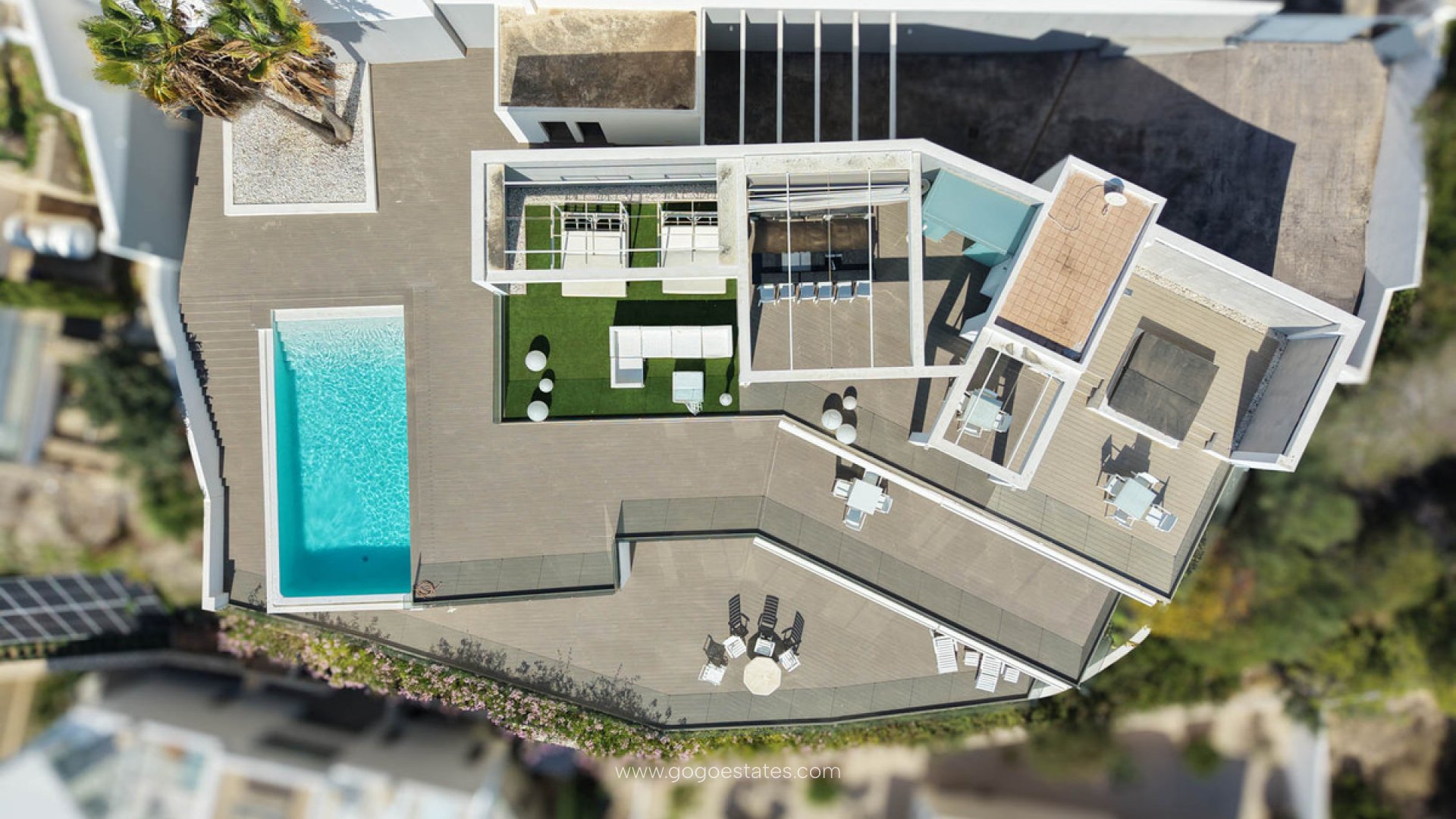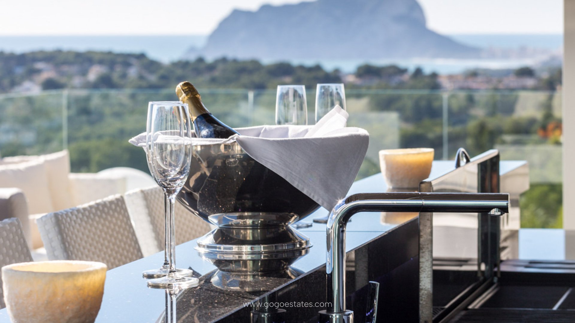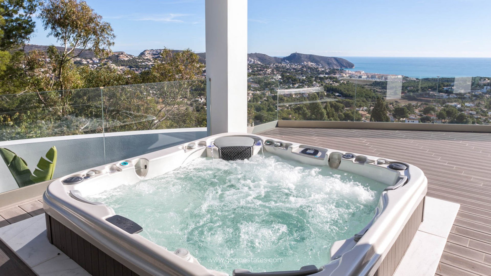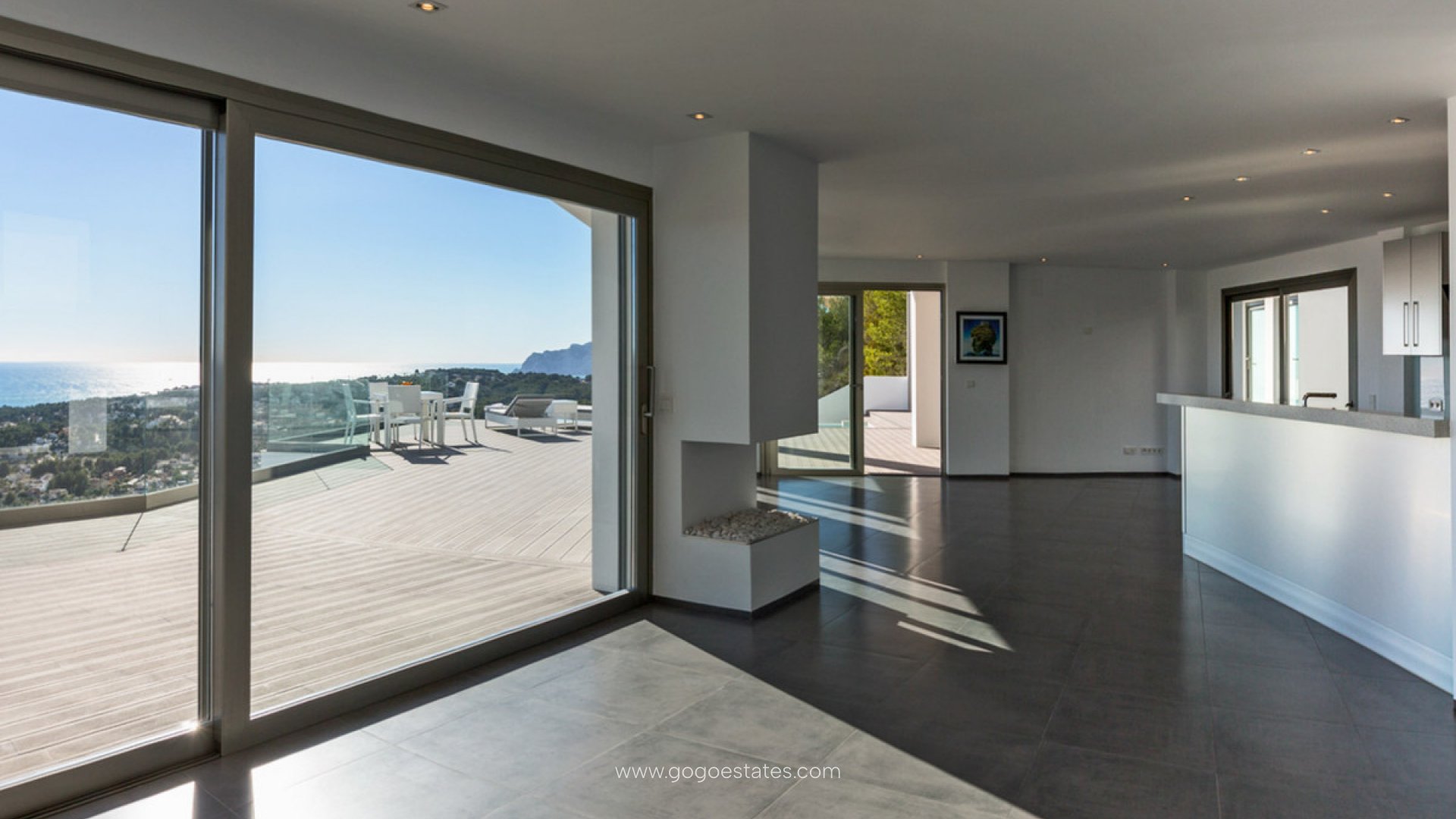 Deze exclusieve villa in moderne stijl staat op een perceel van meer dan 900 m², op het zuiden gericht, zodat u de hele dag kunt genieten van de zon en een prachtig open uitzicht op de Middellandse Zee. Met meer dan 400 m² woonoppervlak en 480 m² terrassen combineert de woning perfect hedendaags design, comfort en elegantie. Op de begane grond bevindt zich een ruime en lichte woon-/eetkamer met open haard, die naadloos overgaat in een open en geïntegreerde professionele keuken, ontworpen voor zowel dagelijks gebruik als gezelligheid. Vanaf deze verdieping is er directe toegang tot het spectaculaire hoofdterras, waar het dubbelzijdige infinity zwembad visueel versmelt met de horizon van de zee. Op dezelfde verdieping bevindt zich een slaapkamer met en-suite badkamer en kleedkamer, die eveneens directe toegang biedt tot het terras en uitzicht op zee, wat een intieme en serene sfeer biedt. Beneden beschikt de villa over drie elegante slaapkamers met en-suite badkamer, die allemaal uitkomen op een ruim terras. Op deze verdieping bevindt zich ook een ruime open ruimte, ideaal als fitnessruimte, studeerkamer of recreatieruimte, en een exclusieve spa met een glazen sauna en toegang tot een terras met een buitenjacuzzi, een perfecte plek voor ontspanning en welzijn. Het dakterras is een ware oase van plezier en ontspanning. Daar kunnen eigenaren genieten van een hydromassageruimte, een decoratieve waterval, ligstoelen en elegant chill-outmeubilair, allemaal vergezeld door een professionele buitenkeuken met bar en toonbank, een gastentoilet en een grote schaduwrijke plek waar u in alle comfort en privacy van de omgeving kunt genieten. De woning is uitgerust met vloerverwarming op zonne-energie en een warmtepomp, airconditioning in alle kamers, op maat ontworpen interieur, een bewakings- en alarmsysteem, een elektrische poort, een garage en een volledig omheinde buitenmuur, wat maximale veiligheid en privacy garandeert. Gelegen in Moraira, een van de meest exclusieve enclaves aan de Costa Blanca, ligt deze villa op slechts enkele minuten van het centrum en de charmante baaien met kristalhelder water. Moraira combineert de charme van een oud vissersdorp met een eersteklas keuken, een jachthaven, boetiekjes en een ongeëvenaarde levenskwaliteit. Een bevoorrechte locatie waar zee, luxe en rust in perfecte harmonie samengaan.