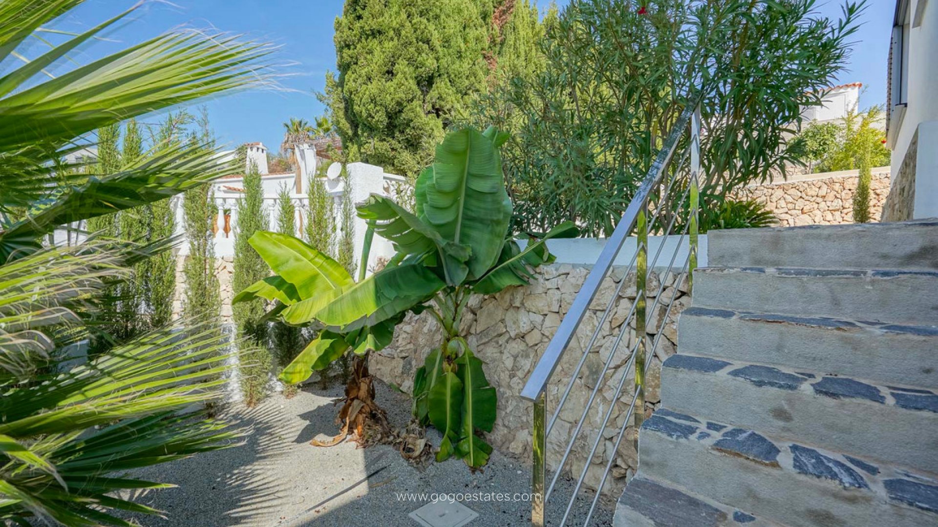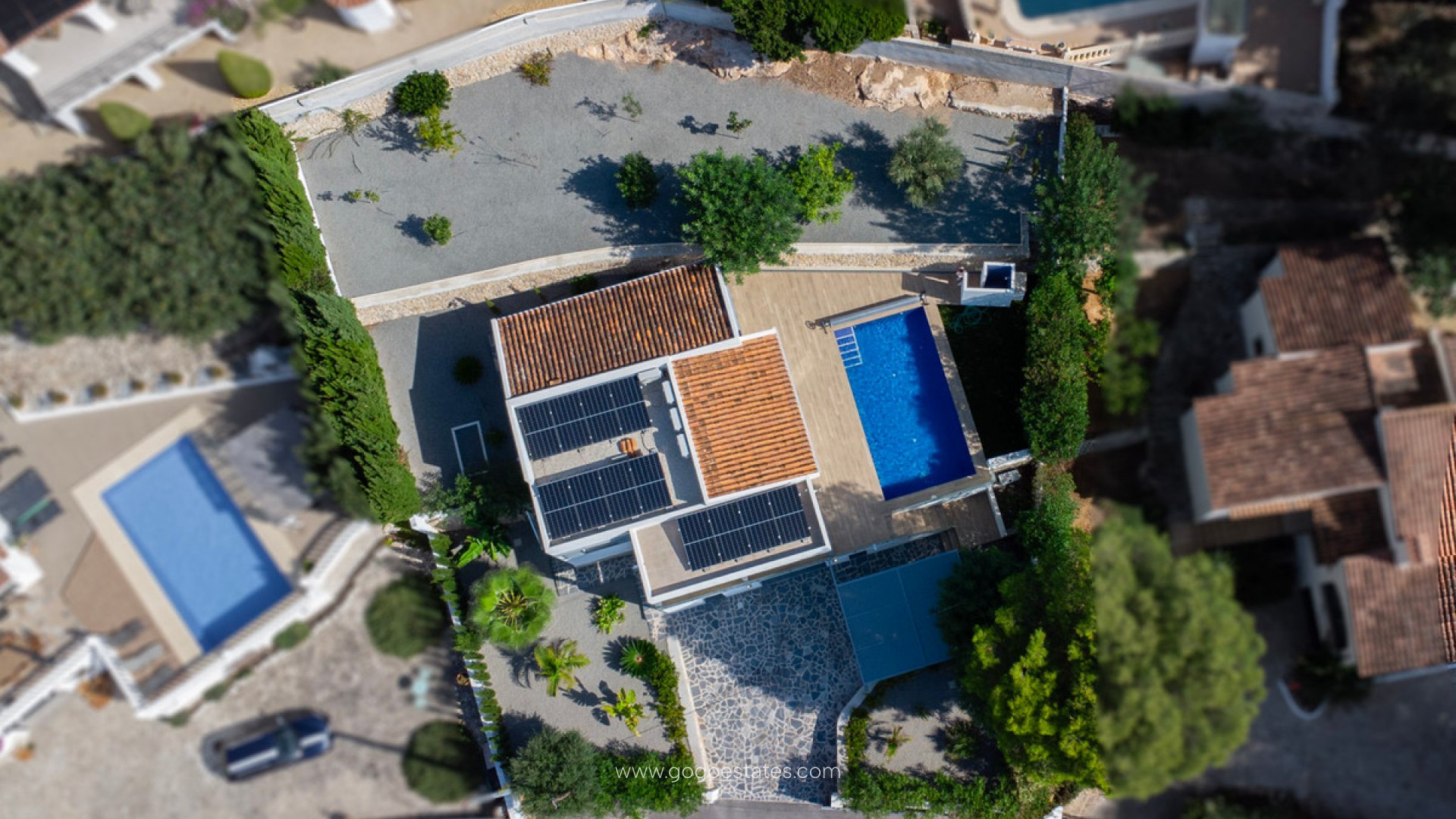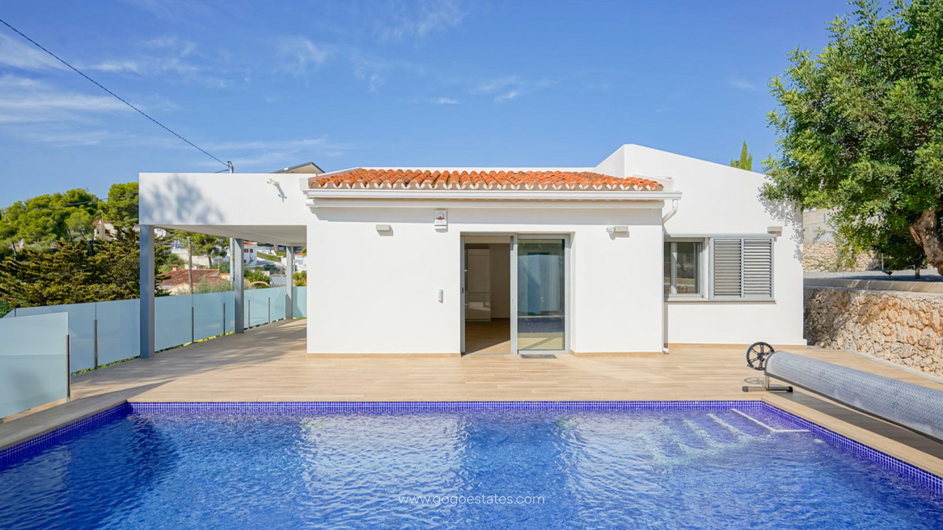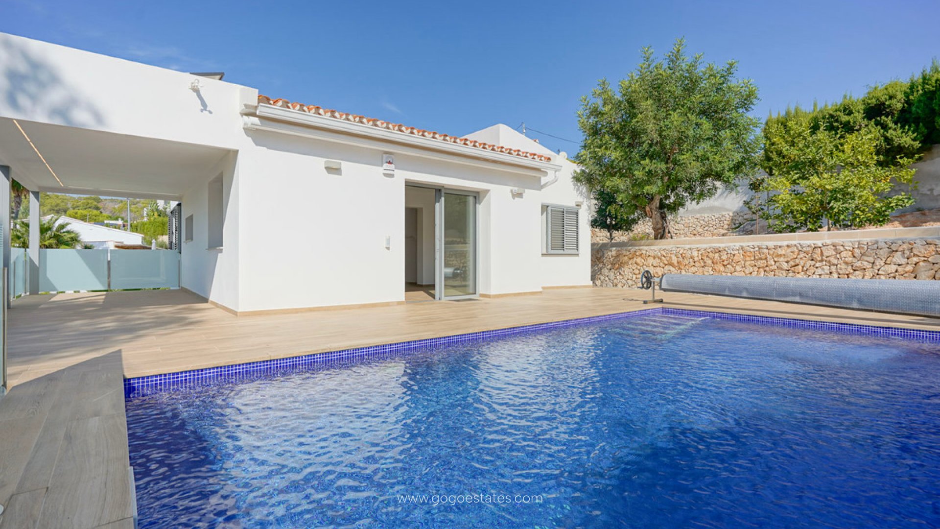 Moderne villa te koop op 1 km van het strand van La Fustera in Benissa, Deze instapklare villa is gelegen in een doodlopende straat in de rustige urbanisatie La Fustera, op slechts één kilometer van de prachtige kustlijn van Benissa. De woning werd in 2023 volledig gerenoveerd en is verdeeld over twee verdiepingen. Het volledige woongedeelte bevindt zich op het niveau van het zwembad en omvat een ruime woon- en eetkamer met open keuken, uitgerust met een multifunctionele Bosch-oven, vaatwasser, koelkast, vriezer en inductiekookplaat. Verder is er een hoofdslaapkamer met en suite badkamer en twee extra slaapkamers die een tweede badkamer delen. Eén verdieping lager, op straatniveau, bevindt zich een ruime garage met aangrenzend een wasruimte, een technische ruimte en een carport. De villa is uitgerust met airconditioning warm/koud, inbouwkasten, rolluiken, muggenramen, glasvezelinternet, een waterfiltersysteem, 12 fotovoltaïsche zonnepanelen en een uitgebreid alarmsysteem met camera's en sensoren. Buiten vindt u een verwarmd zwembad met verwarmde buitendouche, een overdekt terras en een open terras met een luifel voorzien van wind- en regensensor. De woning is omgeven door een mooie, onderhoudsvriendelijke tuin met fruitbomen en mediterrane beplanting. Het levendige centrum van Calpe ligt op slechts 10 minuten rijden, en het charmante havenplaatsje Moraira bereikt u in ongeveer 15 minuten.