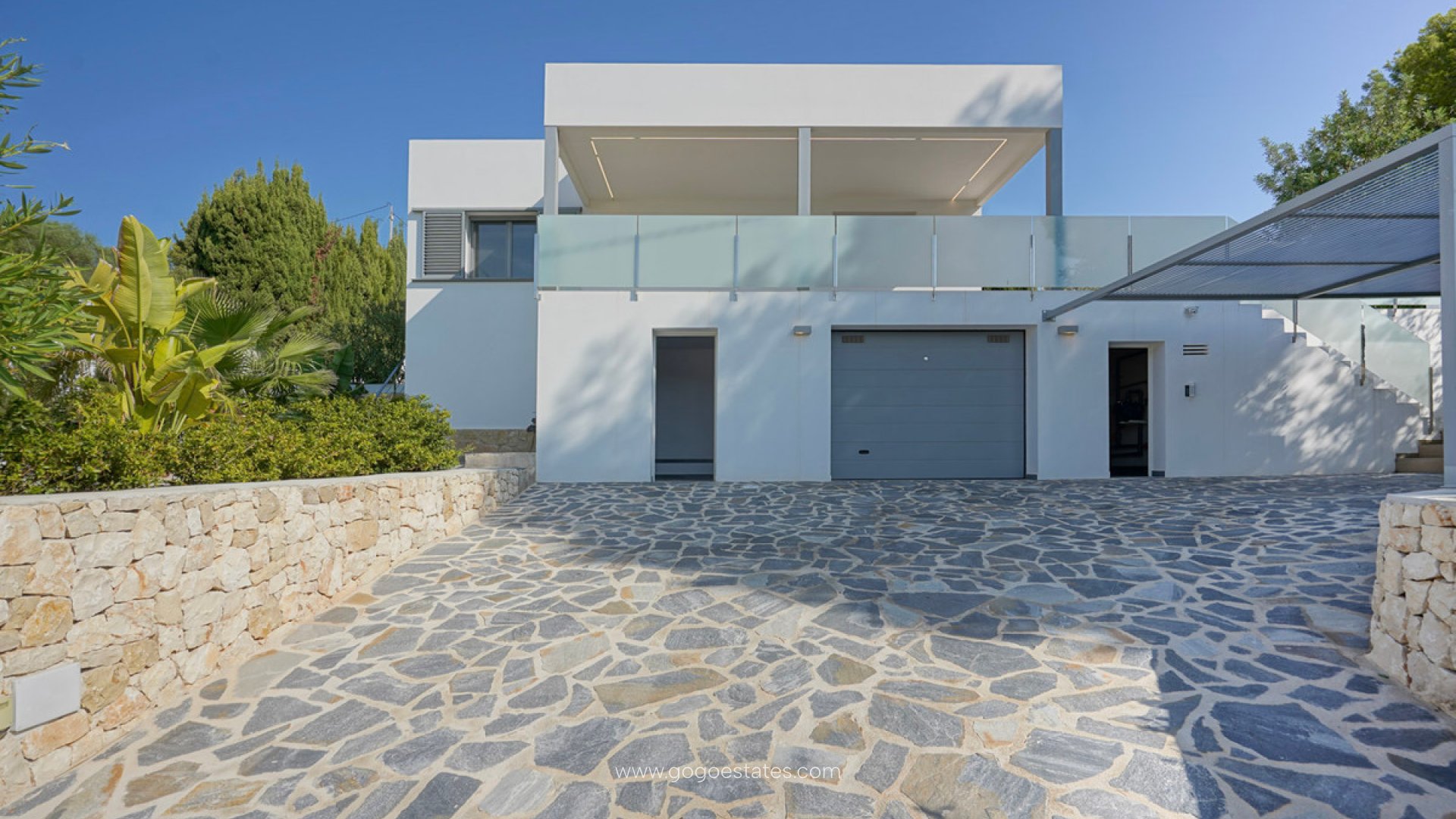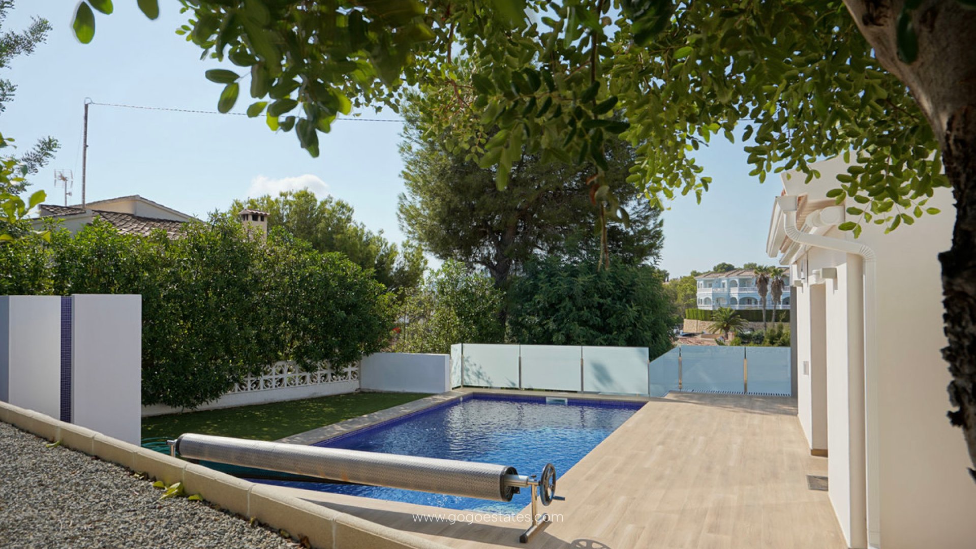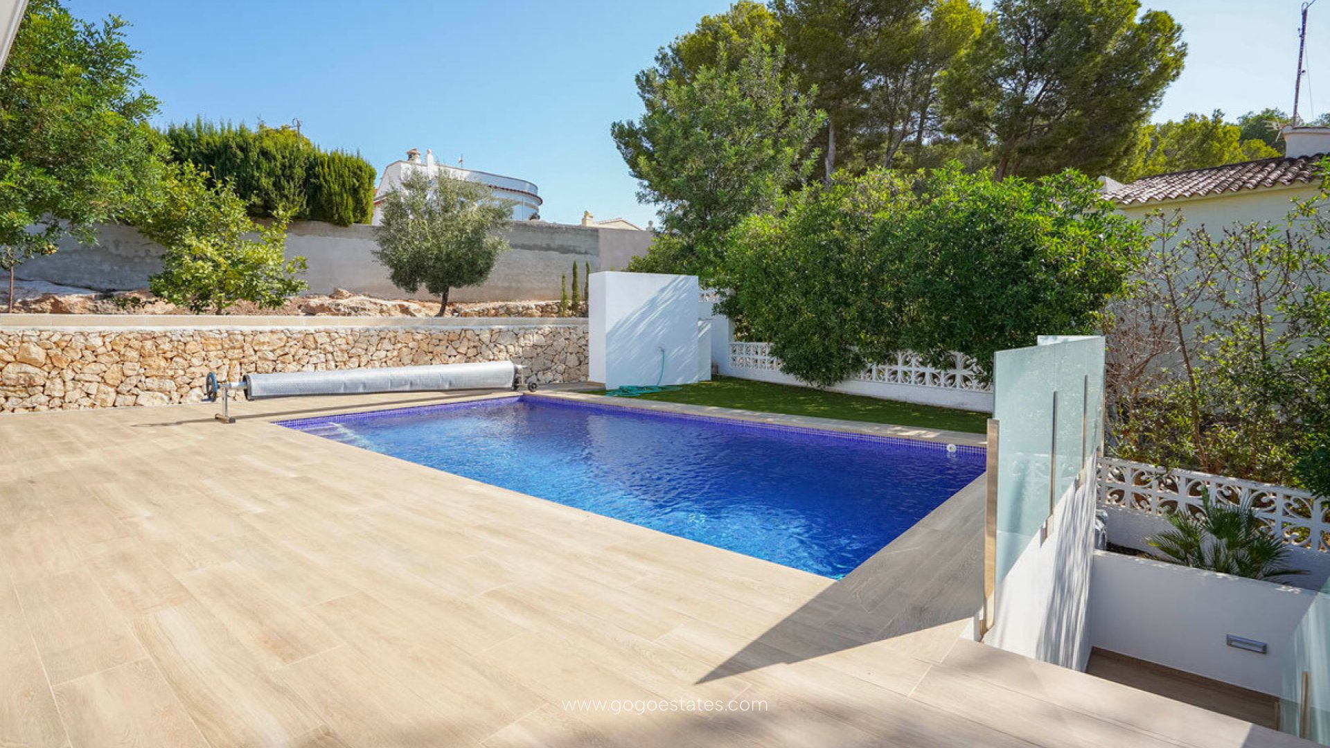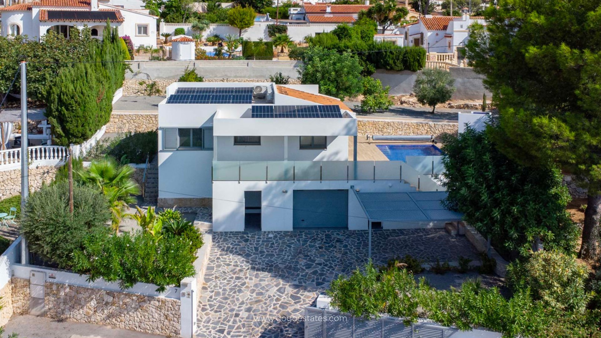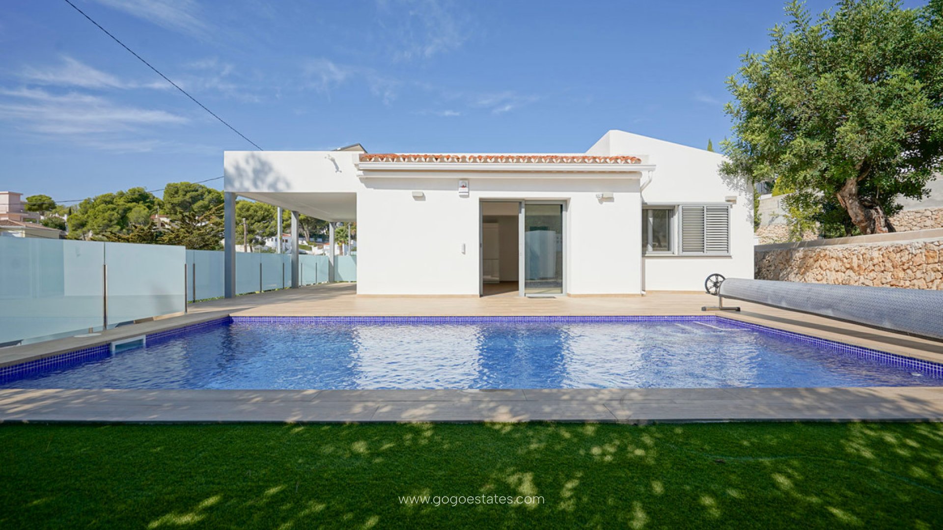 Moderne villa te koop op 1 km van het strand van La Fustera in Benissa, Deze instapklare villa is gelegen in een doodlopende straat in de rustige urbanisatie La Fustera, op slechts één kilometer van de prachtige kustlijn van Benissa. De woning werd in 2023 volledig gerenoveerd en is verdeeld over twee verdiepingen. Het volledige woongedeelte bevindt zich op het niveau van het zwembad en omvat een ruime woon- en eetkamer met open keuken, uitgerust met een multifunctionele Bosch-oven, vaatwasser, koelkast, vriezer en inductiekookplaat. Verder is er een hoofdslaapkamer met en suite badkamer en twee extra slaapkamers die een tweede badkamer delen. Eén verdieping lager, op straatniveau, bevindt zich een ruime garage met aangrenzend een wasruimte, een technische ruimte en een carport. De villa is uitgerust met airconditioning warm/koud, inbouwkasten, rolluiken, muggenramen, glasvezelinternet, een waterfiltersysteem, 12 fotovoltaïsche zonnepanelen en een uitgebreid alarmsysteem met camera's en sensoren. Buiten vindt u een verwarmd zwembad met verwarmde buitendouche, een overdekt terras en een open terras met een luifel voorzien van wind- en regensensor. De woning is omgeven door een mooie, onderhoudsvriendelijke tuin met fruitbomen en mediterrane beplanting. Het levendige centrum van Calpe ligt op slechts 10 minuten rijden, en het charmante havenplaatsje Moraira bereikt u in ongeveer 15 minuten.