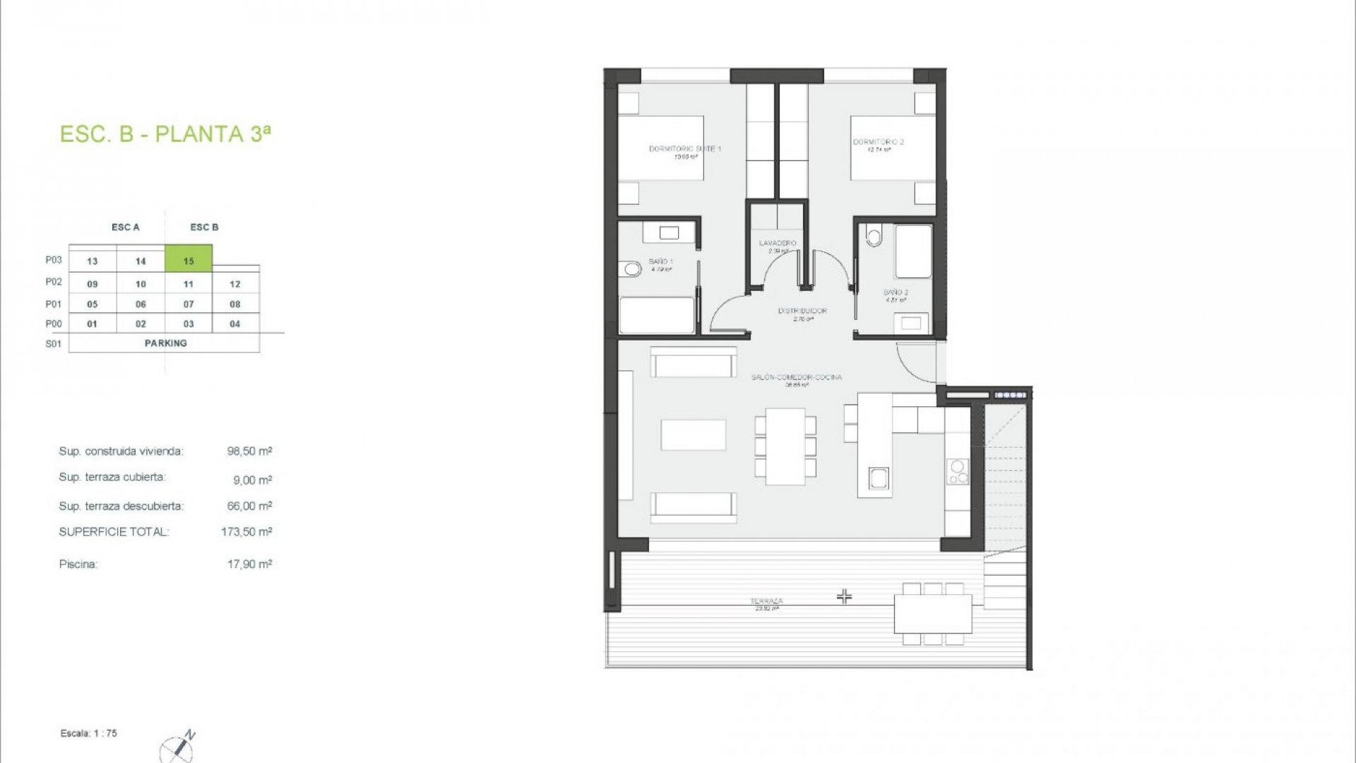 NIEUWBOUW WOONCOMPLEX IN LAS COLINAS GOLF Nieuwbouw ontwikkelingen bestaat uit 15 luxe appartementen met enorme terrassen met uitzicht op de omliggende natuurlijke groene omgeving. We hebben een combinatie gemaakt van moderne en traditionele mediterrane architectuur. Ons idee vanaf het begin is geweest om de appartementen te maken, met een materiële beschrijving met onder andere, vloerverwarming met water, quooker kraan, luchtverversingssysteem, geluidsreducerende plafonds, gelakte keukens, smart home systeem en nog veel meer. Als we de bevoorrechte locatie en het uitzicht in overweging nemen, geloven we dat het complex de ideale omstandigheden biedt om te voldoen aan de criteria van klanten met een verfijnde smaak. De derde verdieping bestaat uit 3 appartementen: 2 appartementen hebben 3 slaapkamers, 3 badkamers en een gastentoilet en 1 appartement heeft 2 slaapkamers en 2 badkamers. Vanuit de appartementen heeft u directe toegang tot grote terrassen op hetzelfde niveau als het appartement. Verder is er een trap naar het solarium, waar elk appartement op de bovenste verdieping een privé zwembad heeft, een toilet, een buitenkeuken met een kleine lift vanuit de keuken beneden en nog veel meer. Op Las Colinas Golf & Country Club vindt u verder een breed scala aan voorzieningen voor de eigenaren zoals tennis, padel-tennis, fitness, massage, golf, trekking en nog veel meer. Binnen Las Colinas Golf & Country Club vindt u ook een aantal restaurants en een minimarkt met vers gebakken brood en nog veel meer. U zult genieten van 200.000 vierkante meter prachtige mediterrane landschappen en u zult prachtige wandelingen kunnen maken door de weelderige inheemse flora en de uitgestrekte velden met sinaasappel- en citroenboomgaarden. Complex gelegen op 40 minuten van de luchthaven van Alicante en 1 uur van de luchthaven van Murcia - Corvera.