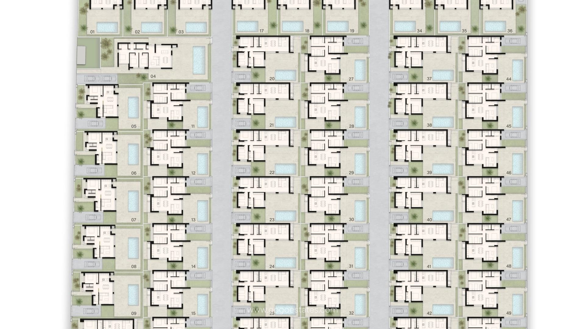 Villa's: Onafhankelijke woningen met drie slaapkamers en 2/3 badkamers, beschikbaar met één of twee verdiepingen. Elke villa heeft een privézwembad, een solarium en parkeergelegenheid op het perceel. Optionele kelders zijn ook beschikbaar.