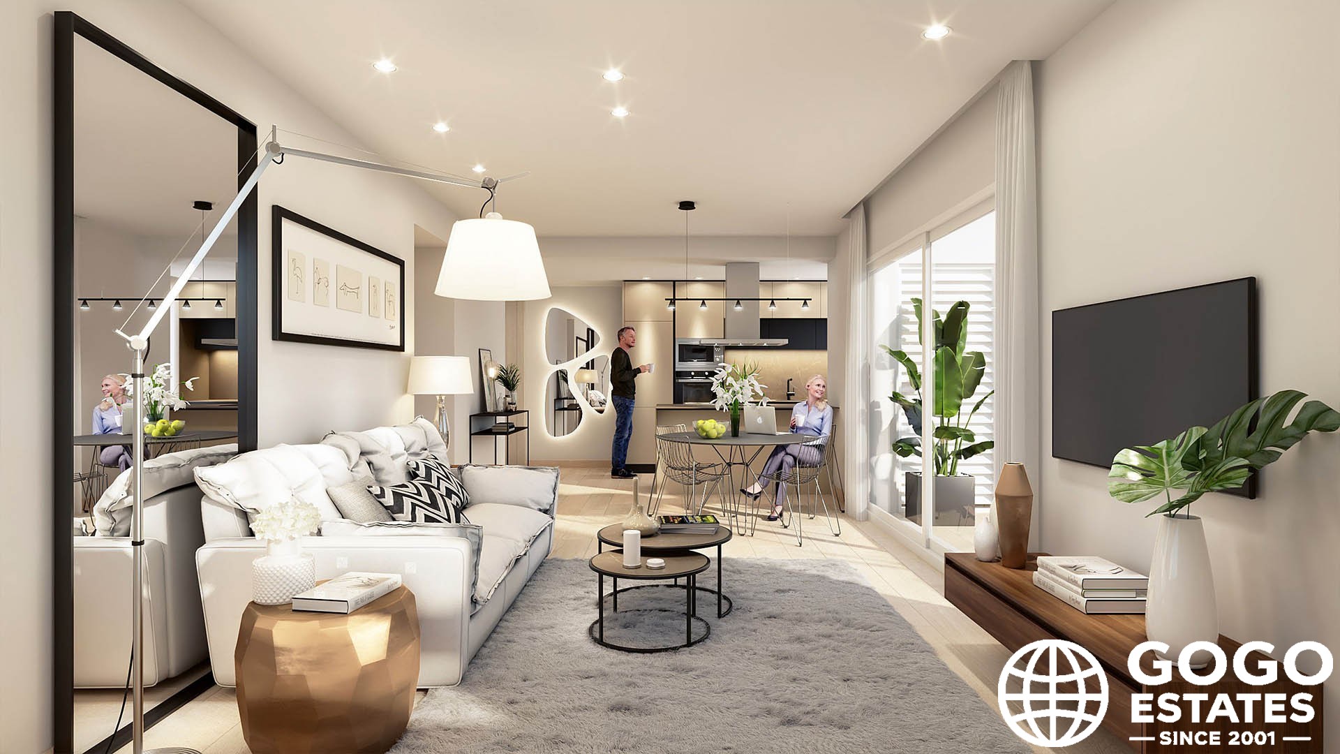 Het interieur is ontworpen om natuurlijk licht te maximaliseren, met moderne apparaten en hoogwaardige afwerkingen zoals keramische vloeren en inbouwkasten. De open keuken sluit naadloos aan op de woonruimtes, wat de interactie en entertainment bevordert.