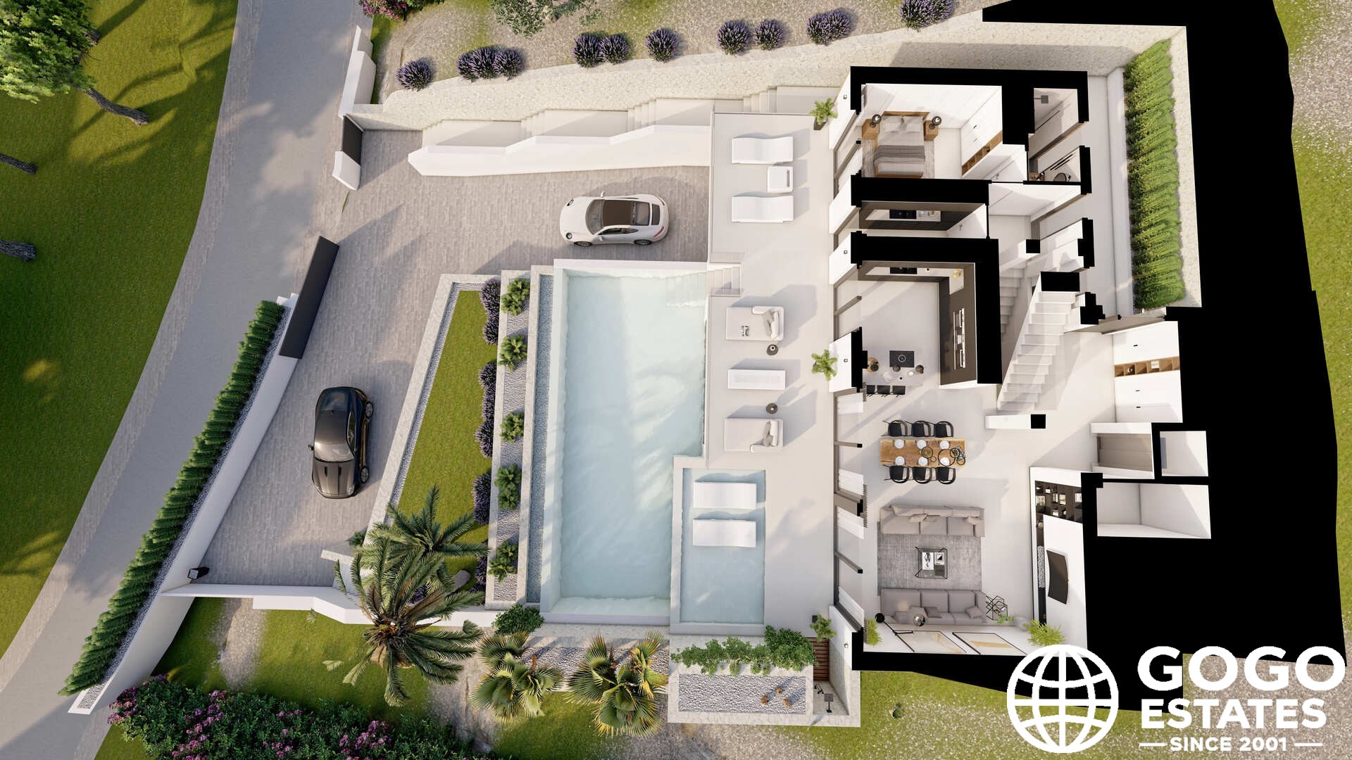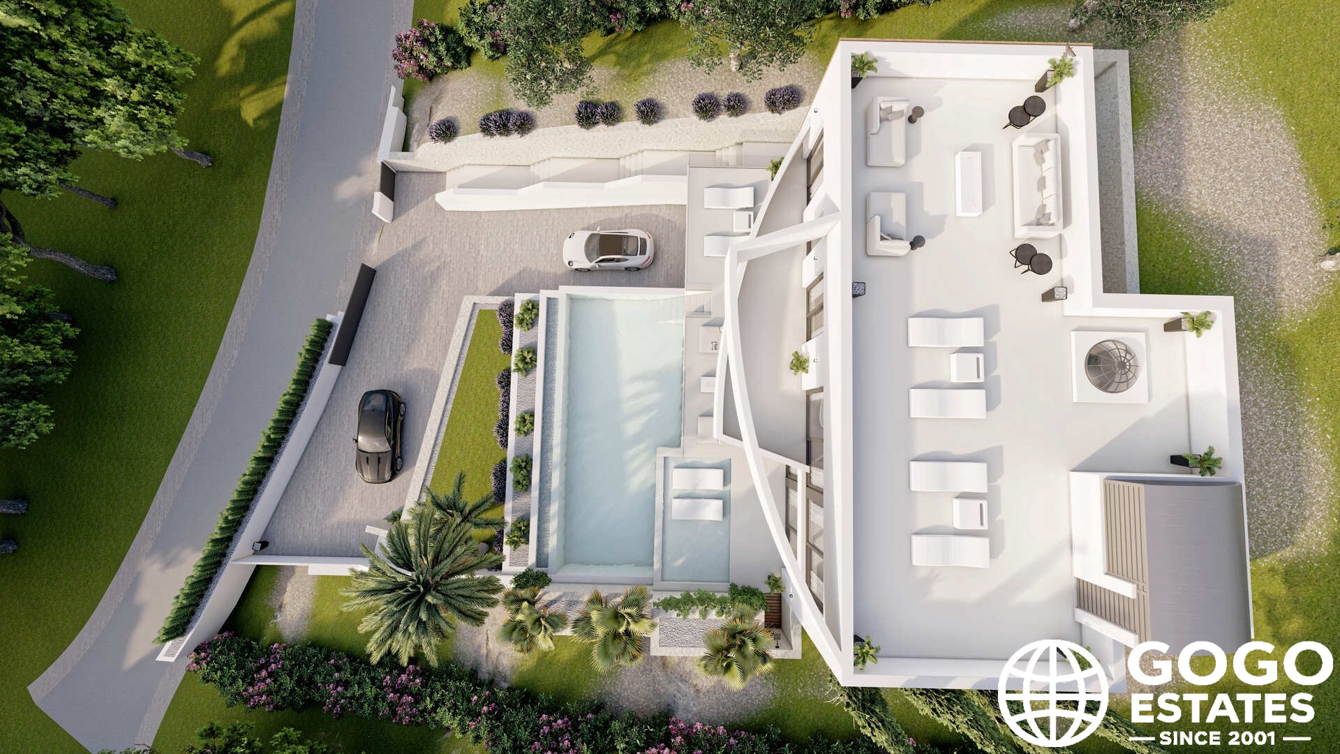 De buitenkant is ontworpen om optimaal te genieten van het mediterrane klimaat. Het beschikt over een privé-tuin, een terras dat perfect is voor dineren in de open lucht, en een solarium om te zonnen. Een privézwembad voegt een vleugje luxe toe.