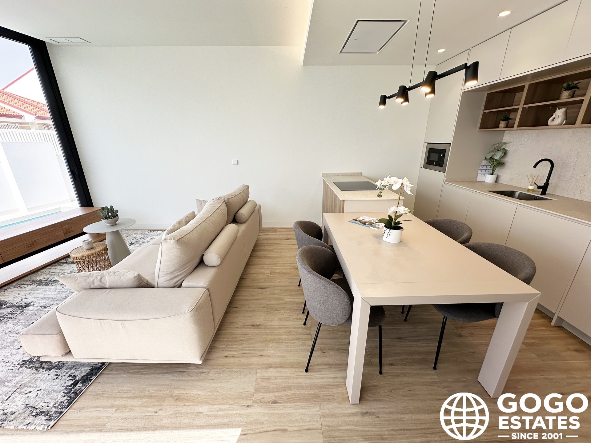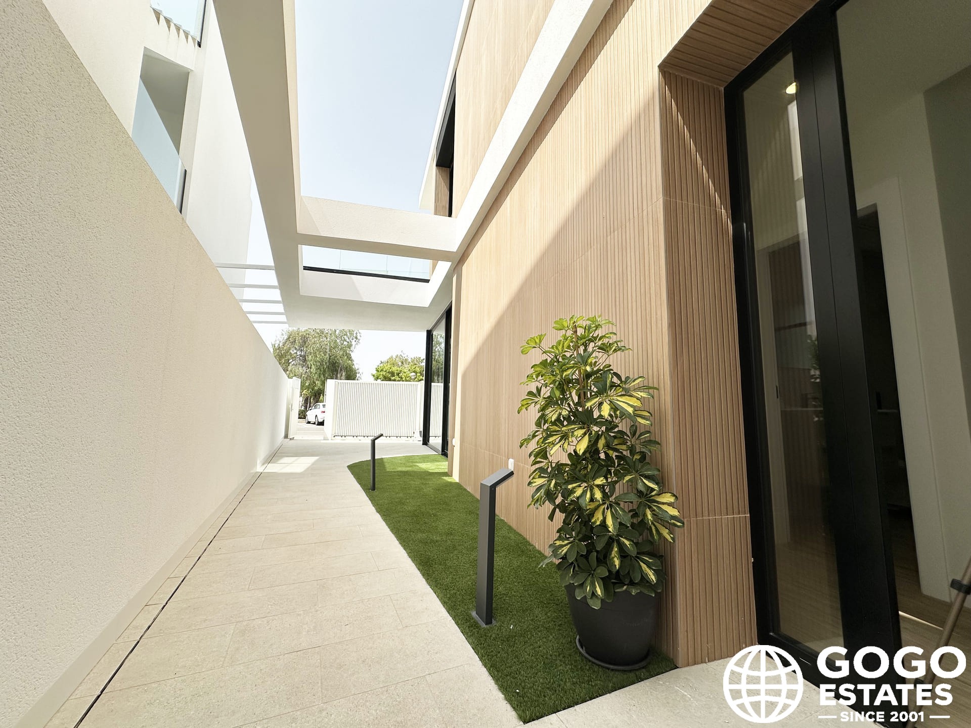 De buitenkant van deze woningen is ontworpen voor ontspanning en buitenplezier. Elke woning beschikt over een privétuin, terras, solarium en een pergola. Een privézwembad voegt een exclusieve ruimte voor ontspanning toe.