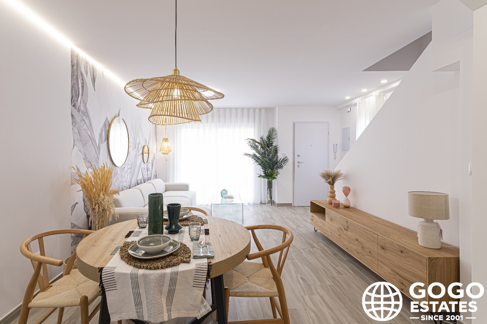 Het interieur van de rijtjeshuizen is ontworpen om comfort en stijl te bieden. Elk huis is uitgerust met inbouwkasten die de opbergruimte optimaliseren. De badkamers zijn ontworpen om functionaliteit en comfort te bieden. De betegelde vloeren voegen een moderne touch toe en zijn gemakkelijk te onderhouden, ideaal voor leven aan zee.