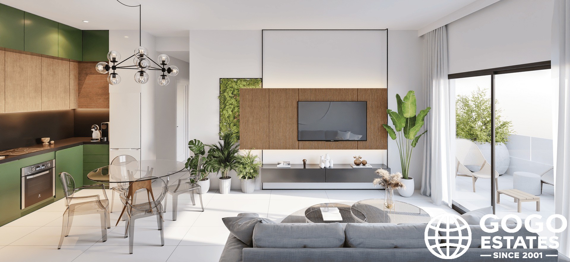 De interieurs zijn zorgvuldig ontworpen om een gezellige ruimte te bieden. Appartementen en woningen op de begane grond zijn uitgerust met porseleinen tegels, wat een elegante uitstraling geeft. Elke woning heeft 2 of 3 slaapkamers met inbouwkasten en 2 badkamers, wat comfort en privacy garandeert. De voorbereidende installatie van airconditioning stelt bewoners in staat om het binnenklimaat aan te passen.