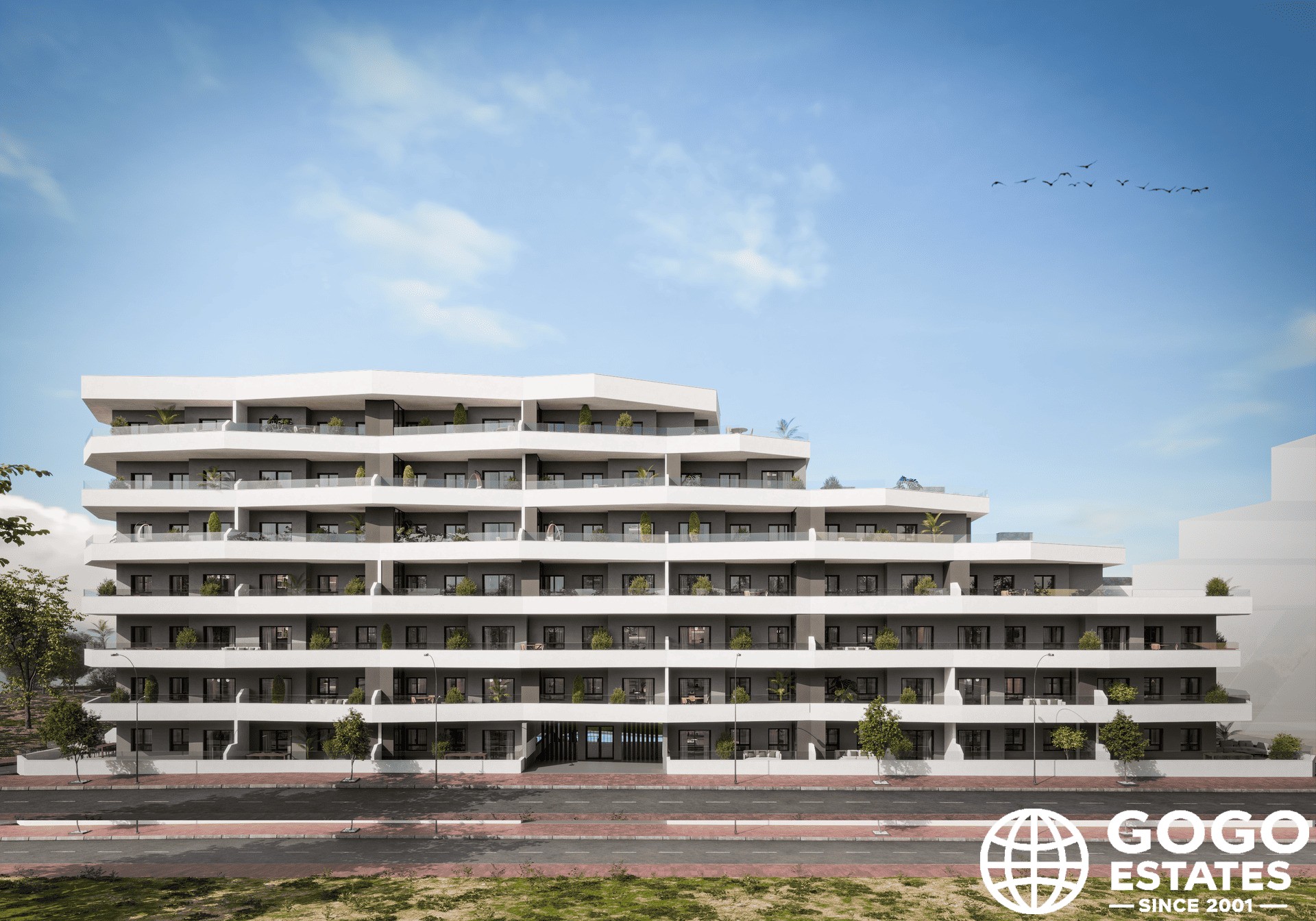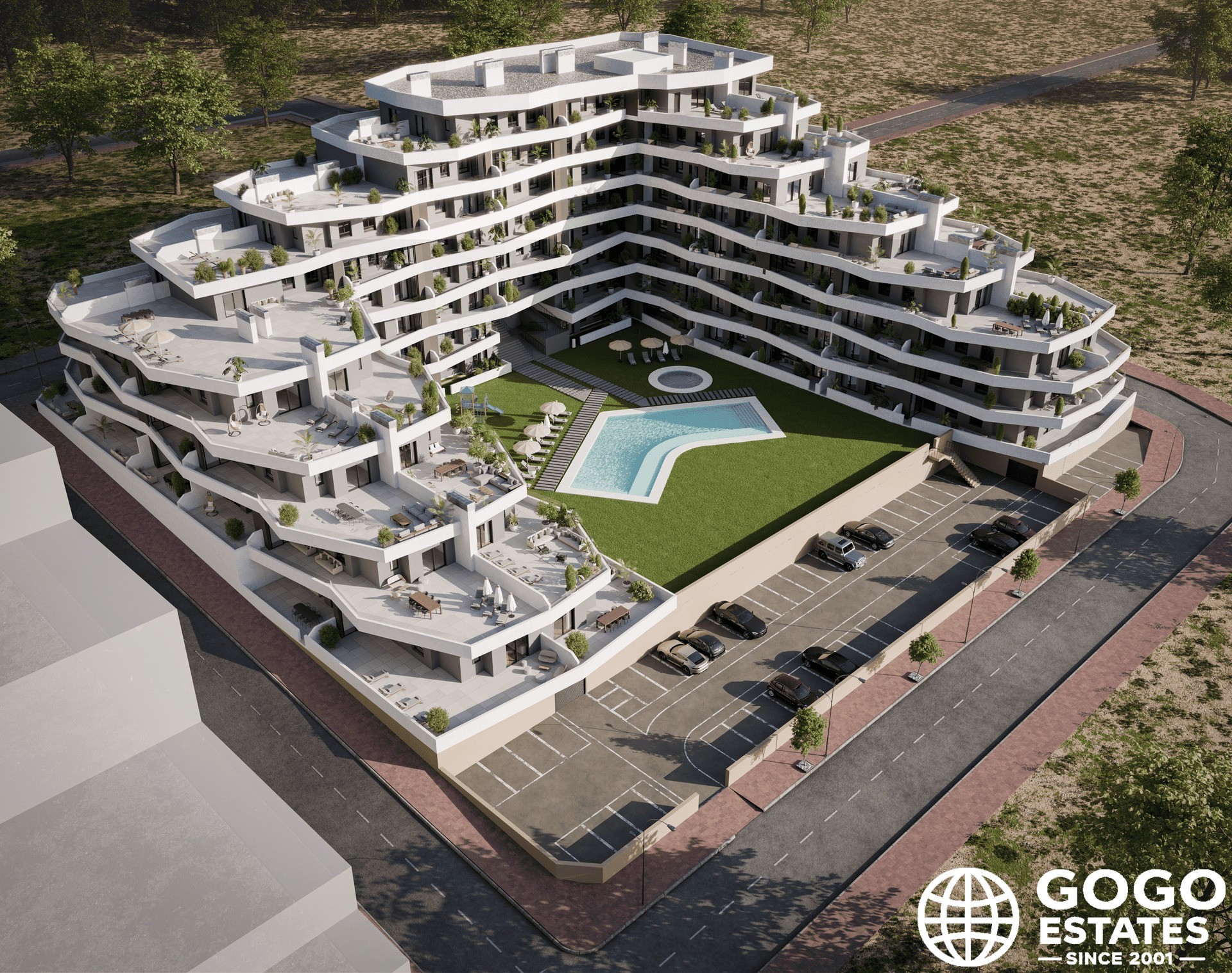 De exterieurs zijn ontworpen om een gastvrije en functionele omgeving te bieden. Elke woning beschikt over een privéterras, ideaal om te genieten van het Mediterrane klimaat en het uitzicht op zee. Veel woningen hebben een privé-tuin, wat extra ruimte biedt voor buitenrecreatie. De gemeenschappelijke garage zorgt ervoor dat bewoners een veilige plek hebben om te parkeren.