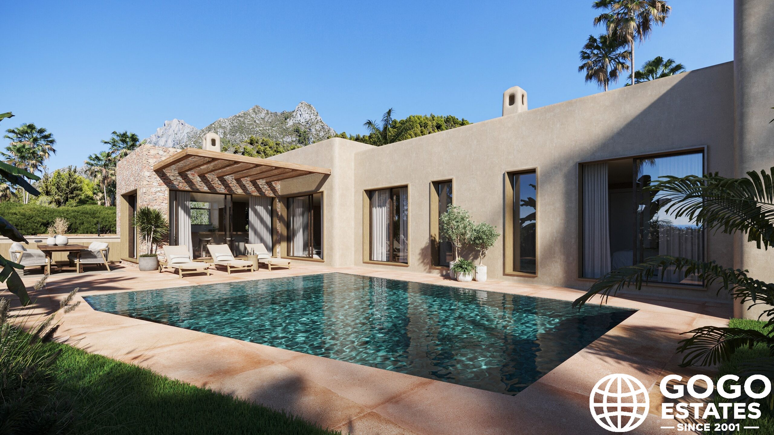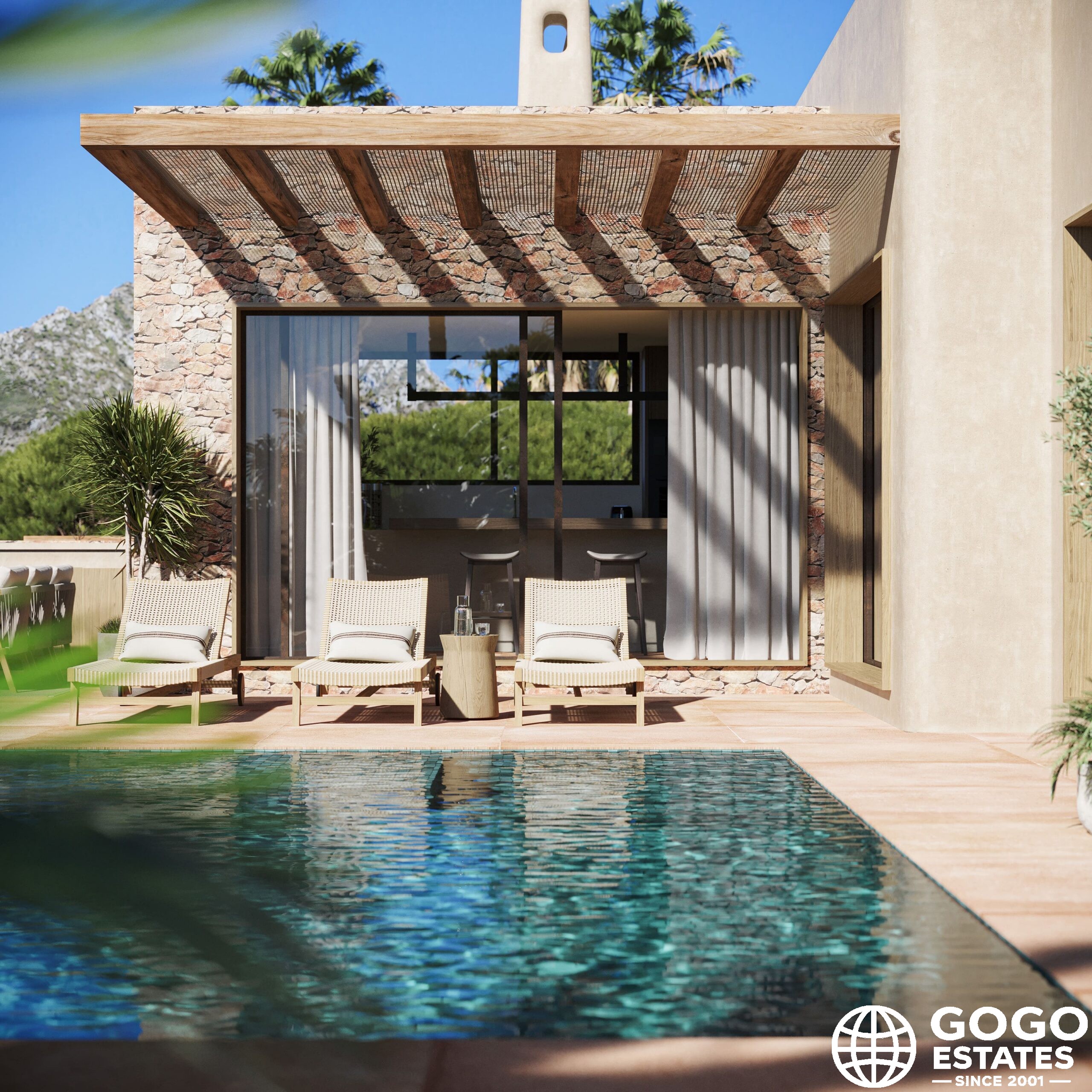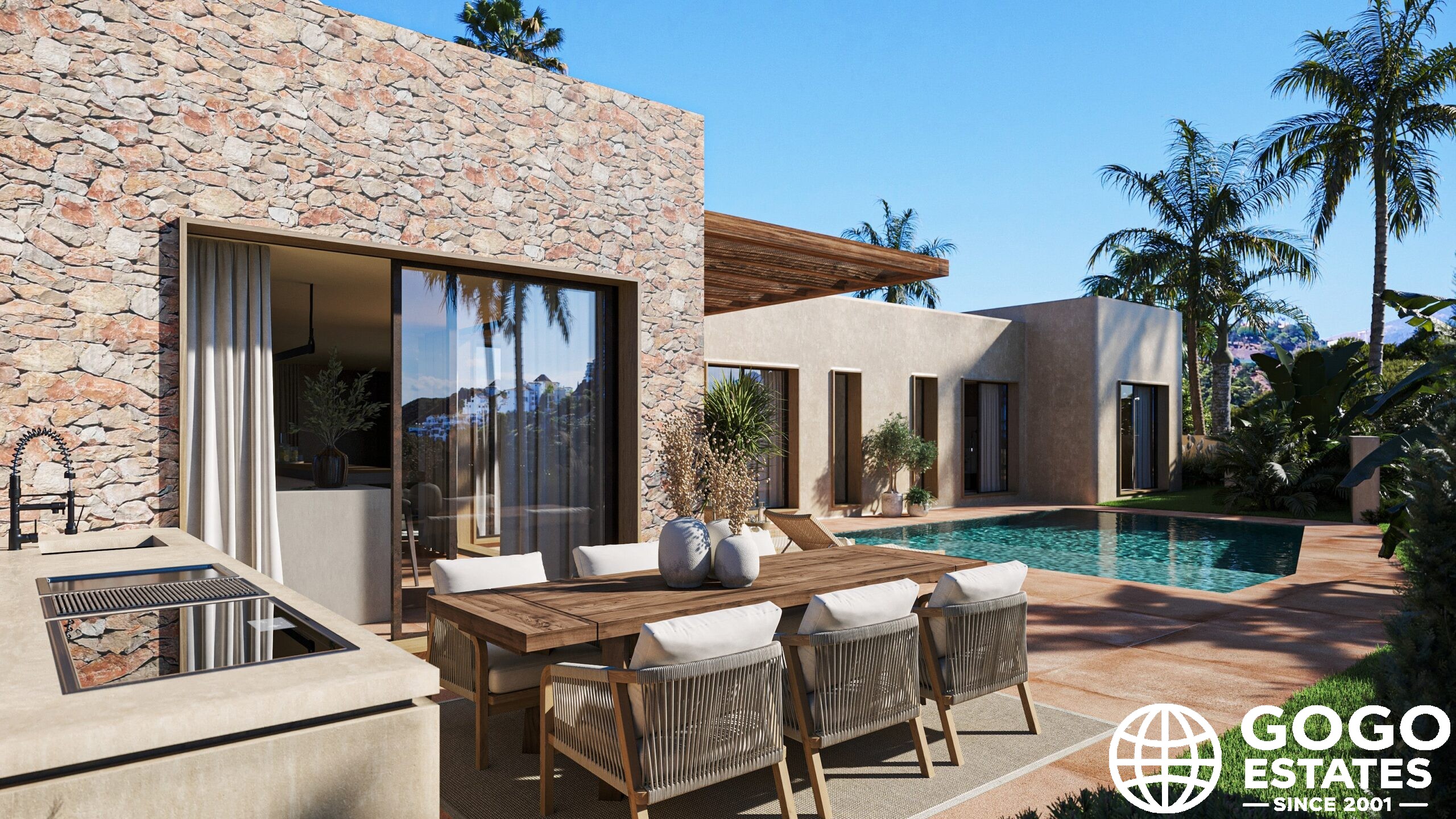 Obszary zewnętrzne obejmują prywatny ogród, pergolę do jedzenia w cieniu oraz prywatny basen. Taras wyposażony jest w grill i zadaszoną przestrzeń, idealną do korzystania z klimatu śródziemnomorskiego.