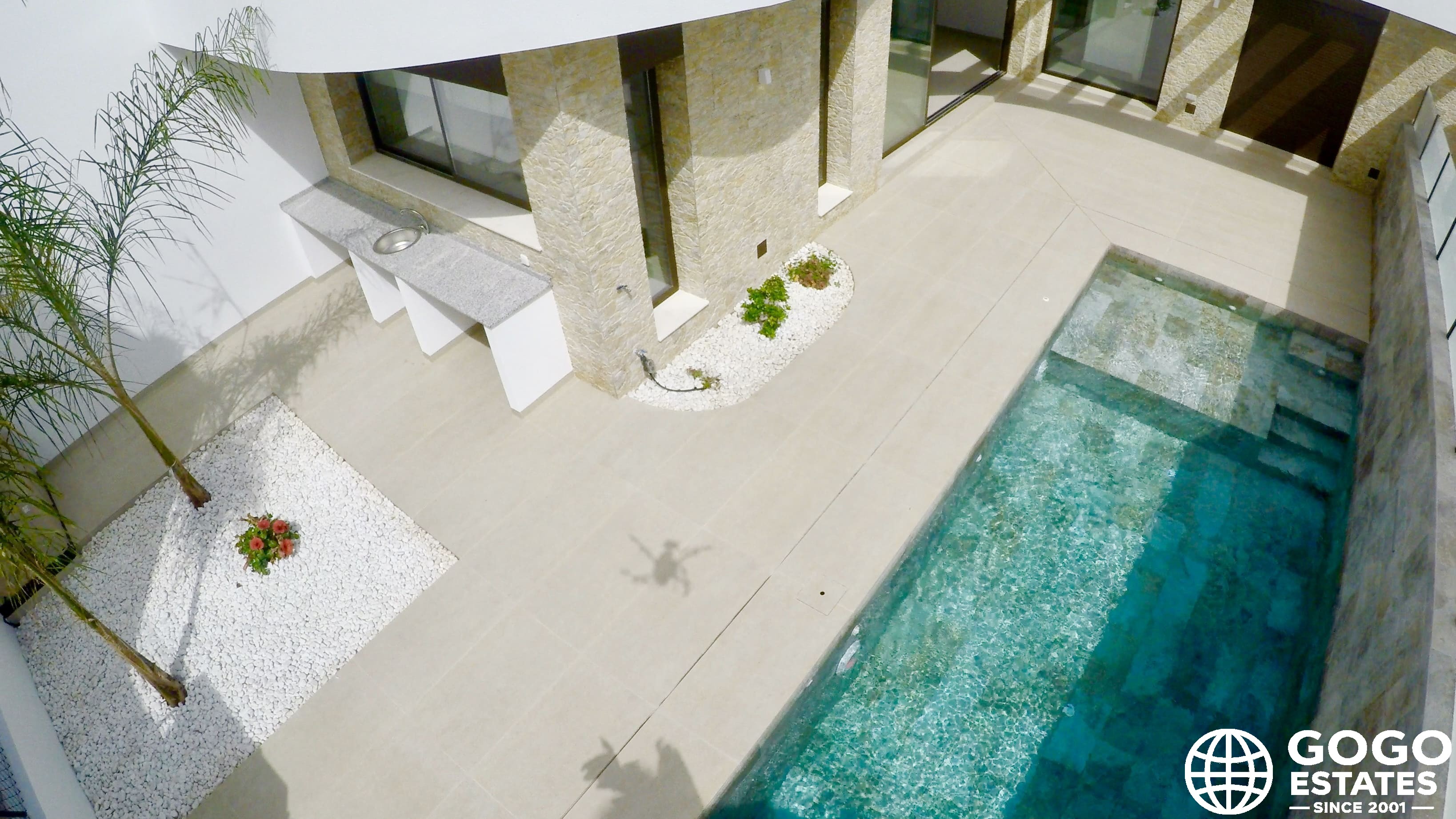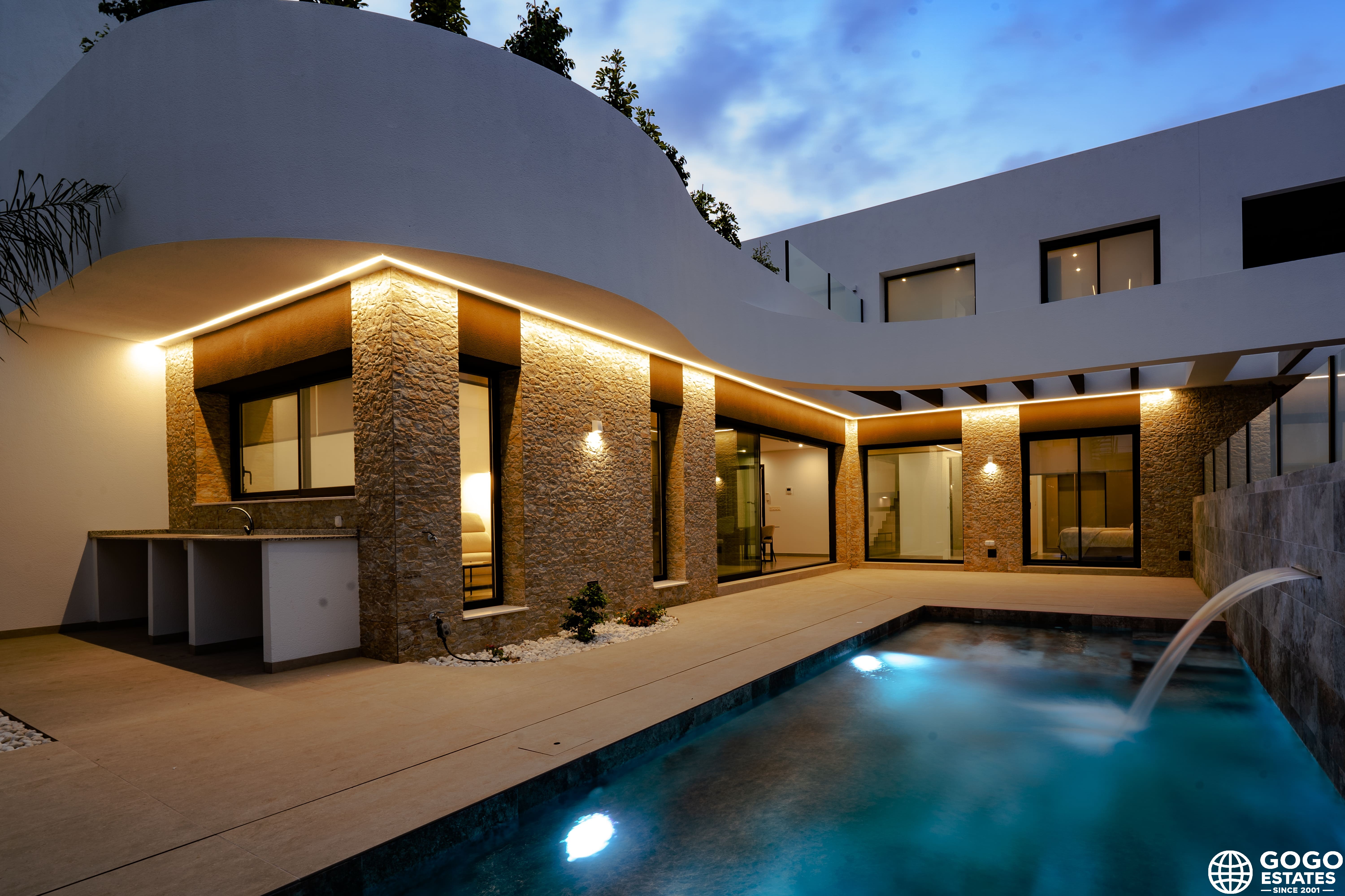 Przestrzenie zewnętrzne zostały zaprojektowane w celu maksymalizacji przyjemności z klimatu śródziemnomorskiego. Każda nieruchomość ma prywatny ogród, idealny do stworzenia osobistej oazy lub cieszenia się aktywnościami na świeżym powietrzu. Pergola zapewnia cień i idealną przestrzeń do relaksu lub przyjmowania gości. Dodatkowo, każdy dom ma prywatny basen, oferujący orzeźwiające miejsce na walkę z letnim upałem.