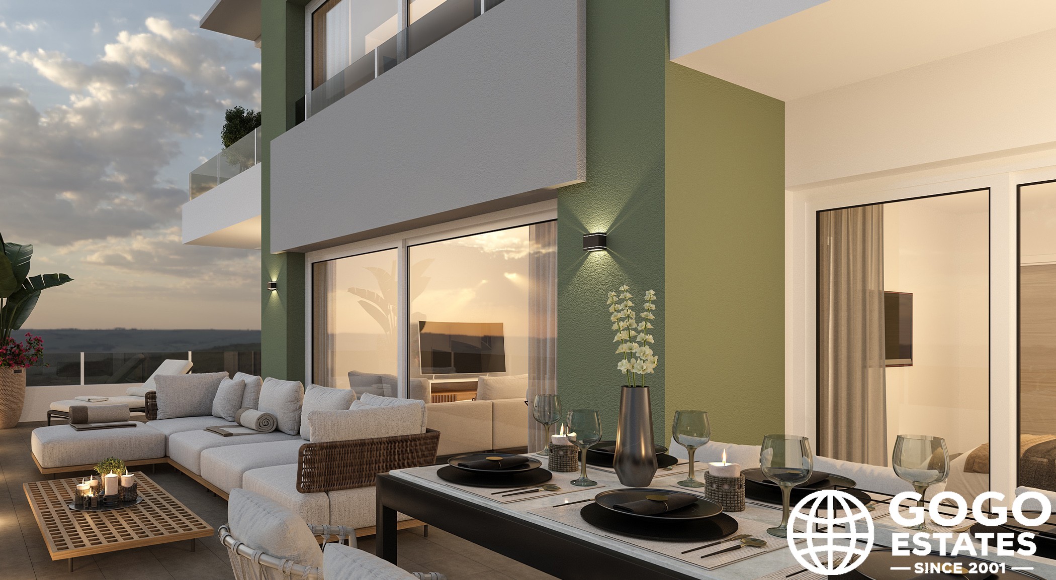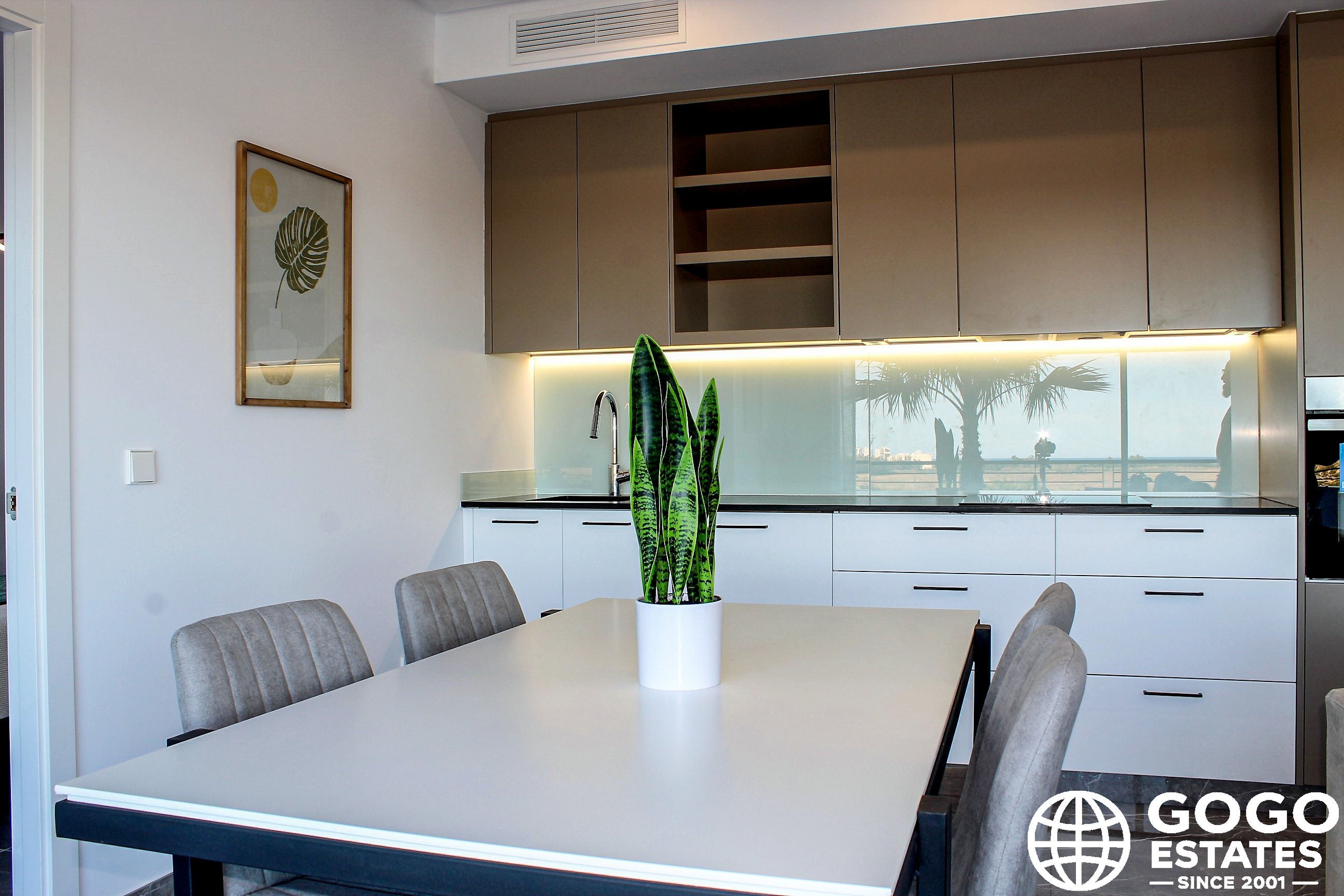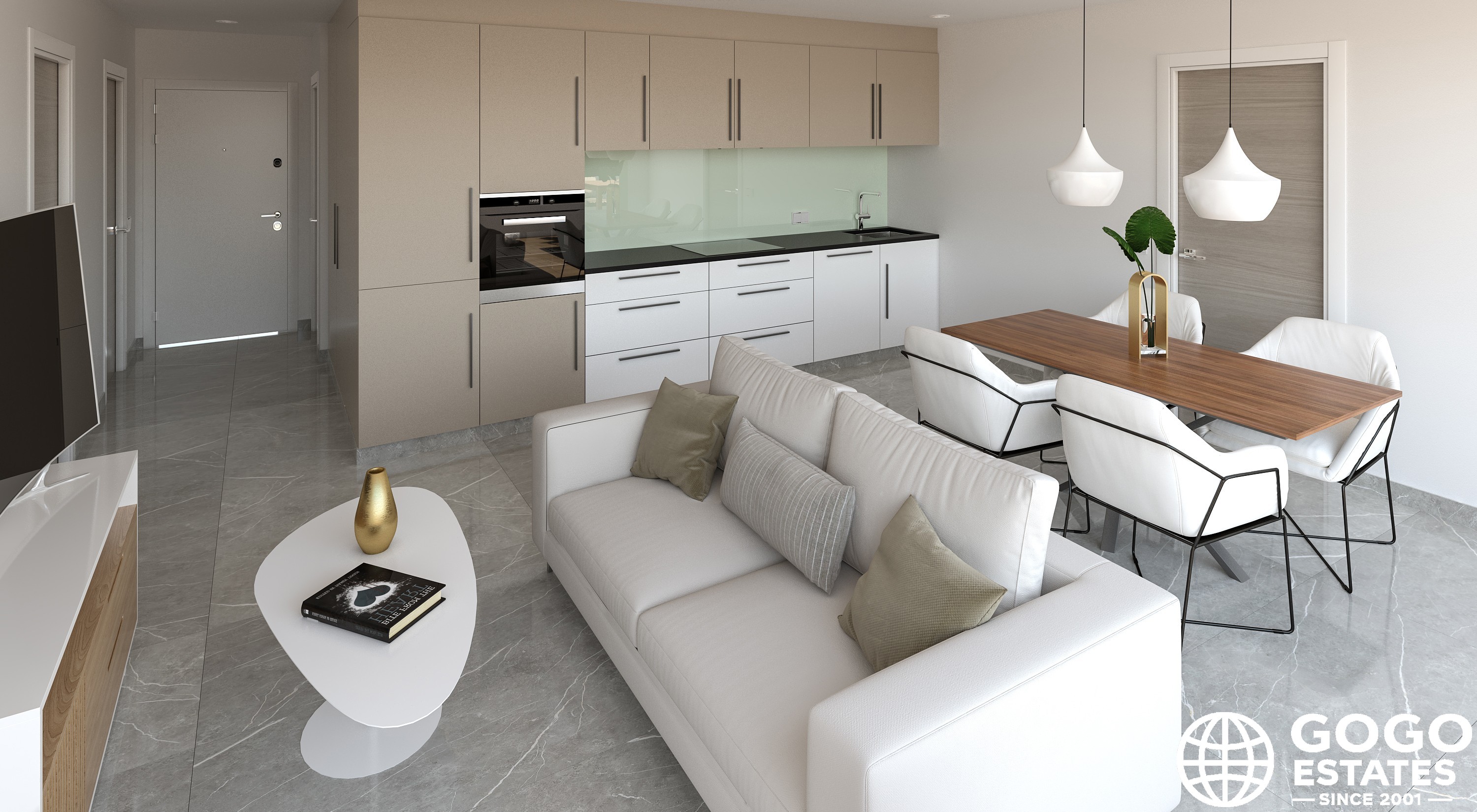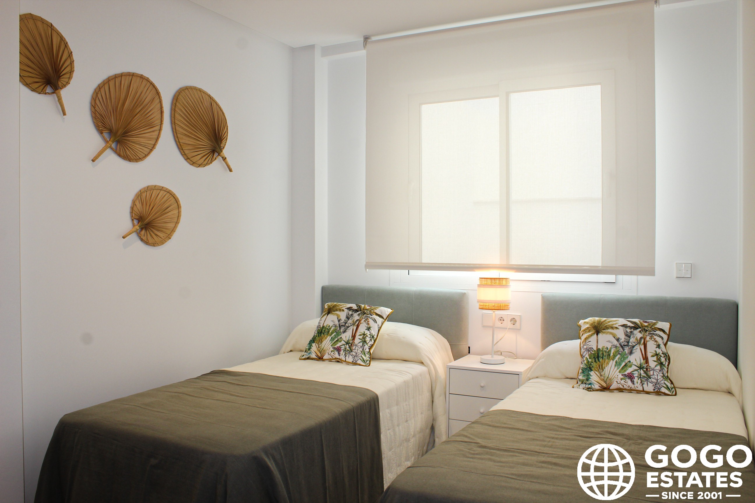 Wnętrza są umeblowane, z połączeniem podłóg ceramicznych, kafelkowych i laminowanych. Nowoczesne udogodnienia obejmują elektryczne rolety, wideodomofon, ogrzewanie podłogowe i wstępnie zainstalowaną klimatyzację. Wbudowane szafy i wliczone w cenę urządzenia ułatwiają wprowadzenie się.