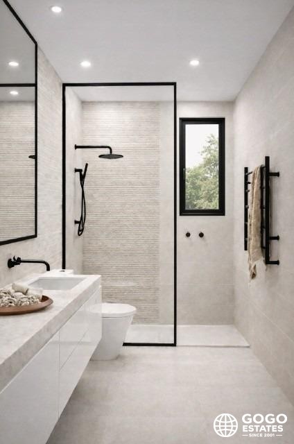 Wewnątrz mieszkanie wyposażone jest w nowoczesne udogodnienia, takie jak podłogi z porcelanowego kamienia i wstępnie zainstalowana klimatyzacja, co zapewnia komfort i styl. Wbudowane szafy oferują praktyczne rozwiązania do przechowywania.