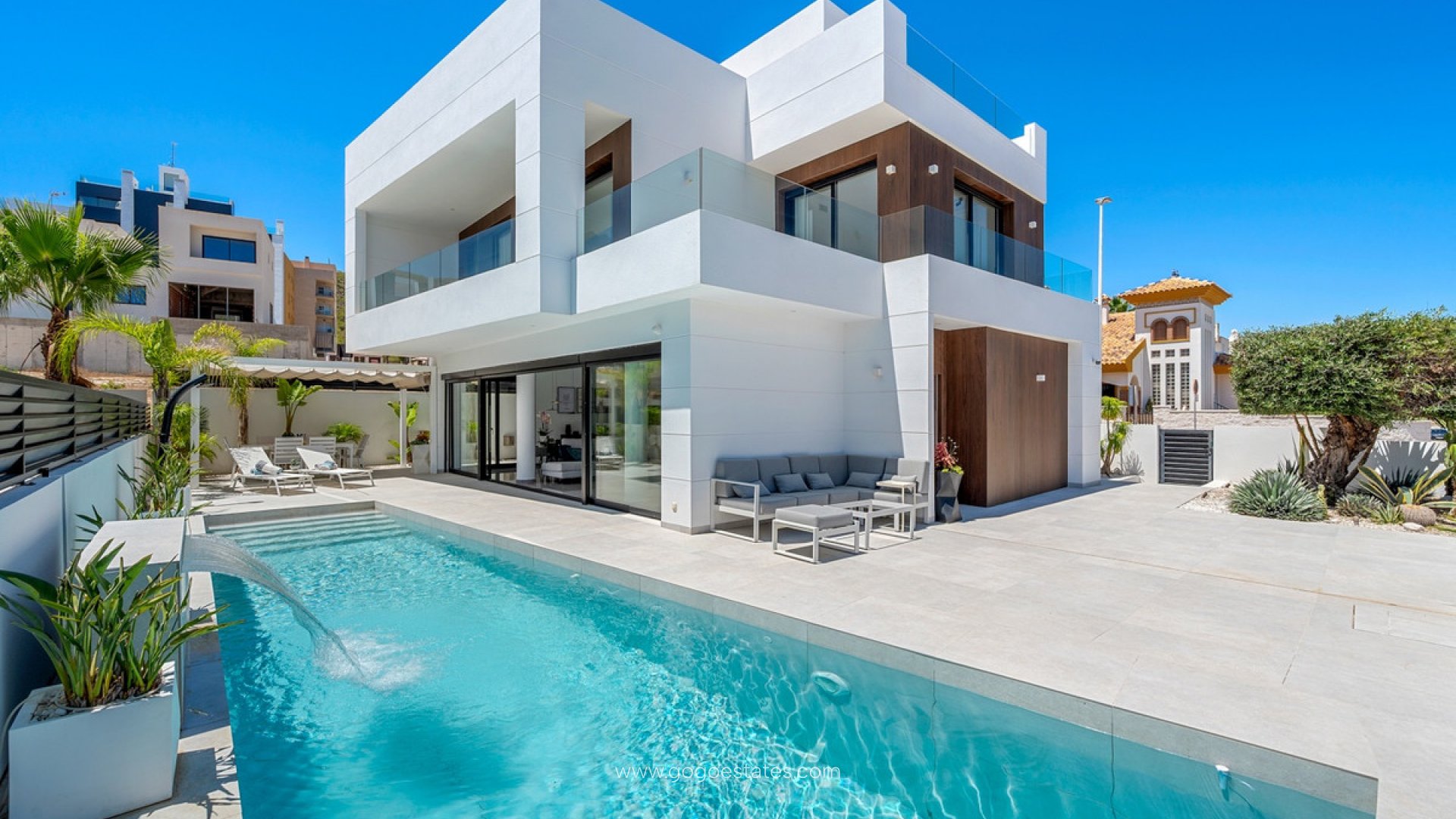 Situated on a 347m² plot, this contemporary villa—built in 2019—offers a refined blend of modern architecture and comfortable living. Spanning 194m² across three levels, the home features four generously sized bedrooms and three bathrooms, with a layout designed for both privacy and functionality. The open-plan kitchen flows into the dining and living areas, creating a bright, spacious environment with direct access to the garden and terrace through large sliding glass doors, inviting natural light throughout the day. The main entrance is positioned on the north side of the property, while the garden and pool area enjoy a sunny south-facing orientation. Outside, the 36m² private swimming pool serves as a focal point, surrounded by clean, modern landscaping and a selection of lounging and dining areas. A pergola provides a shaded retreat for outdoor meals, and a covered terrace extends the living space outdoors. The rooftop solarium offers open views and a relaxing spot to enjoy the surrounding environment, including partial sea views. Upstairs, the primary suite includes a walk-in closet and access to a private balcony, while two additional bedrooms with built-in wardrobes complete the upper level. A fourth bedroom is located on the ground floor, ideal for guests or flexible use. Additional conveniences include a separate laundry room, a storage area, and private parking on the plot. With its thoughtful layout, quality finishes, and excellent orientation, this home presents a modern lifestyle just minutes from the sea.