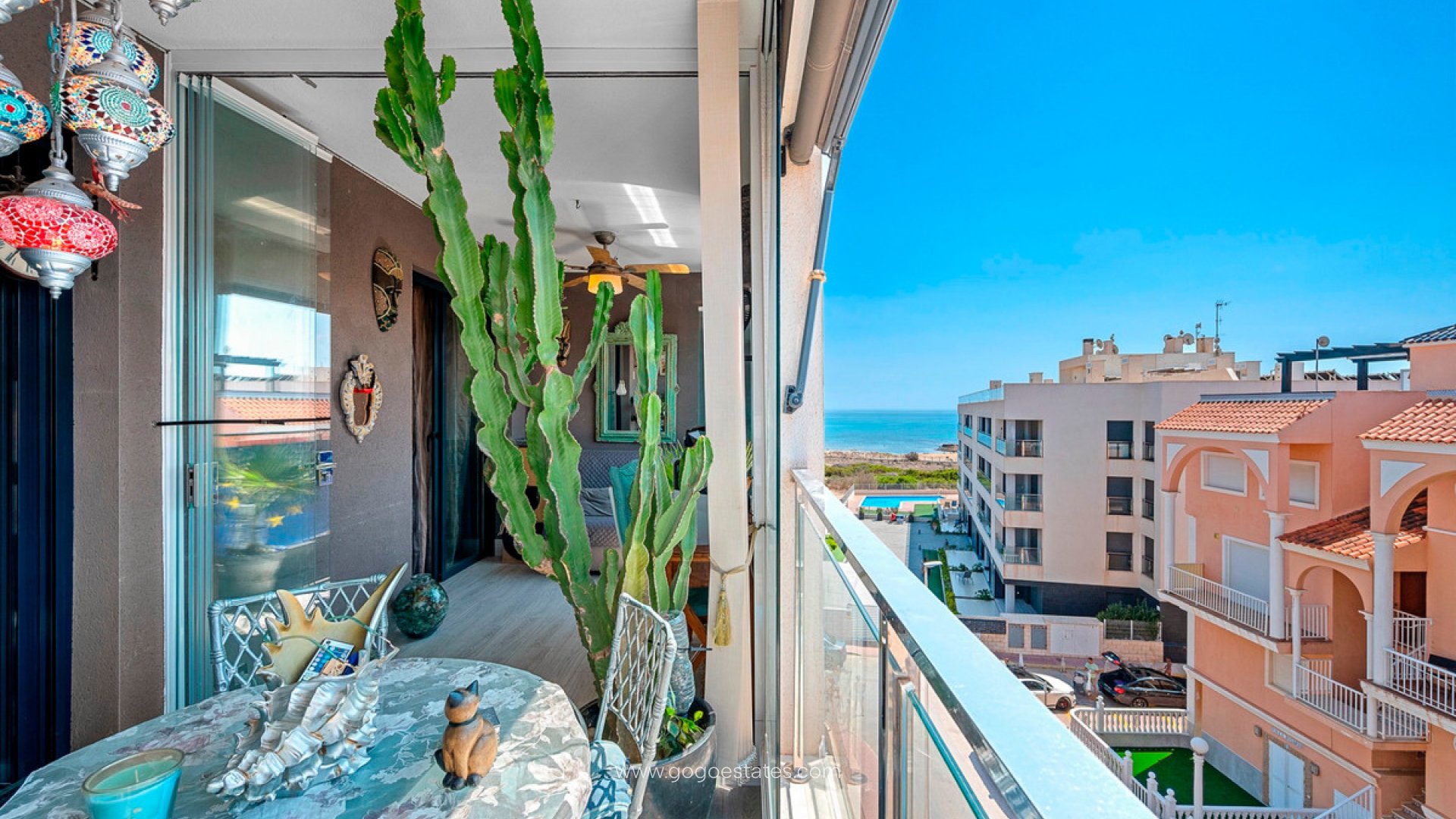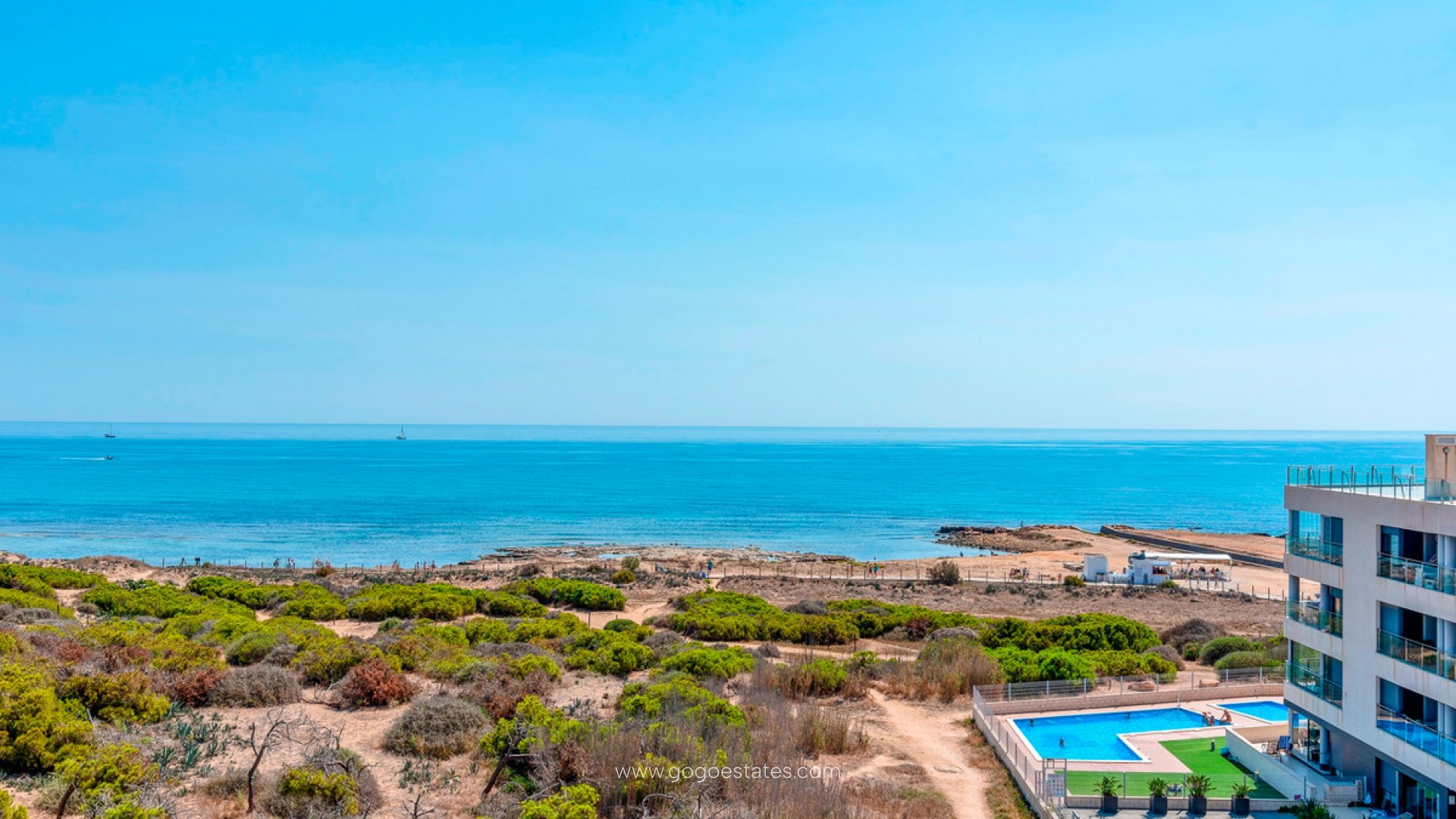 This one-bedroom, two-bathroom penthouse offers a comfortable and functional design, ideal as a permanent home, holiday property or investment. The bright living-dining room connects to a continuous balcony. The main bedroom also has access to another balcony of the same style, separated by a retractable glass wall that allows them to remain independent or be joined together into one large outdoor space as desired. The open-plan kitchen integrates with the dining area and foyer, maximizing the layout. The master bedroom includes an en-suite bathroom, while a second independent bathroom adds further convenience. The residential complex has two communal swimming pools, and the property includes a private garage. Located in La Mata, Torrevieja, this penthouse is close to essential services, transport, and the beaches of the Costa Blanca.