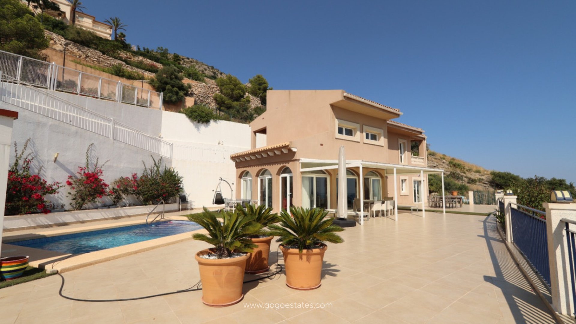 This charming property combines Mediterranean style with a privileged location. On the ground floor, we find a bright kitchen, a cozy living-dining room, a courtesy bathroom, a bedroom with a dressing room and en-suite bathroom, as well as a storage room. The upper floor has two bedrooms that share a full bathroom, with independent access from the outside, providing flexibility and comfort. The villa features multiple details: Panoramic sea viewsGarage for 2 carsPool, covered terrace, and barbecue areaDouble glazing and shutters in bedroomsGas heating and hot waterSold fully furnishedSituated on a spacious plot of 1,669 m², the property offers privacy, space, and the possibility of expansion to transform it into, for example, a larger Ibiza style villa. The current size of the villa is already 255 m², and next to the house with its huge terrace, there is a natural area that can be used for further construction. A unique property, with character and enormous potential in one of the most exclusive areas of the Costa Blanca.