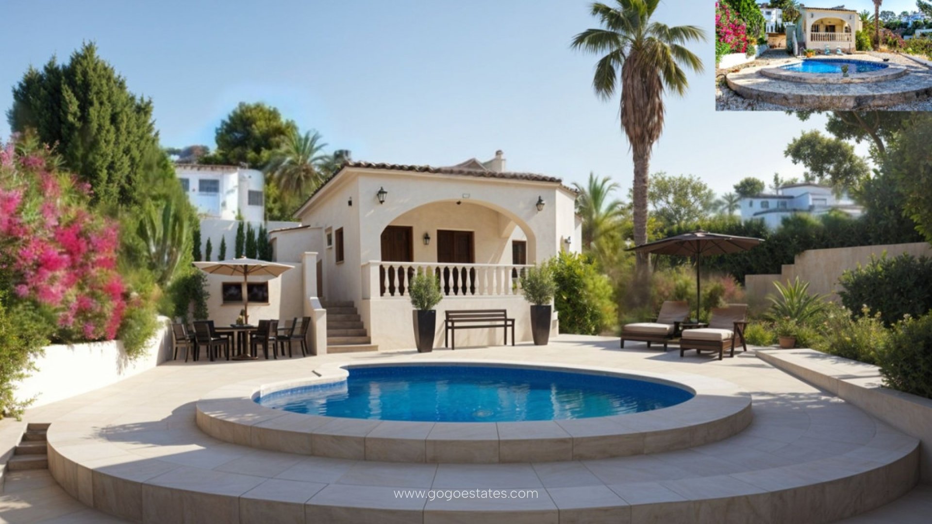 Mediterranean villa for sale; quietly located on a cul-de-sac in Empedrola in Calpe. Plenty of sun due to its south-facing position with a little sea view (this view can be improved by pruning the pine trees on the property). Description The villa was built in 1998 and is in its original condition. Ideal for buyers who want to decorate their new home to their own taste or for investors who want to build a modern villa on the site. Spacious plot with sun terrace and plenty of shade. The current house has a small hall leading to the master bedroom with built-in wardrobes. There is also a smaller bedroom, guest toilet and a bathroom with bathtub. Two rooms can be combined into a spacious bathroom through renovation. The heart of the house is the bright living-dining room with gas fireplace. The adjoining open kitchen is functionally designed and provides direct access to the terrace. A few steps lead from the terrace to the swimming pool with outdoor shower. Special features Gas fireplaceCul-de-sacNew hot water boilerFlat, spacious plotWhy view this villa Lots of potentialSunnyExcellent investmentAttractive priceExcellent house in a good location. Ideal for investors and buyers looking to renovate. Don't wait any longer and contact us today to arrange a viewing. The displayed price does not include taxes and purchase costs / The offer is subject to errors, price changes, availability, omission and / or withdrawal from the market without prior notice / Furniture and contents according to personalized agreement and not according to the photos in the presentation