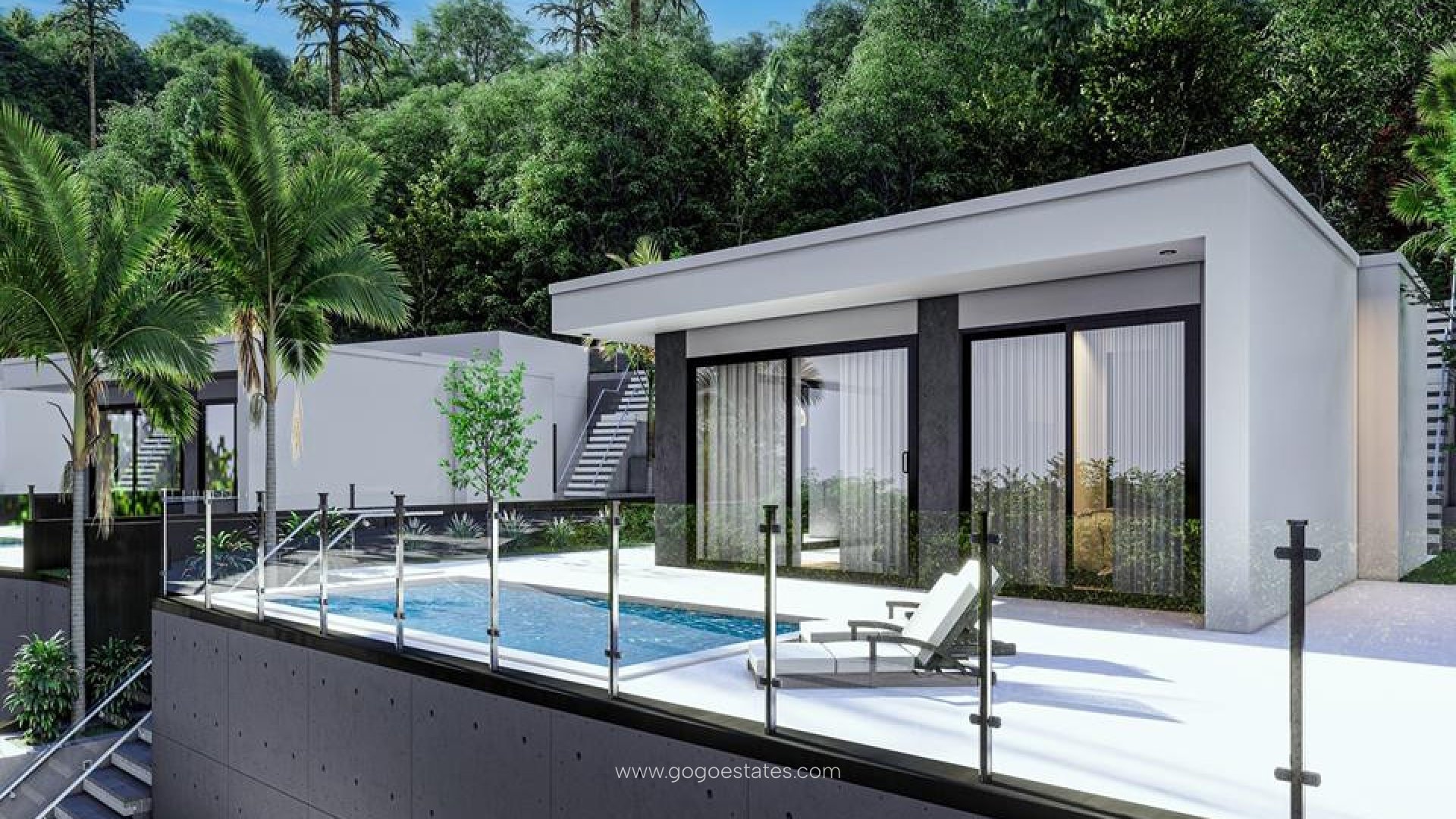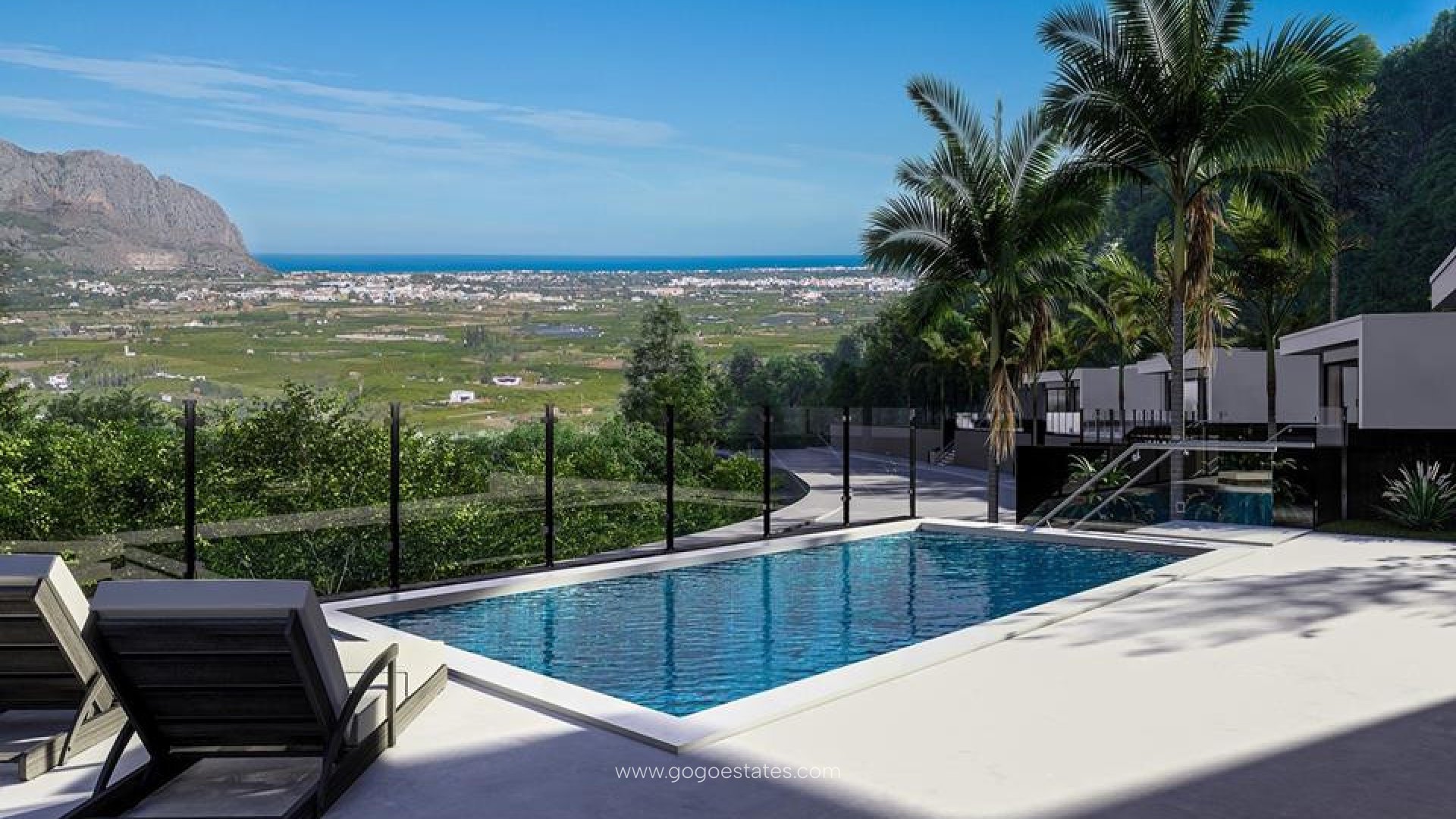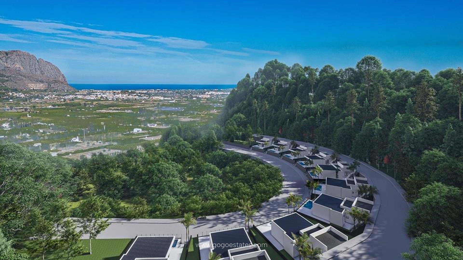 LAS COLINAS A development of 10 detached villas with private pools on Monte Solana - Pedreguer - all with sea and valley views. Tranquil location - if you like peace and quiet then this is the ideal spot for you. Plot of 300m2 Living area and porch of 114.09m2 Swimming pool of 6 X 3 meters with pre-installation of pool heating, glass railings on pool terraces Double car port Basic finish to gardens Model Cortizo 60-4200 external carpentry in colour RAL7016 Glass UV protected minimum 4/6/4 Solid wood interior carpentry in white, door handles of brushed steel Wardrobe doors swish brake system.¡ False ceilings with curtain recess' in bedrooms and lounge Ducted Air Conditioning/heating powered by Panasonic reverse heat pump Modern ceramic tiles on floors and bathroom walls Kitchen wall and floor units with granite tops Sanitary ware including floating WC, vanity units, modern shower bases, mixer taps in black or chrome Mix of tiled and plastered façade