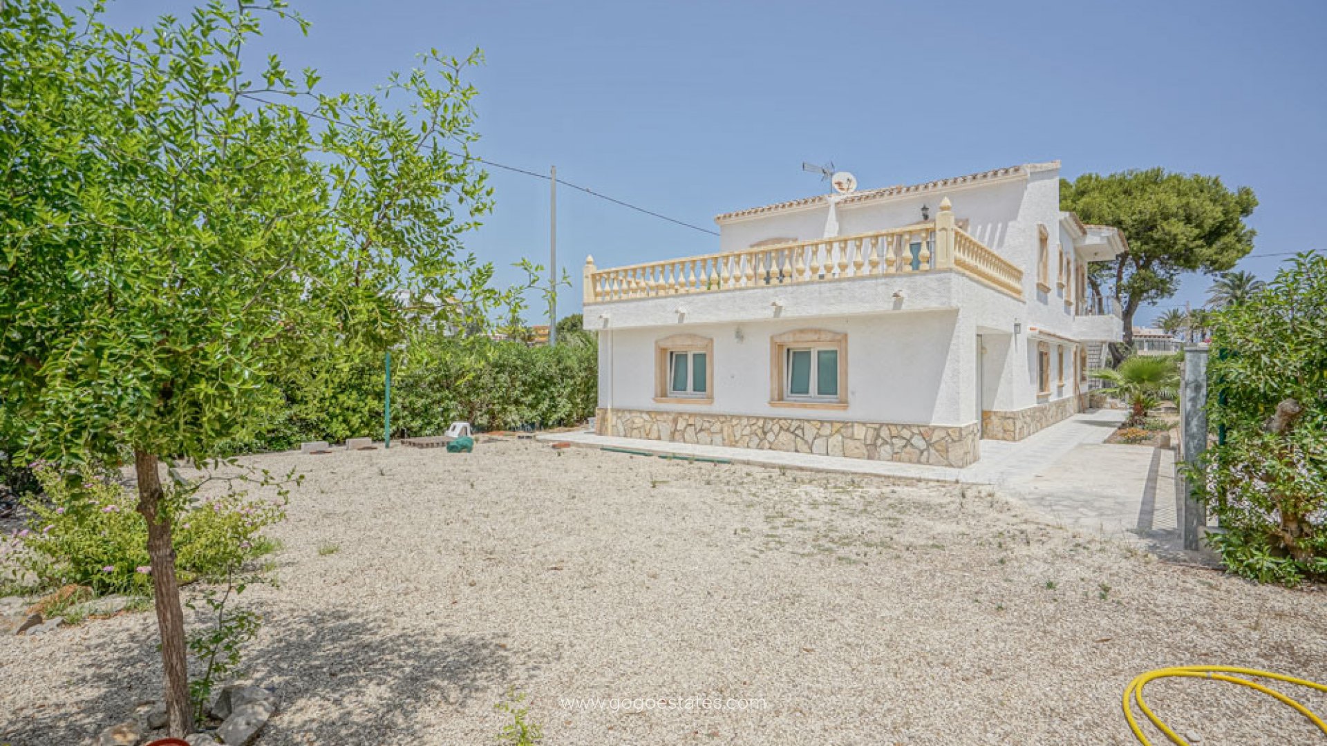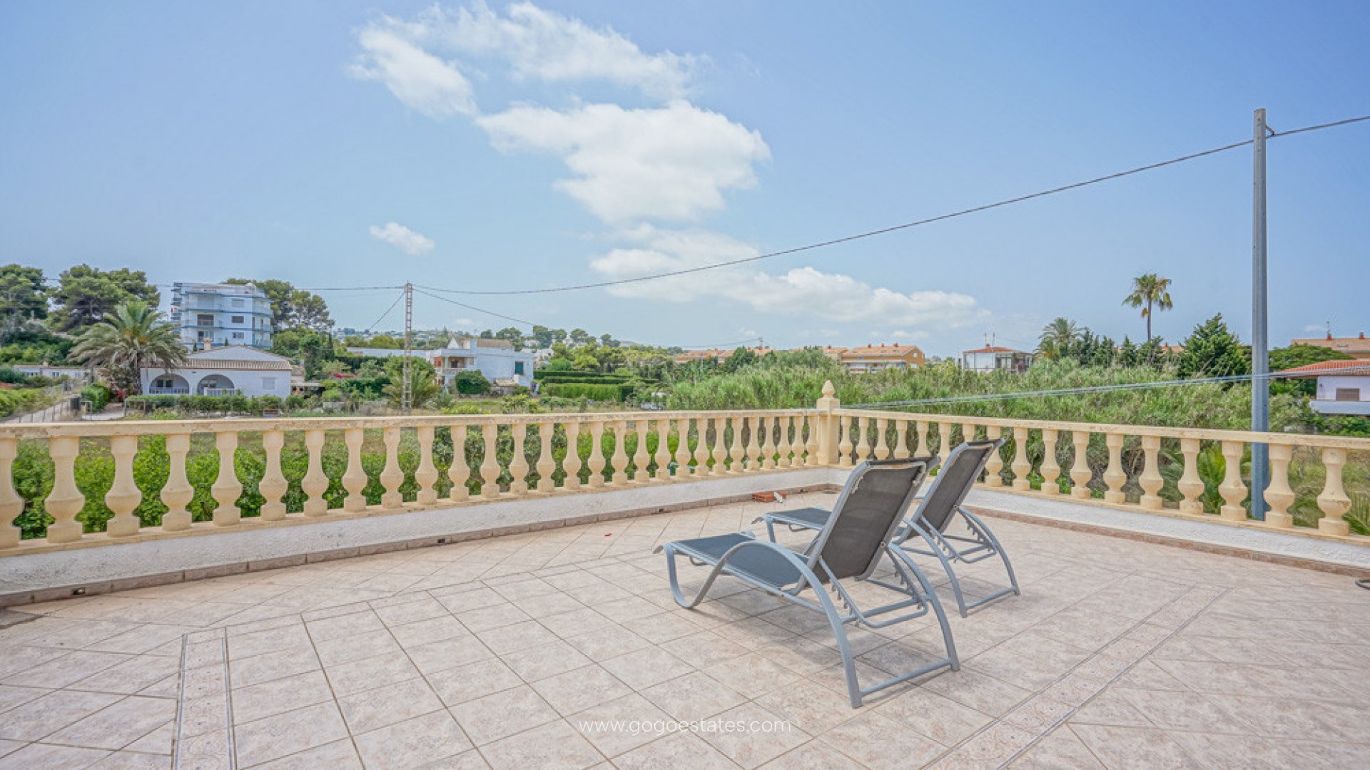 This large villa is located on a flat plot of 1144 m2 just 50 m from the beautiful beach of Cala Blanca. The villa is divided into two almost identical floors. The ground floor comprises a living-dining room, a kitchen, three double bedrooms, a bathroom and a covered terrace. The upper floor consists of a living-dining room, a kitchen, three double bedrooms, two bathrooms, a covered terrace and a large solarium of 40 m2 facing south. There is also a garage, a barbecue, an outdoor shower, two 16,000-litre water tanks for irrigation and access to a communal water source. The villa is surrounded by a Mediterranean garden, with plenty of space on both the south and north sides of the house. On the north side are several pine trees that, together with the cool sea breeze, ensure it is never too hot on the covered terrace. The south side, surrounded only by a bright flower hedge and a few fruit trees, is ideal for enjoying the sun in winter or for installing a swimming pool. The villa is less than a 1.5 km from the sandy beach and the Arenal promenade. There is a pharmacy and an international school 300 m away and a supermarket 500 m away. Just 100 m away is also a nice bar by the sea.