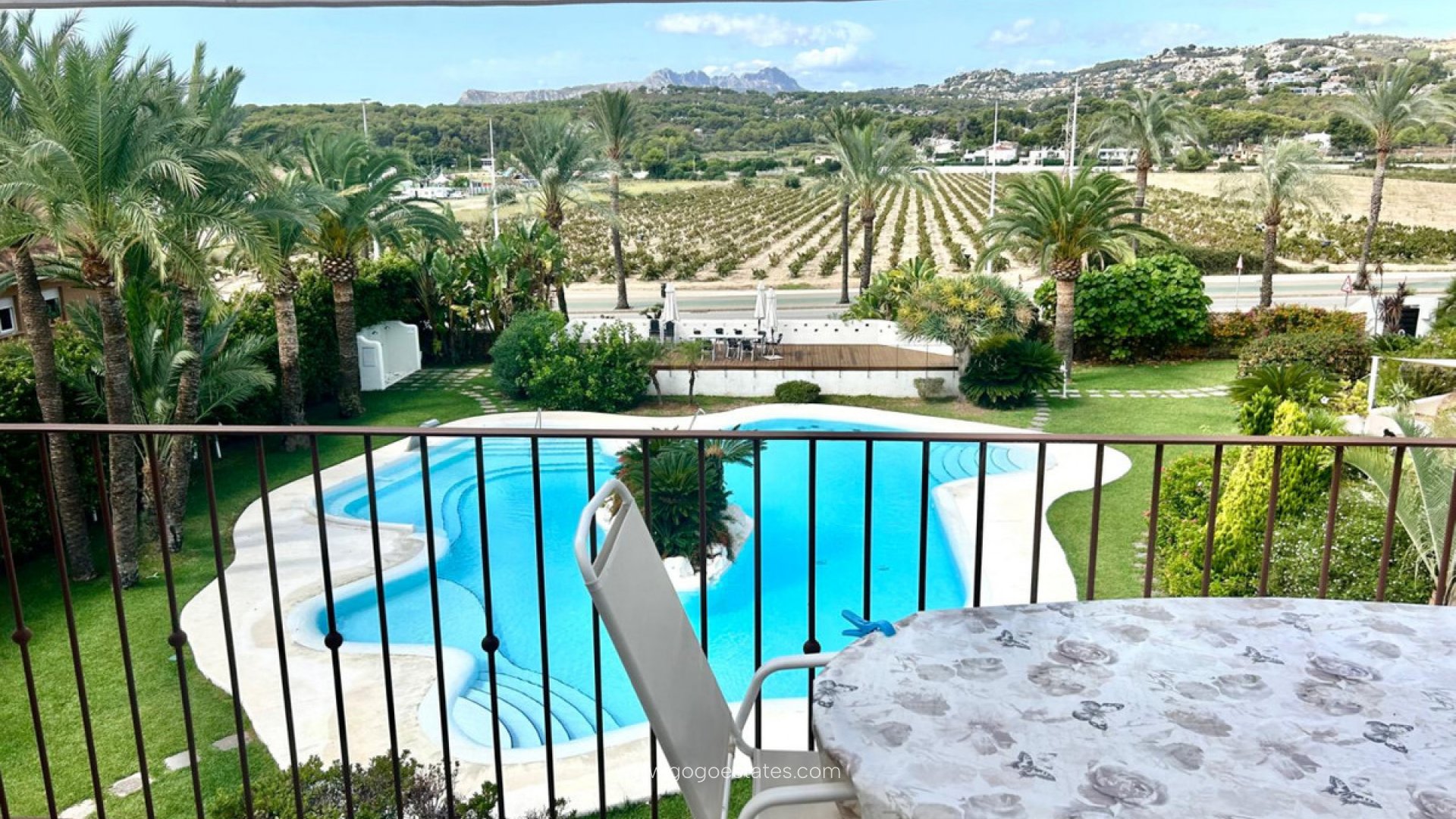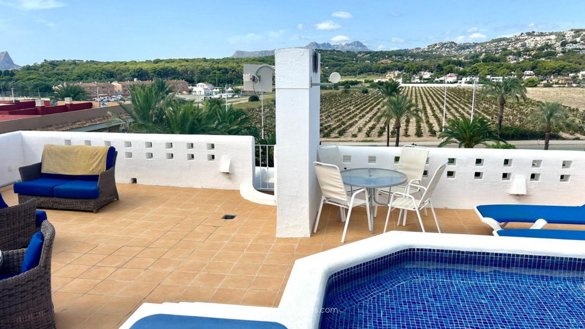 Spacious 2 bedroom 2 bathroom Penthouse with Solarium and Private plunge pool for sale in Moraira town. This Spacious apartment is located just a short walk from the center of Moraira and the marina. The property is south facing and consists of entrance door leading into a large open plan living dining room with south facing views towards Calpe Ifach and the Bernia mountains, large sliding doors leading out onto a good sized balcony capable of accommodating a family sized dining table and chairs, the living also room benefits from a working chimney and fireplace. From the dining room a door leads to the separate kitchen, with a full range of fitted units and appliances, and a further utility room which houses the washing machine and dryer. An inner hallway from the living room leads to a family bathroom, 2 double bedrooms, the master with en suite bathroom and views over the pool and gardens. From the living room balcony, stairs lead to the spacious solarium, equipped with BBQ, large seating area and private plunge pool, there is ample terrace space for sun loungers and the solarium has excellent south facing views towards Calpe and the sea. The solarium also benefits from a storage room. The property includes a double underground garage with a lift to all floors from the parking area. This is a great opportunity to purchase a spacious penthouse with private pool, ideal for permanent living or holiday rental income and with all the amenities of Moraira virtually on the doorstep.