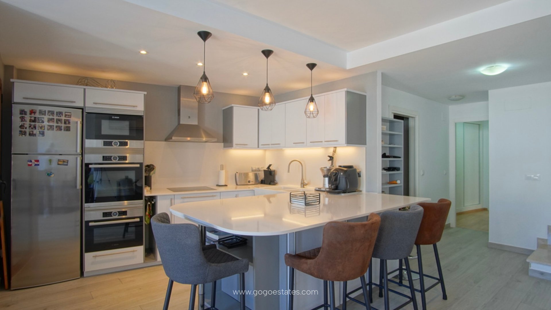 Discover this charming duplex penthouse in the heart of Jávea, fully renovated and ready to move in. Located in one of the most desirable areas of the historic center, this elegant penthouse offers a spectacular tastefully decorated rooftop, from where you can enjoy breathtaking panoramic views that stretch from cape to cape. The main floor features a bright open-plan living room that integrates perfectly with the modern kitchen and separate laundry room. From the living room, you can access a cozy east-facing terrace, ideal for enjoying breakfast in the sun. This same floor includes the master bedroom with an en-suite bathroom, a second bedroom, an additional full bathroom, and a practical storage room. The upper floor houses a spacious third bedroom with access to a private terrace, another full bathroom, and a spectacular rooftop, perfect for relaxing, sunbathing, or enjoying sunset views. Among its amenities are fitted wardrobes, air conditioning, electric blinds on the upper floor, and a private parking space in the underground garage. A unique opportunity to live stylishly in a prime location in Jávea.