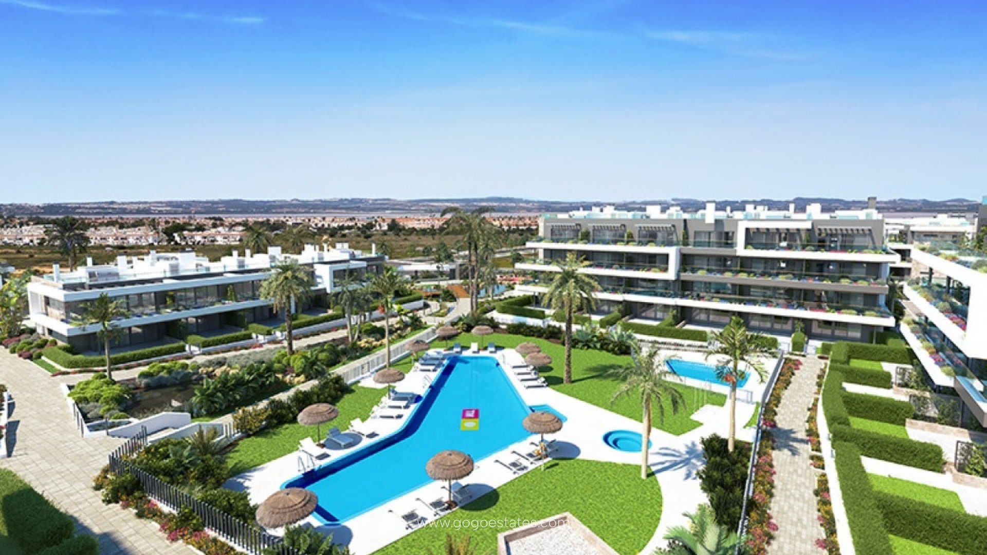 The 2-bedroom apartment provides a comfortable and practical living environment with enough space for a small household. Minimum living space is 69m2 with a 23m2 terrace, largest apartment has 79m2 living space and 31m2 terrace. There are also ground floor apartments with a private garden and on the top floor apartments with a separate solarium. The open layout and natural lighting create a bright and airy atmosphere. The apartment features: Two well-sized bedrooms, each with ample room for a queen-size bed, nightstand, dresser, and other bedroom furniture. The bedrooms have large windows that allow plenty of natural light. A living room with space and has an open layout that connects to the kitchen. A modern kitchen equipped with energy-efficient appliances, ample counter space, and plenty of storage cabinets. A full bathroom with a shower, toiley & vanity sink, and linen closet. Large closets in each bedroom for ample storage This is a place where you can fall in love with the pink lagoon of Torrevieja and the best of the beautiful Mediterranean. Lagoons Village is designed for people who love a healthy lifestyle, exercise and enjoy recreational activities by the sea. In this first residential area, the spacious common areas of more than 15,200 square meters include: two adult swimming pools of 180 square meters, two children's pools and two heated Jacuzzis. Owners have exclusive access to the Lagoons Village Sport & Wellness Club with: Heated swimming pools for adults and children, designed with photovoltaic energy for heating. Large pool beach with sun loungers and parasols. Equipped gymnasium and another outdoor gymnasium for outdoor sports activities. 5-a-side football field with artificial grass. Mini basketball court. Playground for children. Tennis courts with artificial grass. 2 paddle tennis courts. Co-working space. Spa and rooms for beauty and physiotherapy treatments. You have several options to choose a home that best suits your needs and budget There is a garden on the ground floor, mezzanine floors with terraces. The development is located next to the Torrevieja International Auditorium and the Quirón Hospital. The area also offers a wide range of services: Habaneras shopping center, sports center, restaurants, shops, primary and secondary schools and even the largest street market in the area, which takes place every Friday. You have direct access to the N-332, a few minutes from the A-7 motorway and a 40-minute drive from Alicante-Elche Airport.