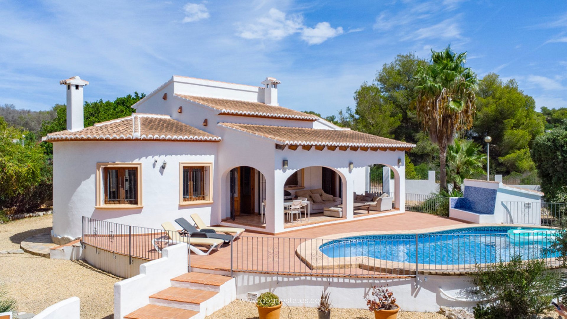 Traditional single-story villa for sale in Balcón al Mar – Portichol, Jávea This charming villa is located in a quiet urbanization, just a stone's throw from some of Jávea's most beautiful coves, including Cala Portichol and Cala Granadella. The property is entirely on one level and features a cozy living-dining room with a fireplace and an adjoining semi-open kitchen. There are three double bedrooms in total, one of which has an en-suite bathroom, plus a separate bathroom. Both the living room and the master bedroom have direct access to a spacious covered terrace by the pool, the perfect place to relax and enjoy the Mediterranean climate. A few steps down is a sunny uncovered terrace with a barbecue. The villa also has a low-maintenance Mediterranean garden with palm trees, flowering shrubs, and a pomegranate tree. Furthermore, the plot offers ample parking space for several vehicles. Additional comfort is provided by air conditioning and built-in wardrobes in the bedrooms. The villa is within walking distance of breathtaking viewpoints and only a 5-minute drive from several idyllic bays. The sandy beach of Jávea can be reached in 10 minutes, and the historic center in 15 minutes. An attractive property in an excellent location, ideal as a vacation home or permanent residence on the Costa Blanca.