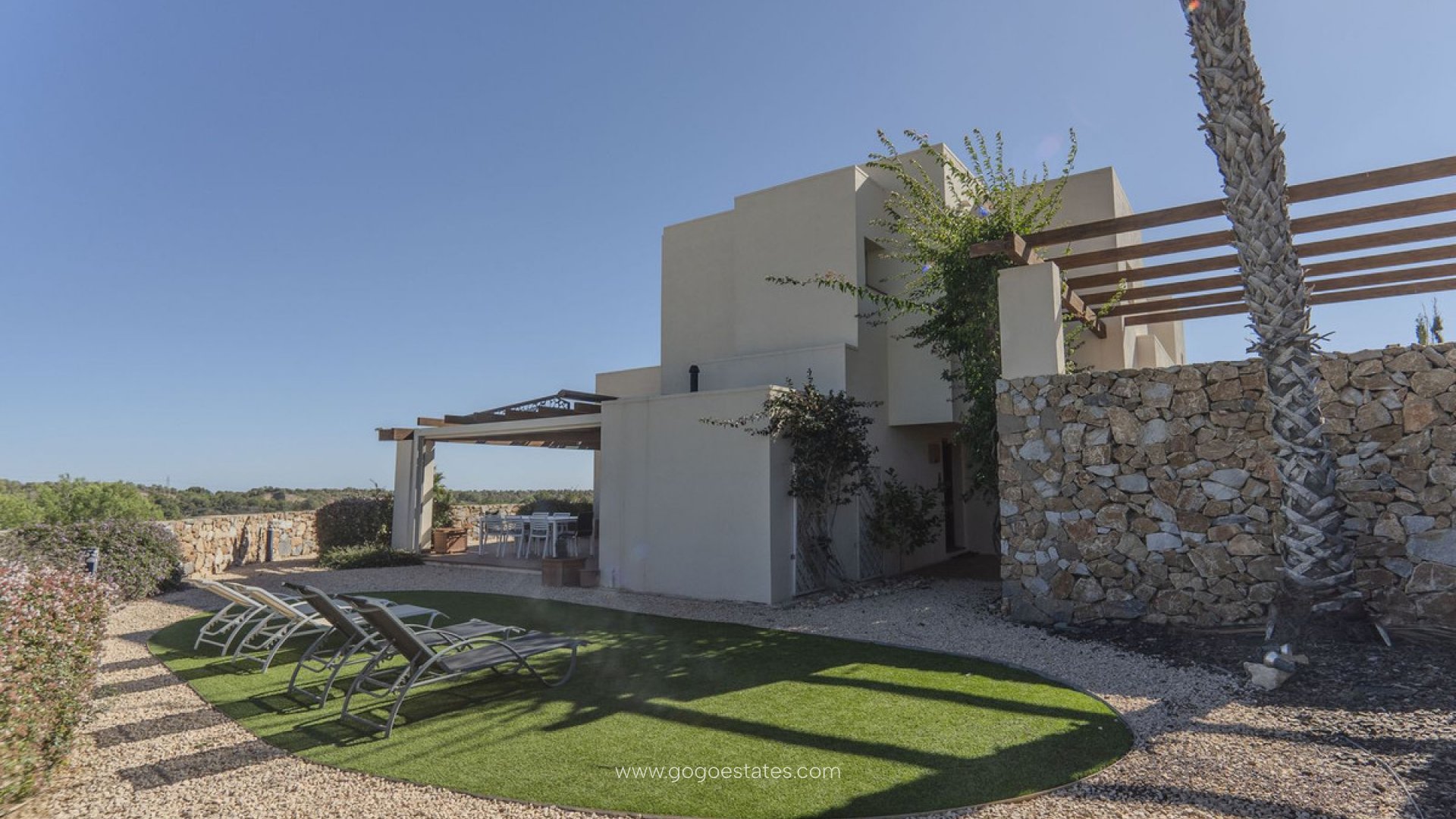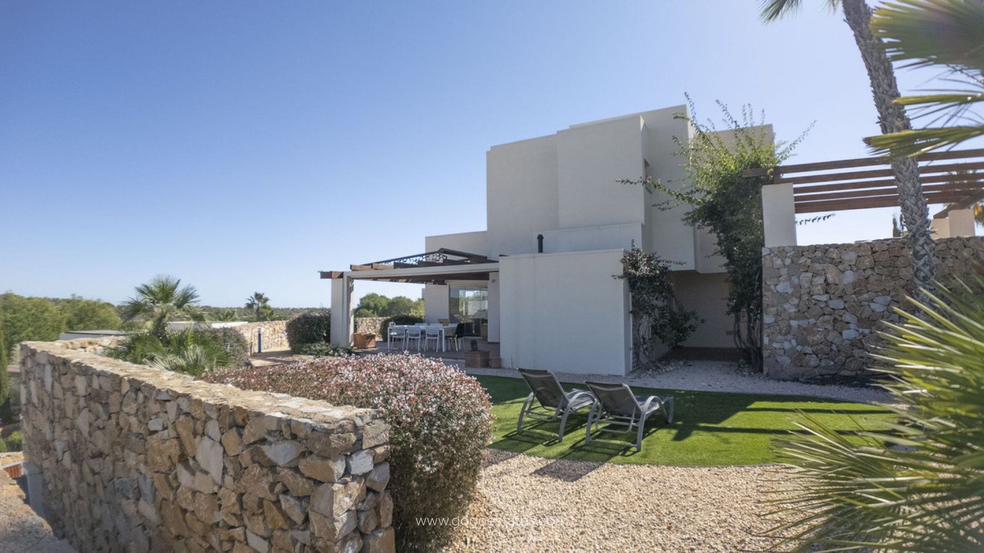 3 bed luxury villa in Las Colinas Golf for sale. This amazing villa is on the Jacaranda Estate in a gated community with private parking. The living room has a high vaulted ceiling with a dining area leading out onto a large outer garden area with an electric toldo covering a dining table for al fresco dining. The property features two private parking spaces. The house has a beautiful communal pool which is only shared with 4 villas, and space for a private pool if desired. On the ground floor there is a fully equipped kitchen, the living room, a veranda as well as a bedroom and a bathroom. Both the dining room and the kitchen offer a breathtaking view of the terrace with dining table, the garden and the golf. The second floor of this charming villa has two bedrooms, each with its own private bathroom. There is a sunny glazed in terrace area with a comfortable sofa for relaxing in. The living-dining area is spacious and bright leading out onto the extensive garden area with grassed area with sunbeds, a dining area and also a sofa and deckchairs to sit and relax in the sun. The house is located in an area of Golf de las Colinas which has received the award for the best golf course and is complemented by a practice course / driving range, Approach Golf, academy and putting green. The complex offers 2 restaurants dedicated to gastronomy. There is a golf store, a spa, a sports club, a tennis and padel school. Around the golf course there is a trail circuit located in a nature reserve. Cycling on the estate is a unique activity. Additionally there is a Mini Market where you can buy everything you need for your holidays, from food to hygiene and personal care products.