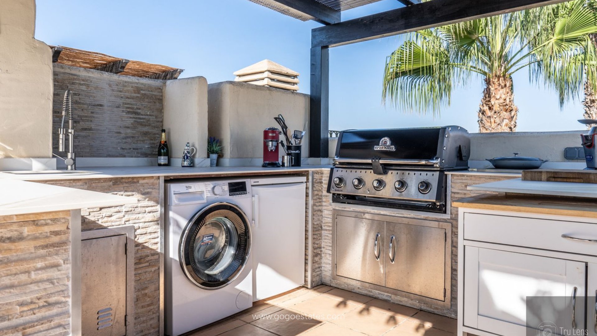 We are pleased to present this beautifully updated 2 Bed, 2 Bath Penthouse Apartment on Phase 1 of Roda Golf, featuring a remarkable rooftop garden complete with a BBQ kitchen area. This outdoor space is designed for enjoyable living, equipped with a built-in BBQ, marble countertops, hot and cold water, a fridge/freezer, and a wine fridge, along with a TV and Bose sound system, making it ideal for entertaining. You can relish in panoramic views, witnessing approximately 300 days of stunning sunrises over the Mar Menor and sunsets over the mountains. Inside, you'll find elegant marble flooring throughout, with the en-suite and main bathrooms showcasing floor-to-ceiling marble. Conveniently located near the Club House and main entrance, the property allows for easy access to local amenities and the Mar Menor beach. The apartment features built-in wardrobes in the master bedroom, which includes an en-suite with a walk-in shower, and a fully equipped kitchen on the lower level. The bright and spacious lounge/dining area and master bedroom both extend to a good-sized terrace and Juliette balcony, presenting lovely views of the well-maintained communal gardens and swimming pools. This inviting property comes with negotiable furniture, air conditioning, and gas central heating throughout. Additional amenities include underground parking and a storage room with lighting.