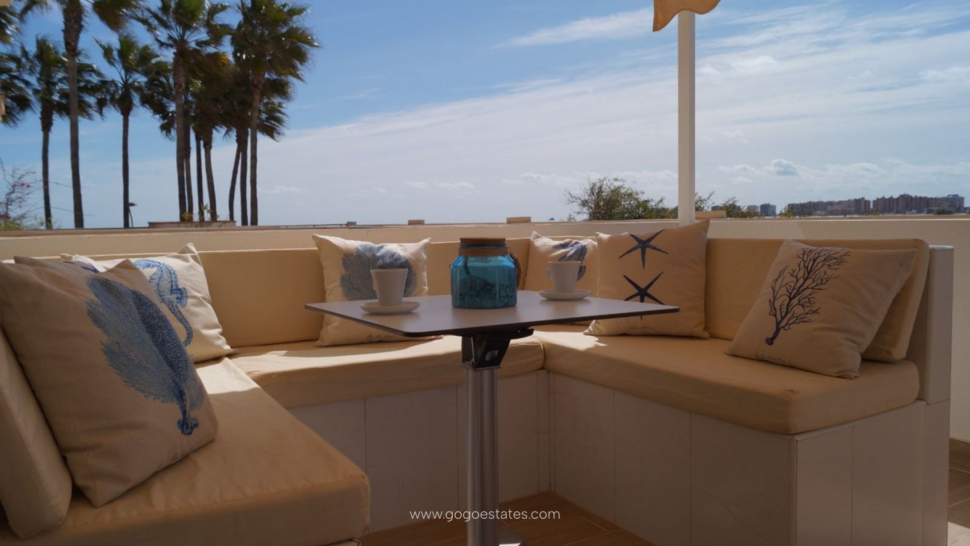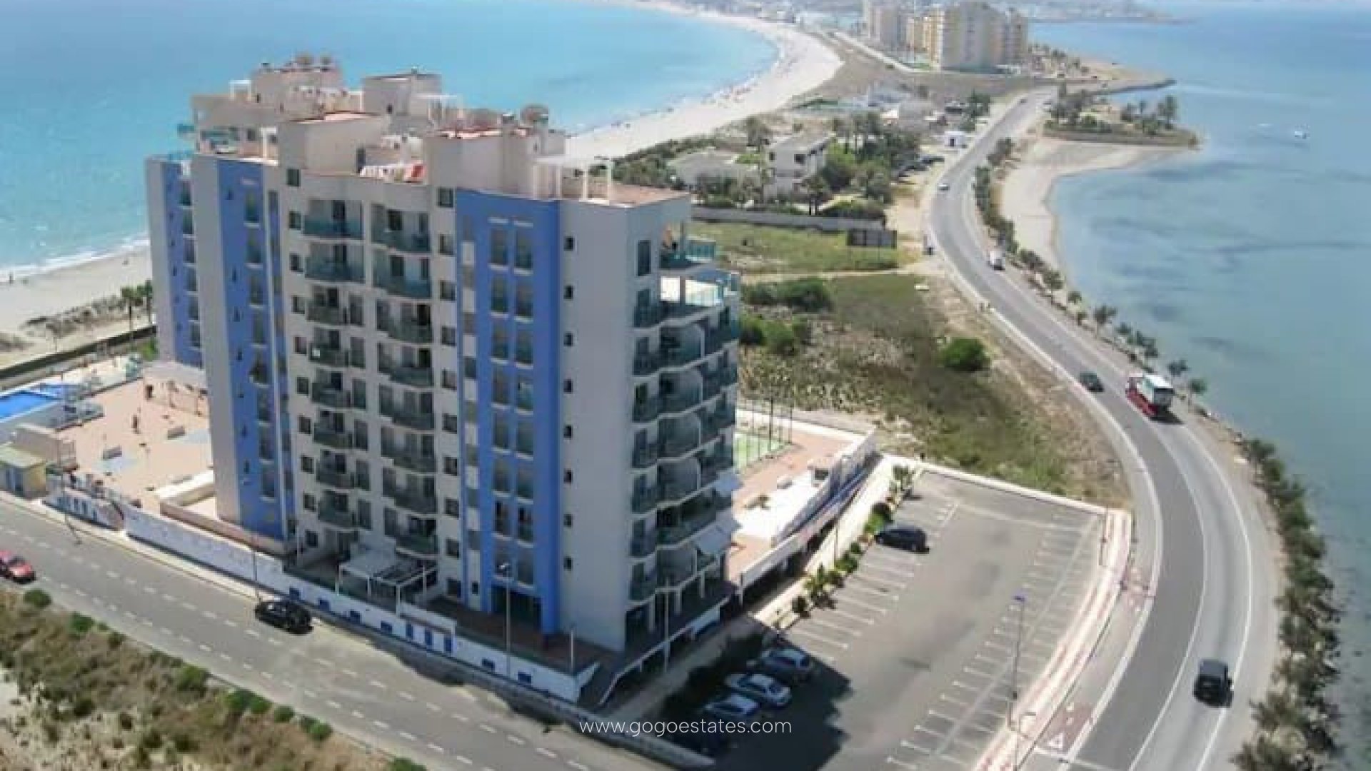Modern and beachfront apartment with large terrace and shared pool A warm welcome to this charming and homely ground floor apartment with an inviting feel and generous light flow located in attractive La Manga. Here you live with views of Playa Veneziola, the Mar Menor and the mountains, as well as being close to shops and restaurants. This ground floor apartment is approximately 41 square meters and has one bedroom, one bathroom, and an open-plan living room and kitchen. In addition, there is a spacious patio in a sunny location, with beautiful views and space for outdoor furniture or a lounge group. The living room has an inviting and spacious feel, with space for a sitting area and a dining area. The kitchen has good storage options in upper and lower cabinets. The bedroom is in a quiet location and has a pleasant amount of light. There is space for a double bed and bedside tables. The bedroom also has its own exit to the large patio. The bathroom has a light color scheme and is equipped with a toilet, sink and bathtub. A parking space is available for the apartment. The common area has a swimming pool, gym and sauna. There is also a shared roof terrace in a sunny location. The apartment reportedly has air conditioning. It is sold furnished according to the inventory list. Please contact us for more information or to book a viewing. We will of course conduct digital viewings if you are unable to be there.
