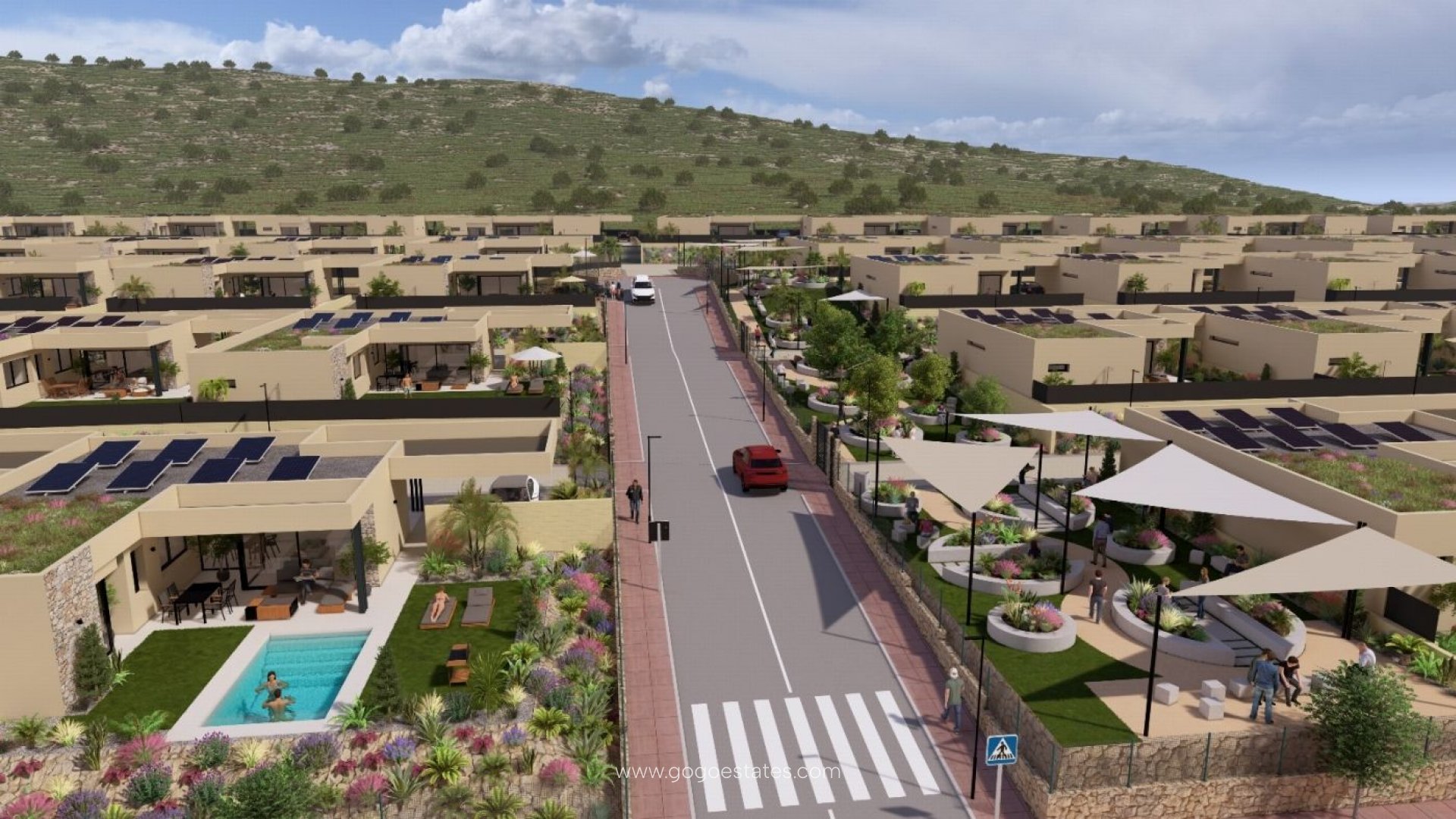 Las Vistas –ZEN 1- An absolutely stunning new development of 5 bedroom, 3 bathroom plus 1 guest toilet villas being built on the newly upgraded Altaona Golf Resort, Murcia. These stylish and contemporary villas have an extra large floor plan to give larger bedroom and living space throughout the property. They will have views over the golf course with solar panels, private pools and landscaped gardens included in the price. ~These fabulously stylish single level villas are currently under construction and will be built on good sized plots of 309m2, with a build size of 194m2 living space. All villas have wonderfully spacious lounge / dining areas which have full height patio doors leading out the landscaped gardens and private pools. ~The kitchen areas will be fitted with appliances from package options available, depending on the buyer's specification. The villas will have 5 bedrooms, with the 4 shower room. The master bedrooms will have full height patio doors with access out to the garden areas as well as dressing area leading through into the en-suite. There is also a guest toilet and large utility room. These well thought out villas are L shaped and so all large windows look directly to the private garden areas to give maximum privacy.~The villas will be built south facing, on ground which is staggered so that no property is overlooked or has its views blocked by the property built in front, and with the roofs of the villas being landscaped with succulents and herbs, the views from the gardens will be natural planting and out over the golf course, countryside and mountains beyond. Villas will have private driveways leading to covered parking areas, which can have optional electric car charging point. ~There are many extras which are included and additional options for these fabulous properties which can be reserved and payment packages are available during the construction of the villas. ~Below is an overview of the most important unique features that Las Vistas Altaona offers: Communal Areas including herb garden & yoga / meditation areas • Secure gated entrance • Architect / Designer for internal alterations of layout• Underfloor heating to lounge and bathrooms• Air conditioning throughout• Privacy & Feng Shui• Attractive Design & Respect for Natural Environment • Green Roofs with solar panel • Reinforced Concrete Columns