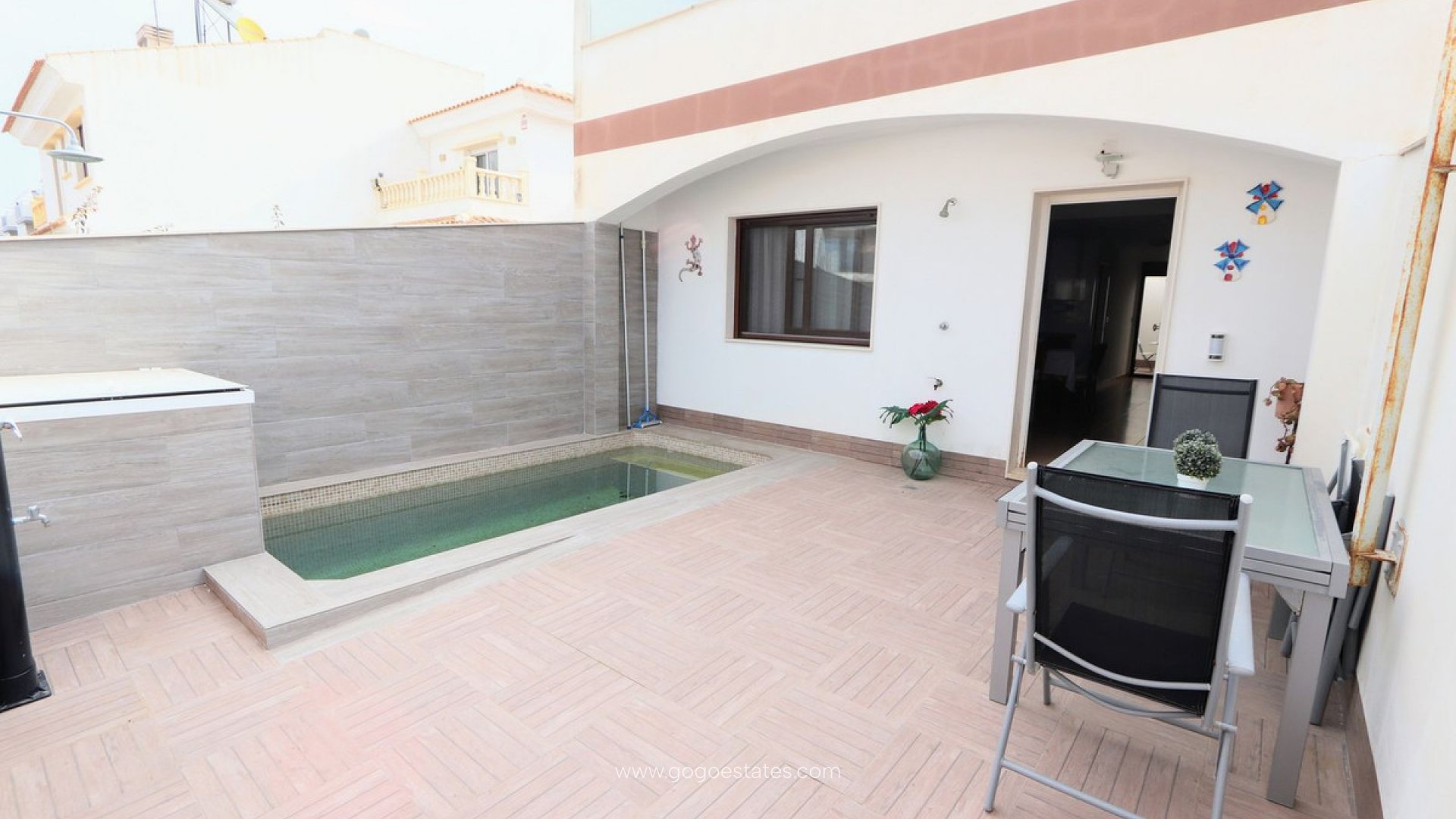 Take a look at this Beautiful Villa located in Lo Pagan and only 700m to the beaches. The property consists of 4 bedrooms, 2 bathrooms, living/dining area and a fully fitted kitchen. The villa benefits from a terraced area to the front of the property and a closed in terrace at the back of the property, air conditioning, storage and a private swimming pool.Lo Pagan is situated on the north shore of the Mar Menor and has merged with San Pedro del Pinatar to become one big town. Lo Pagan has a beautiful beach, promenade and small marina. During the summer months there is a lively funfair beside the marina which adds to the seaside atmosphere.Lo Pagan is most famous for its mud baths. These are free, which is great news if you have a large family to keep occupied. All ages can use the mud baths from 1 to 100, but only the truly hardy indulge during the winter months. The mud baths are located at the end of the beach and the start of the salinas walking and cycling route out to sea. Simply walk down the steps, cover yourself with the therapeutic mud, said to be good for all types of skin complaints, aches and pains, dry off in the sun, then re-enter the water to wash it all off!~