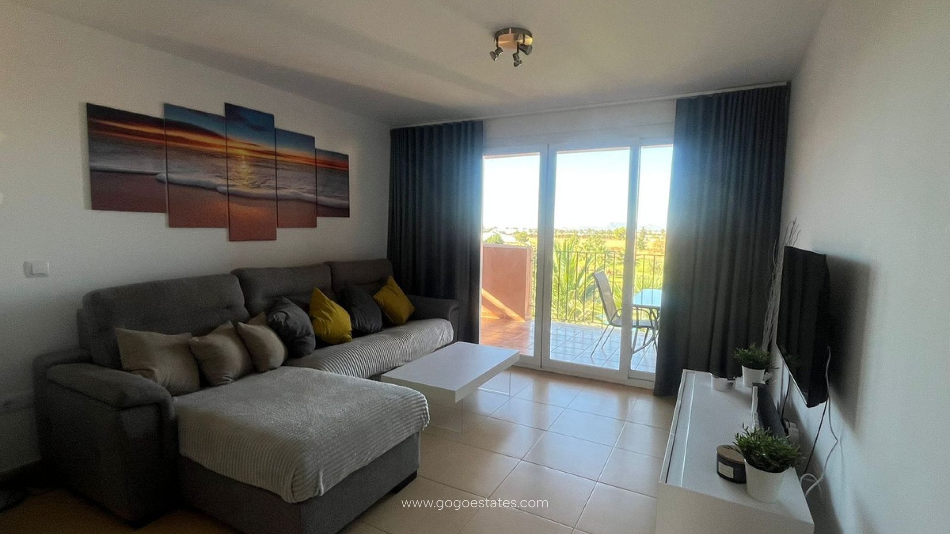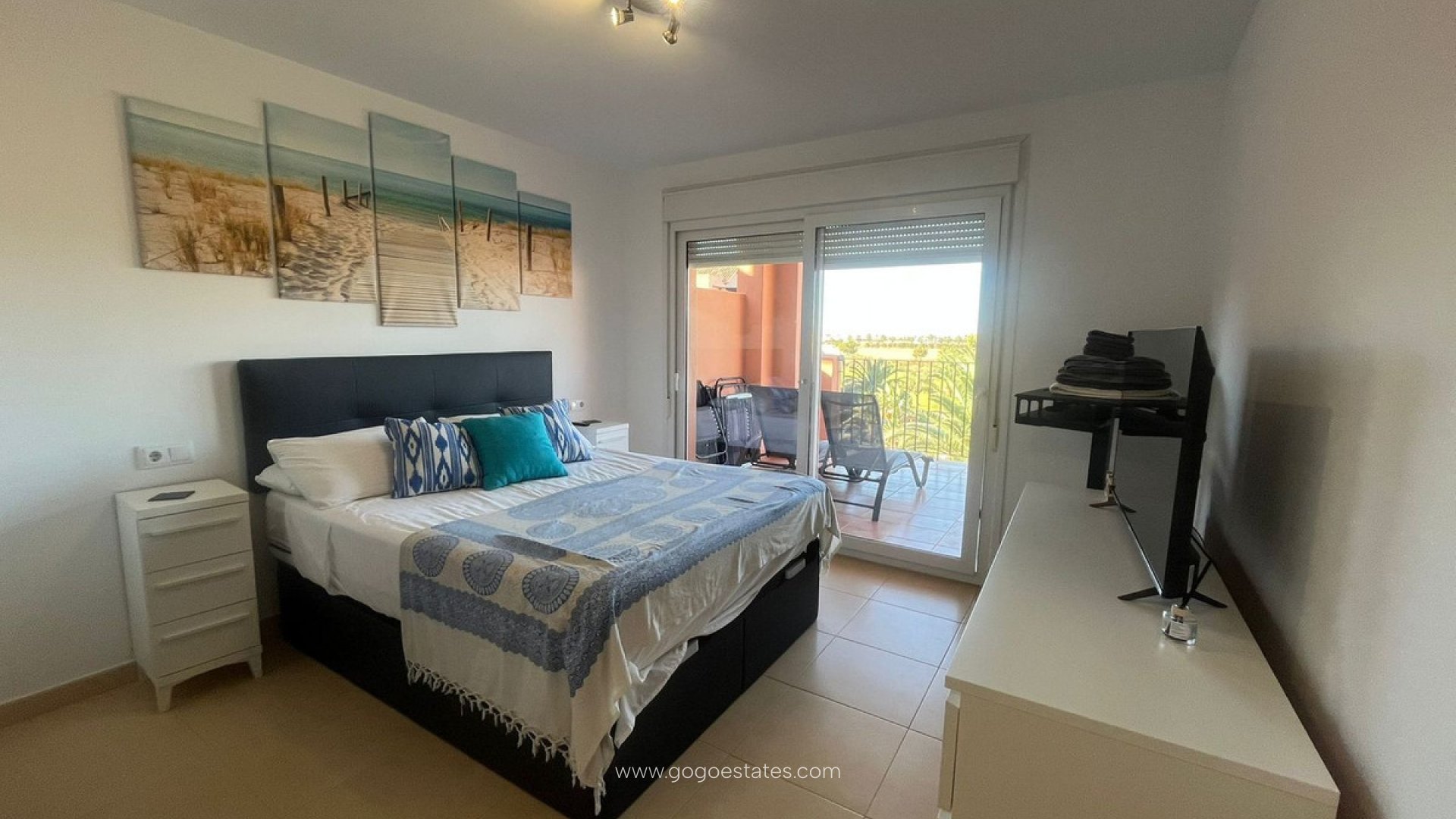 Beautiful 2 bed and 2 bath apartment at the fantastic Mar Menor Golf Resort. This second floor apartment is right overlooking into the golf course, communal garden and pool, a views to die for.The open plan kitchen enjoys a high breakfast bar into the large living/dining area which opens into the terrace. Both terrace and master bedroom have direct access to the terrace... Each bedroom is large and spacious with fully fitted wardrobes in both bedrooms. The master bedroom has also a great big bathroom.Airconditioning through the whole apartment (hot/cold) making the apartment more comfortable all year around.The apartment also benefits from allocated underground parking.The location of the apartment within the golf resort is ideal as it is only a few minutes walk away from the supermarket, sports facilities and bars and restaurants.~