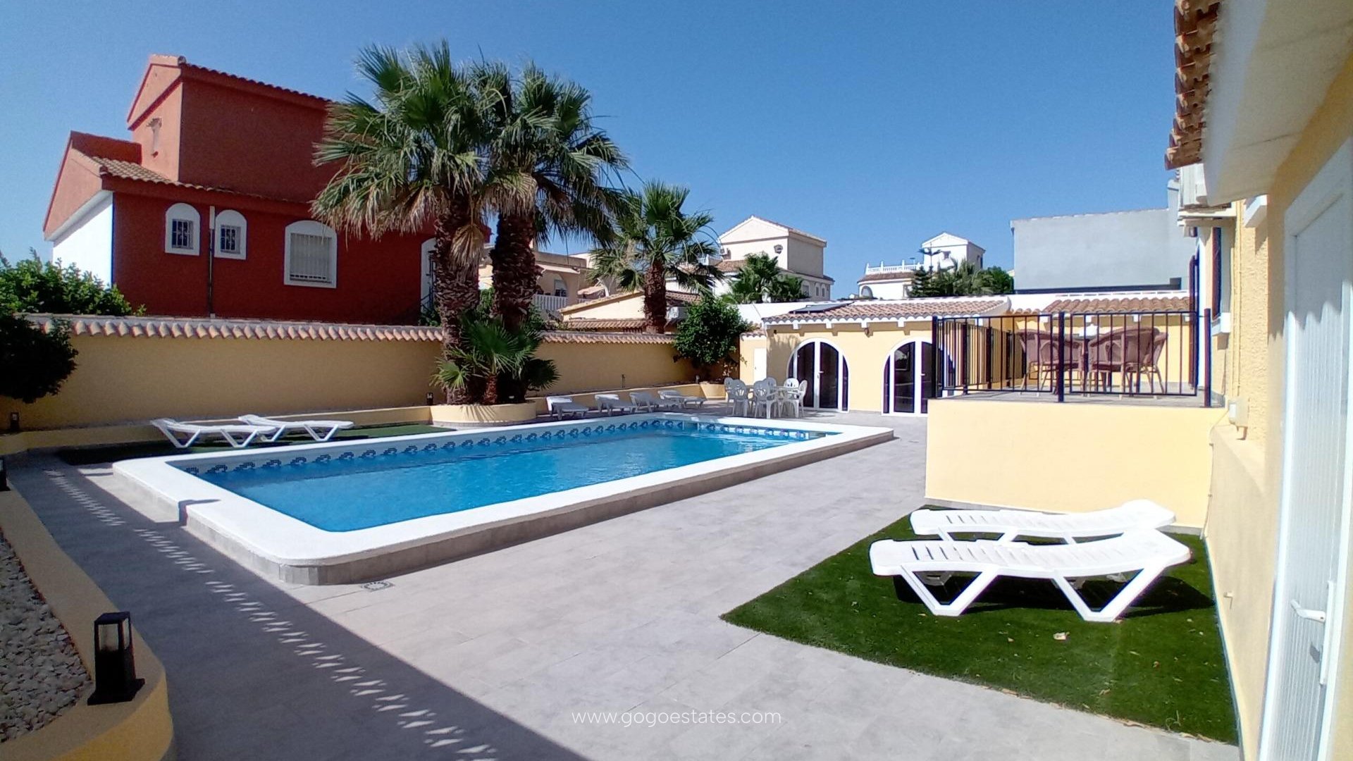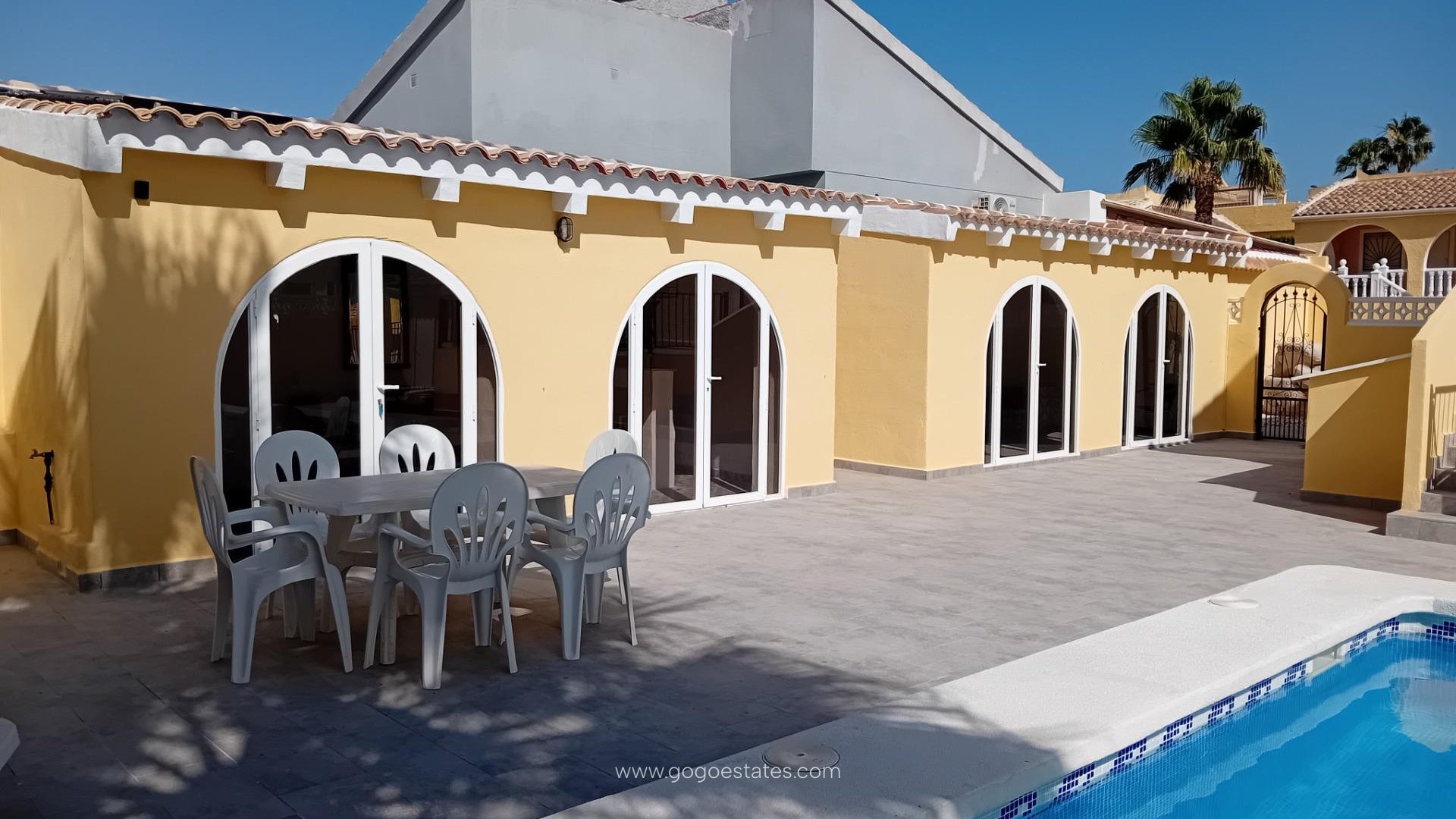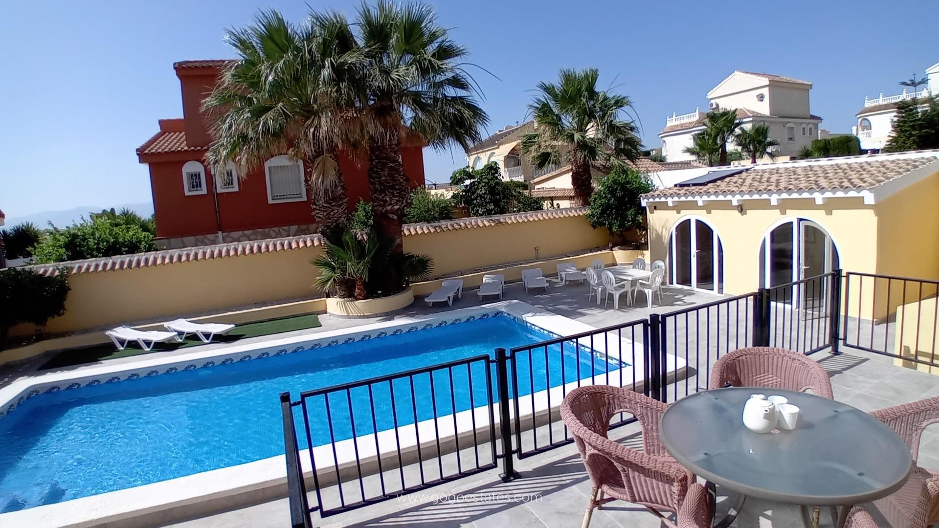 Welcome to a slice of sun-drenched paradise in the heart of sought-after Camposol—an enchanting villa that promises not just a home, but a lifestyle. This immaculately presented 3-bedroom, 3-bathroom (one being a stylish exterior wetroom) retreat is the epitome of Mediterranean charm and modern convenience.~~Set on a generous 624m² plot, the villa exudes sophistication, from its brand-new private swimming pool to its expansive, sun-kissed terrace—perfect for long lazy afternoons and glamorous evening soirees under the stars. Whether you're entertaining guests or enjoying tranquil solitude, this outdoor haven has been meticulously designed to delight.~~Two charming outbuildings elevate the potential of this home. One currently hosts a chic bar and lounge area, offering the ultimate private party pad, yoga studio, or future sauna sanctuary. The second sits elevated on a raised terrace with sweeping mountain views—ideal for morning coffee or a sunset aperitif.~~Step inside and discover a world of comfort and elegance. The home features three generously sized bedrooms and two bathrooms inside. The first-floor master suite opens to its own private roof terrace, offering a peaceful escape to soak in the Spanish sun. A bright, inviting conservatory adds a touch of year-round versatility, bathed in natural light.~~The galley-style kitchen is thoughtfully placed just before the outdoor entertainment area, opening directly onto the terrace that overlooks the glistening pool—made for al fresco dining and poolside gatherings.~~Practicality and luxury go hand in hand here. An electric gated driveway offers secure off-street parking, while a multi-purpose outbuilding provides ample space for storage, a workshop—or even your dream sauna conversion. The home is equipped with air conditioning in the lounge and master bedroom, ceiling fans throughout, and oil central heating (currently unused, waiting for your personal touch). Solar panels for pool heating are already in place, blending eco-conscious living with year-round comfort.~~Location~Simply unbeatable. Just a 2-minute stroll from the lively commercial hub of Sector B, you’ll find shops, cafés, restaurants, and essential services all at your fingertips. Camposol itself is renowned for its vibrant yet relaxed community, complete with an 18-hole golf course, lush landscapes, and friendly neighbours.~~You’ll be spoiled for choice with local amenities—two bustling commercial centres offer everything from supermarkets, banks, and pharmacies to beauty salons, opticians, and even veterinary clinics. Hungry? Take your pick from a medley of international cuisine—Indian, Chinese, English, Bulgarian and beyond. Craving nightlife? Lively bars, live music, and social events abound.~~And when the beach calls, you're just 15 minutes from the golden sands of Bolnuevo and Puerto de Mazarrón, where the sea sparkles and the marina invites.~~Murcia Corvera Airport is a swift 30-minute drive, with Alicante Airport just over an hour away—making this villa your perfectly connected, endlessly enjoyable Spanish escape.~~A rare find in Camposol, this villa is more than a property—it’s an invitation to live beautifully. Whether as a full-time residence, holiday home, or investment opportunity, this is one not to be missed.~