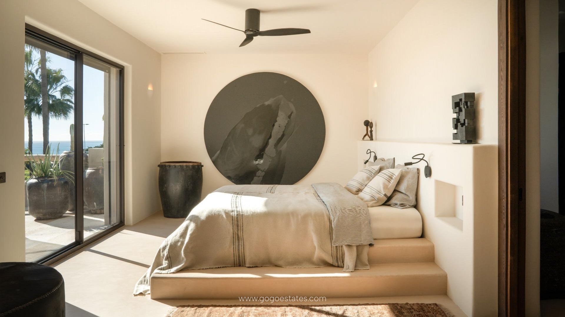 This unique villa, fully renovated in 2024, blends refined design influences from Mexico, Thailand, Ibiza, and Andalucía, creating a distinctive and relaxed atmosphere. Located in the emerging area of Selwo, the property enjoys beautiful sea views from the garden and pool level and a strong sense of privacy.~~The villa is arranged over two levels and offers five spacious en-suite bedrooms. The main living area features a cozy lounge with a working fireplace, seamlessly connected to a stylish open-plan kitchen and dining area, complemented by ample storage and a guest cloakroom.~~Outdoor living is a key highlight, with a heated infinity pool and poolside shower, a south-facing landscaped garden, multiple seating areas, a pétanque court, and an exotic pergola with a lounge corner. The main terrace is ideal for entertaining, featuring an Argentinian barbecue and an elegant dining area for al-fresco meals.~~The entire upper floor is dedicated to the master suite, offering a private open terrace with sun loungers and outdoor shower, a spacious dressing room, and a full bathroom with bathtub and walk-in shower.~~Finished with polished concrete floors throughout, the villa includes underfloor heating in all bathrooms, additional insulation, individual air conditioning units, ceiling fans, and 24 solar panels supplying hot water and heating the pool.~~Ideally located less than 1 km from the beach, within walking distance of restaurants and a padel tennis club, and just 10 minutes from Estepona and Puerto Banús, this architecturally distinctive home is truly incomparable on the coast.~
