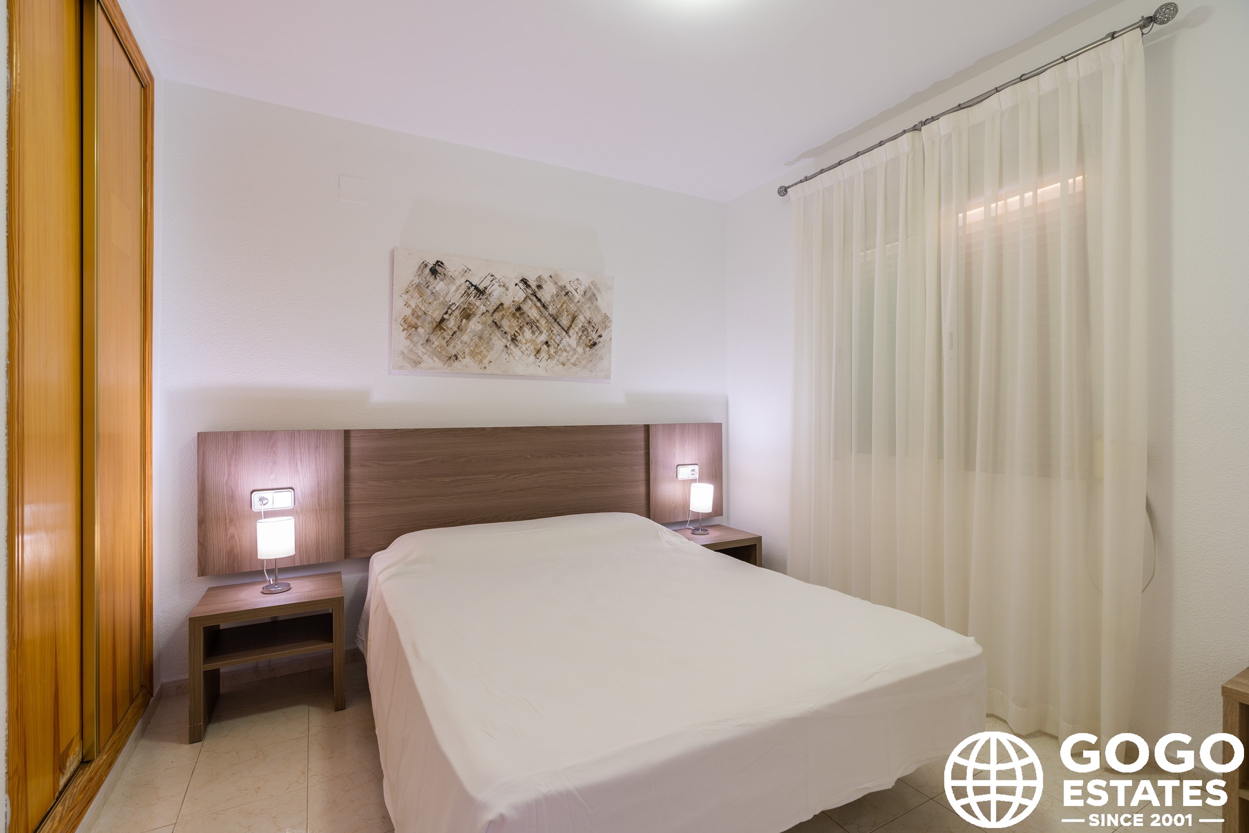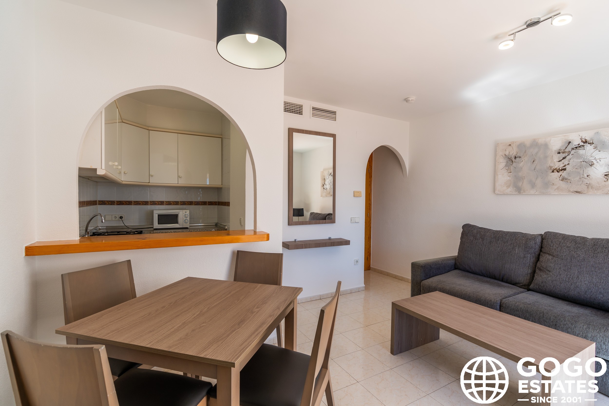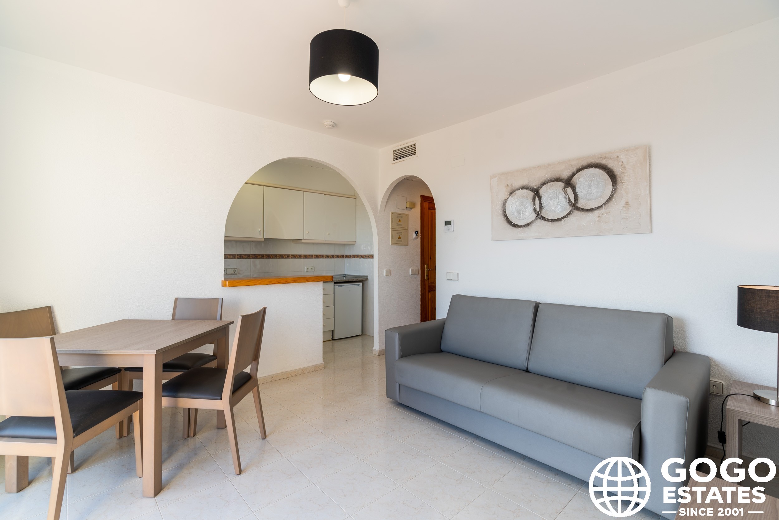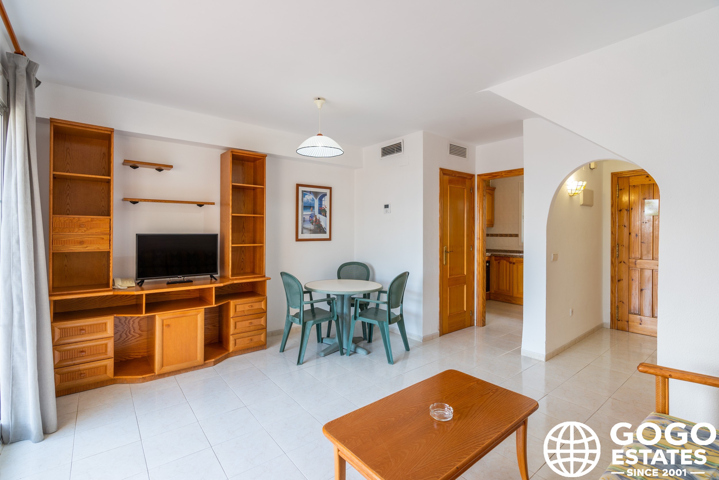 The apartment is part of a residential complex that provides access to landscaped common areas and a community pool. Additional features include air conditioning, built-in wardrobes, and ceramic flooring. The property is sold furnished and with appliances, ensuring a smooth transition to your new home.