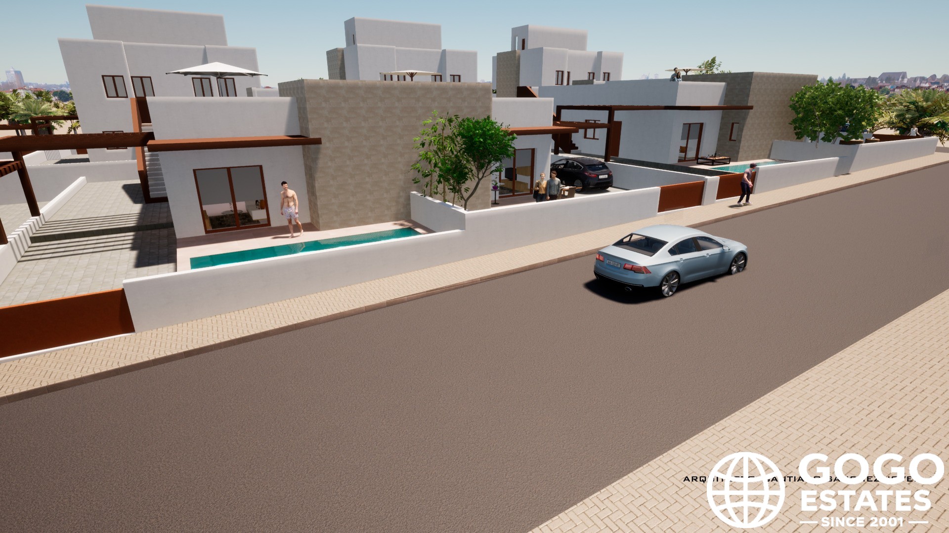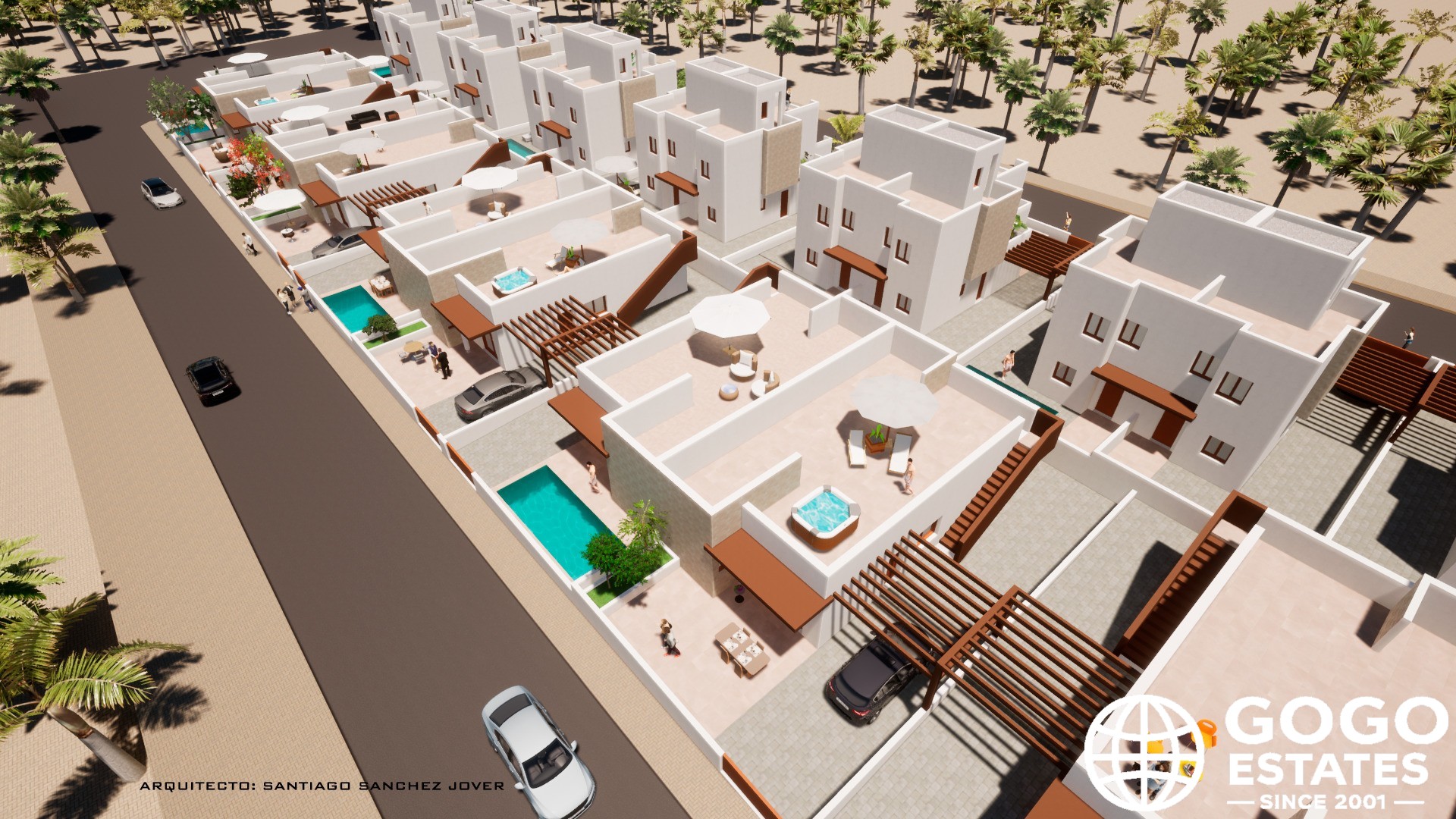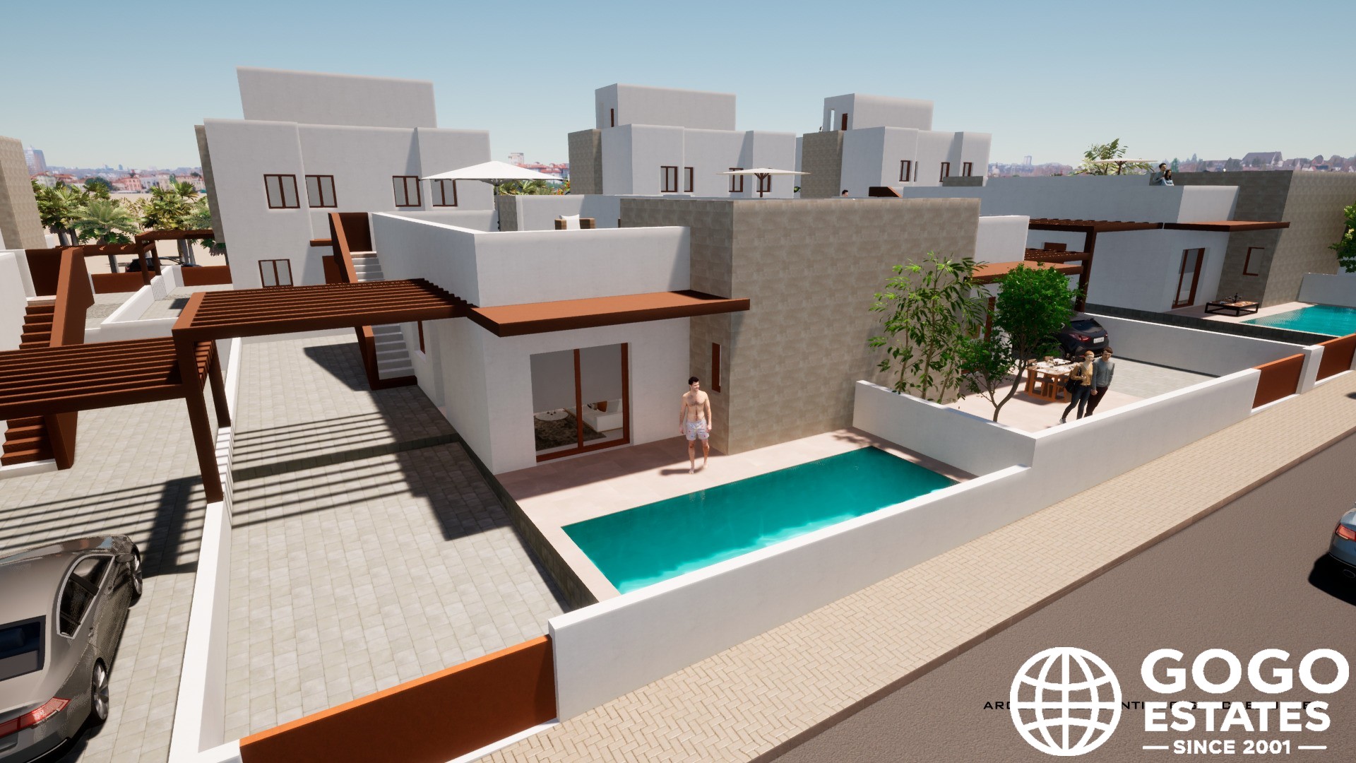 The interior of the townhouses is designed to offer comfort and functionality. Each home has three bedrooms and two bathrooms, providing adequate space for families. The built-in wardrobes in the bedrooms optimize storage, while the pre-installation of air conditioning ensures a pleasant environment throughout the year. The porcelain tile flooring adds a touch of elegance and facilitates maintenance.