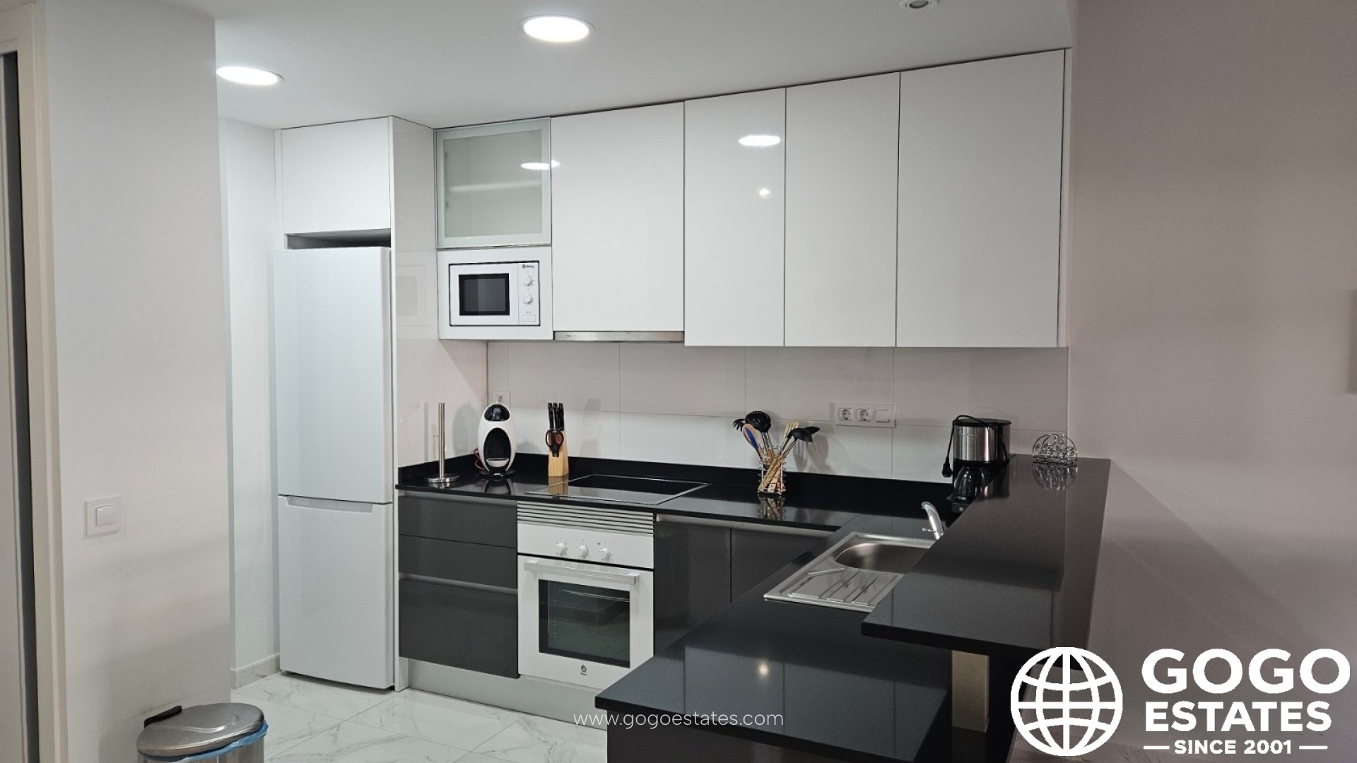 The living room offers air conditioning and a television, providing a cozy space for relaxation. The open kitchen is equipped with modern appliances such as a ceramic hob, electric oven, microwave, and dishwasher.