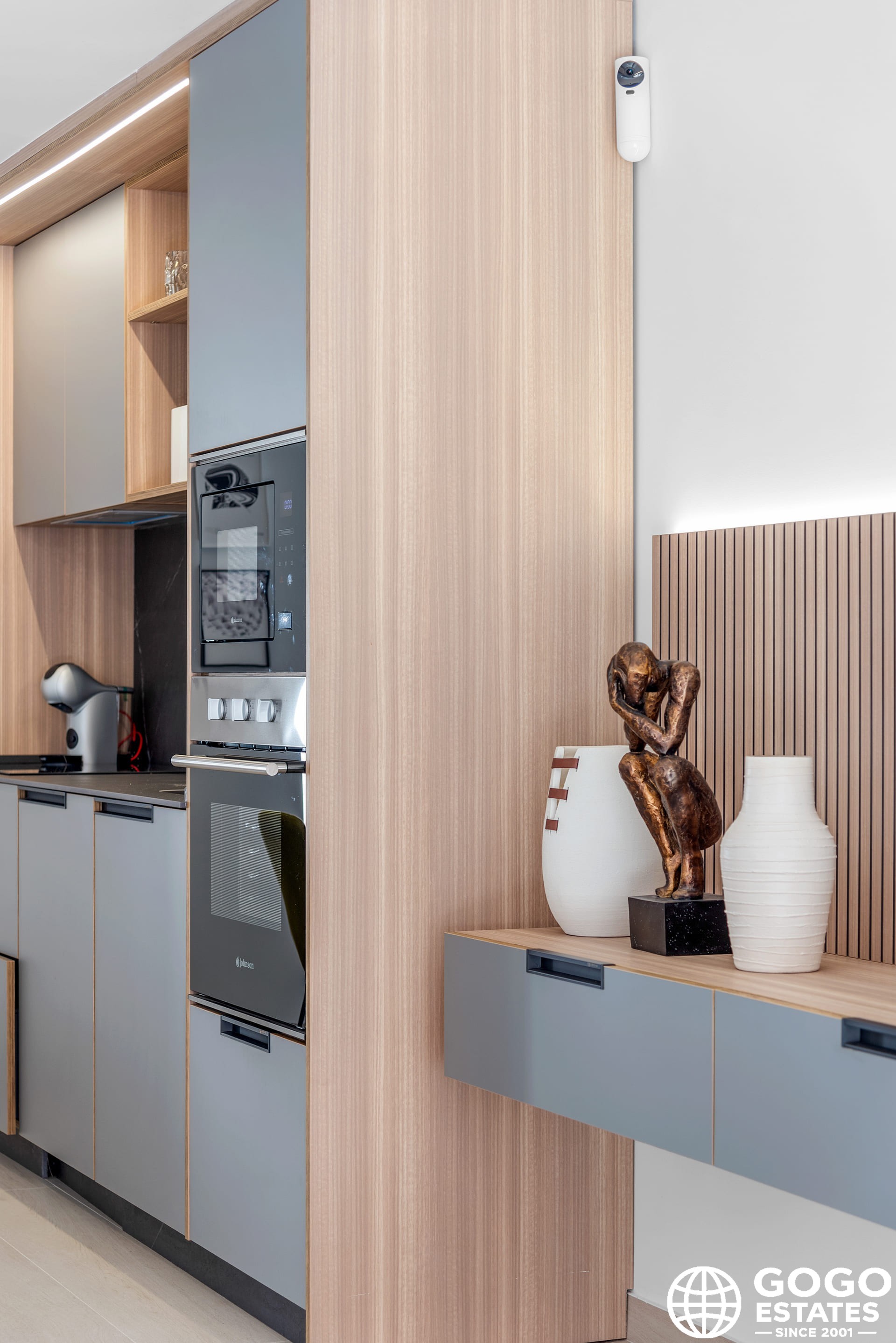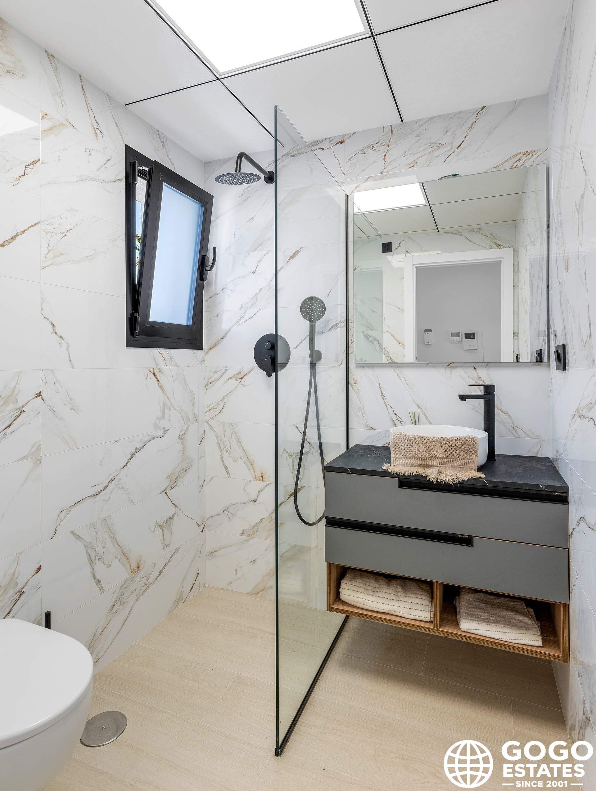 The property boasts a private garden and a 22 m² terrace, perfect for enjoying the Mediterranean climate. Inside, the home is furnished with high-quality fittings, including porcelain tile floors and built-in wardrobes. Modern amenities such as air conditioning, electric shutters, and a video intercom ensure comfort and convenience.